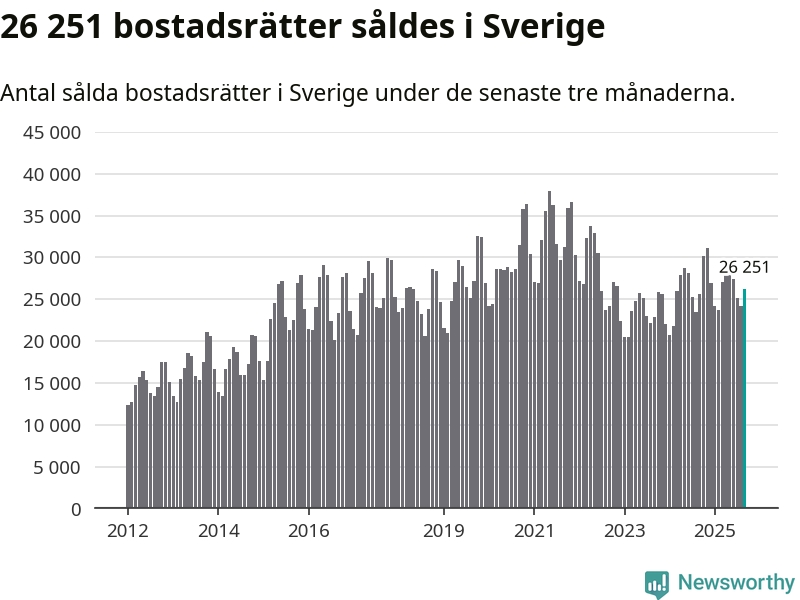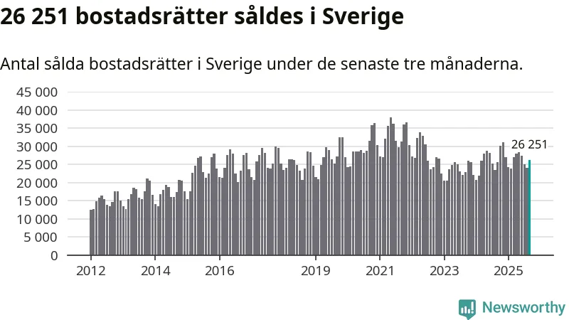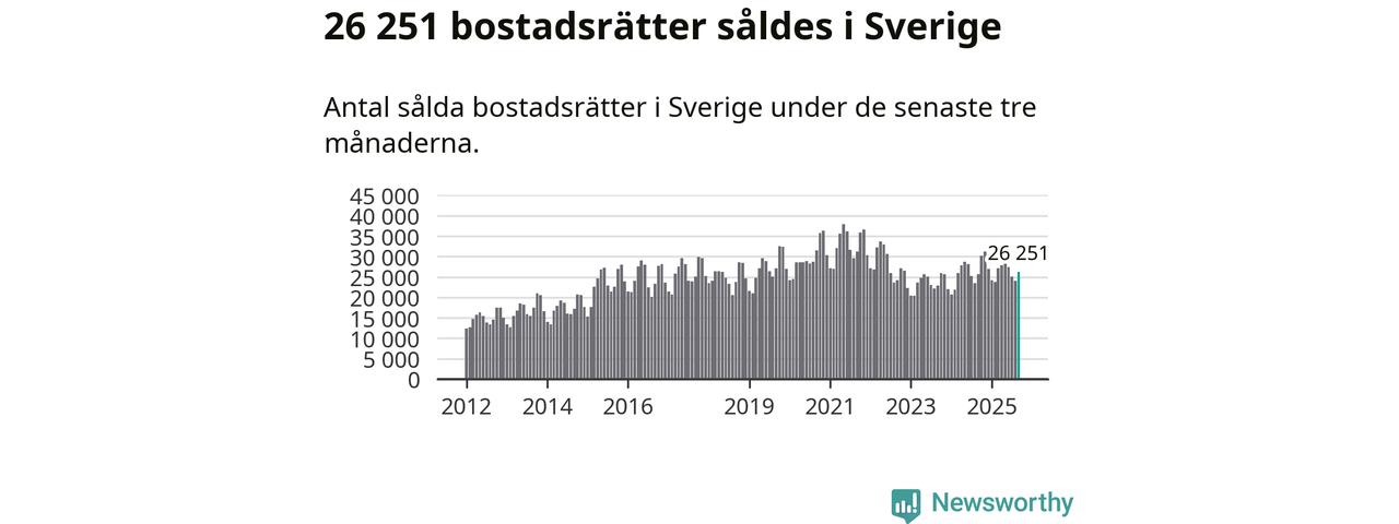 Sammanlagt såldes 26 251 bostadsrätter i Sverige mellan juli och september till ett genomsnittligt pris på 2,9 miljoner kronor. I fjol gjordes 25 666 affärer vid den här tiden på året.
