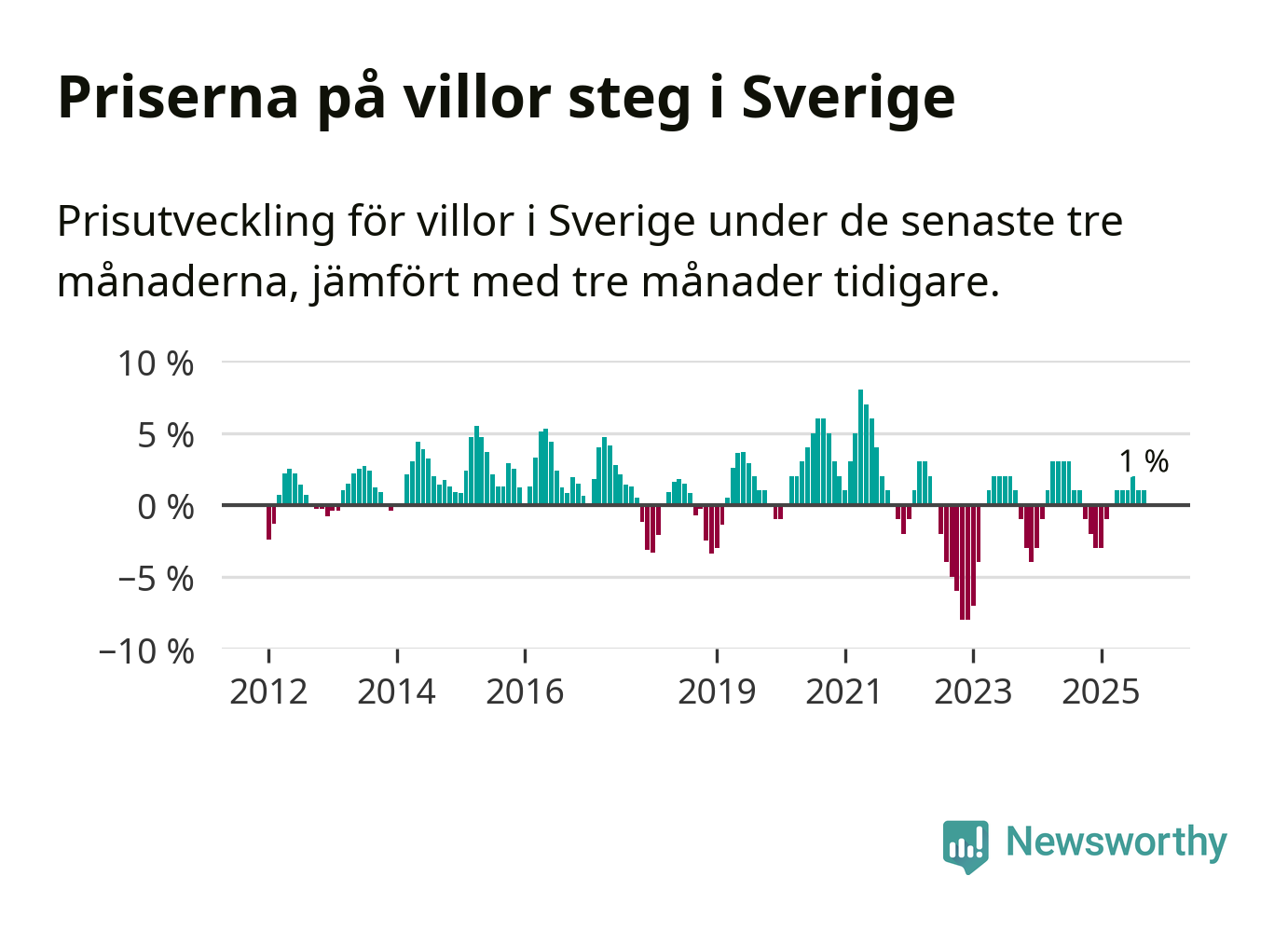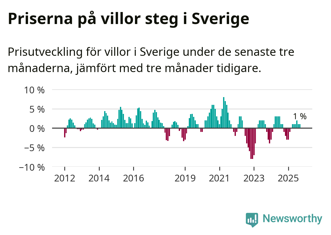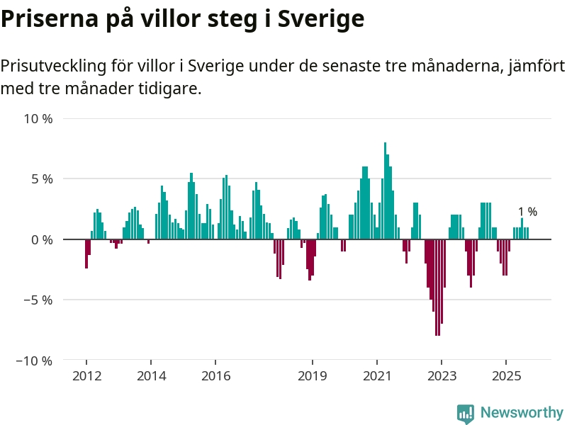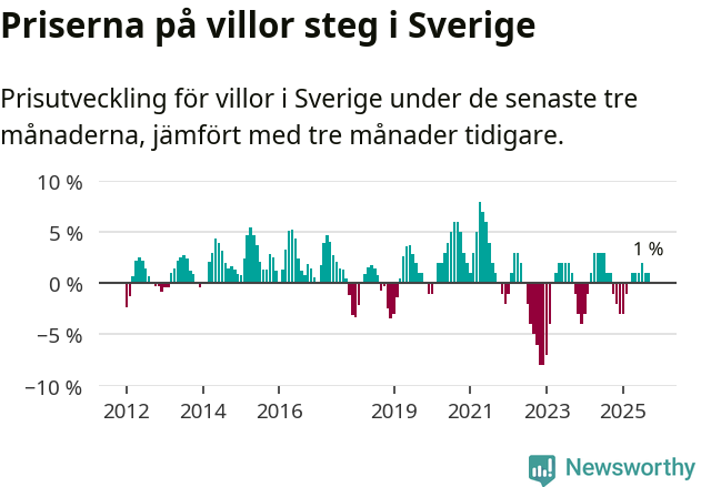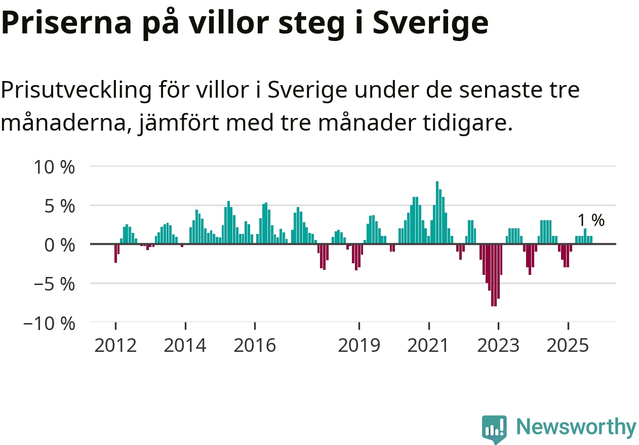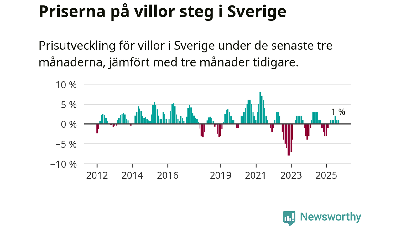 Villapriserna har gått upp i Sverige. Medelpriset på försäljningarna under de senaste tre månaderna visar på en uppgång med 1 procent.
