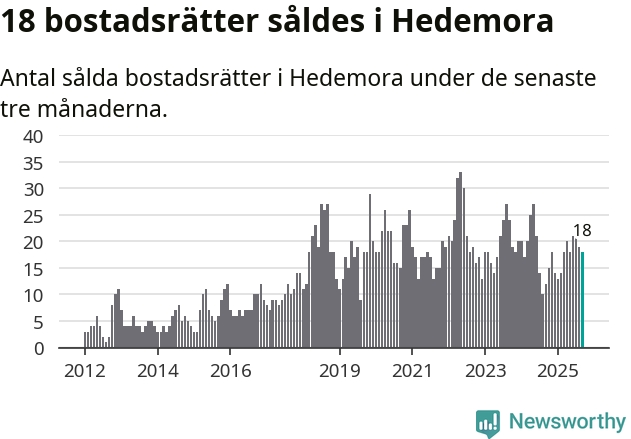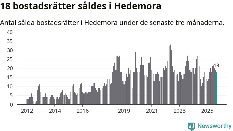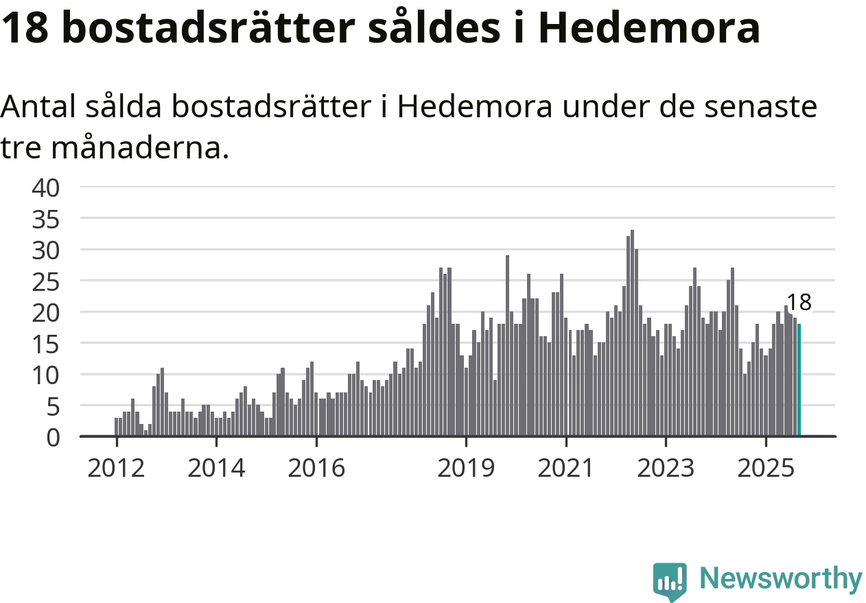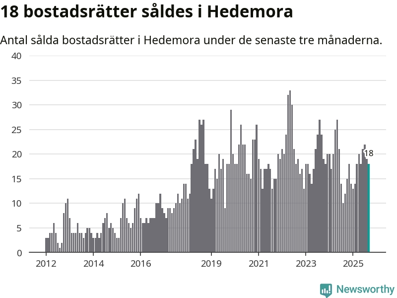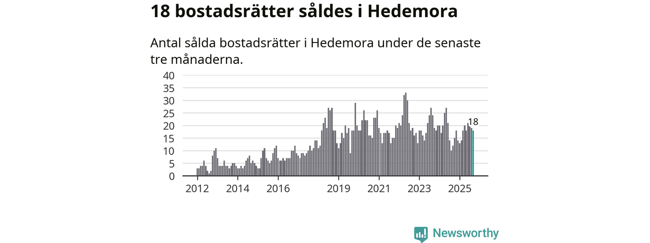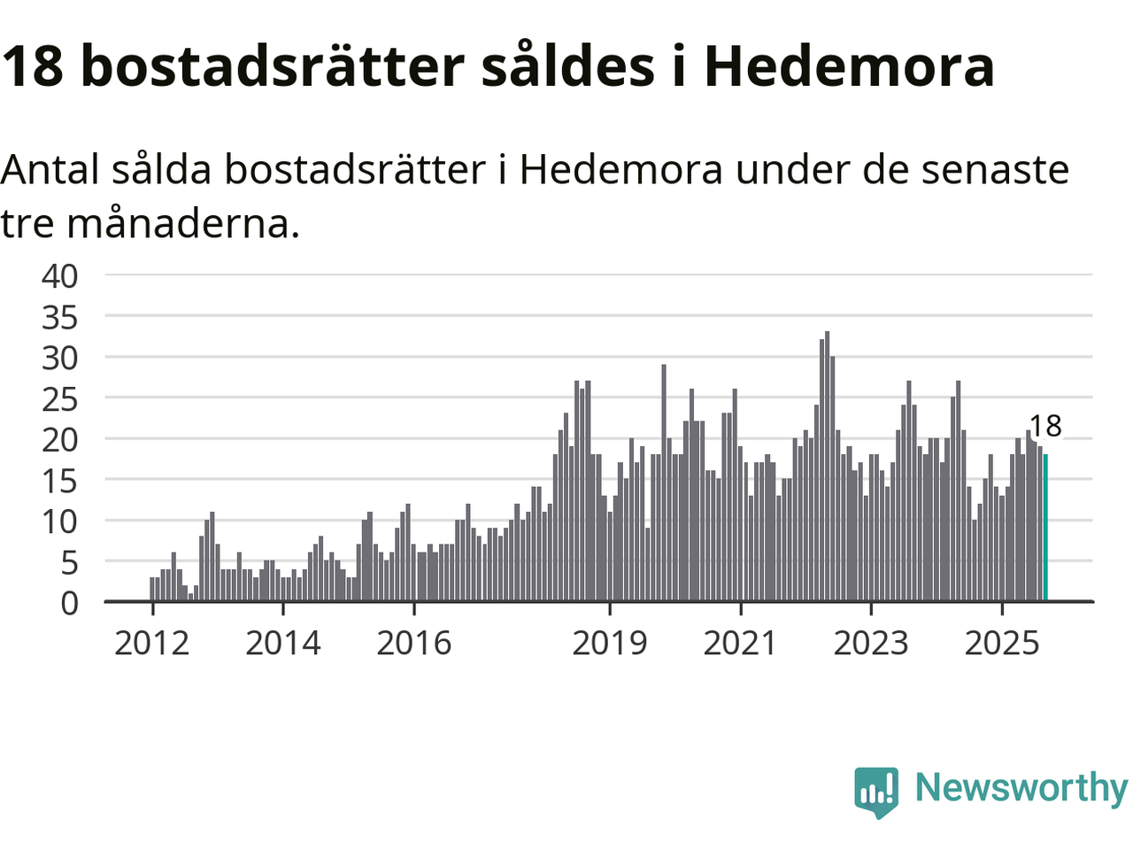 Mellan juli och september gjordes sammanlagt 18 affärer med bostadsrätter i Hedemora kommun. Det kan jämföras med tolv vid motsvarande tid i fjol.