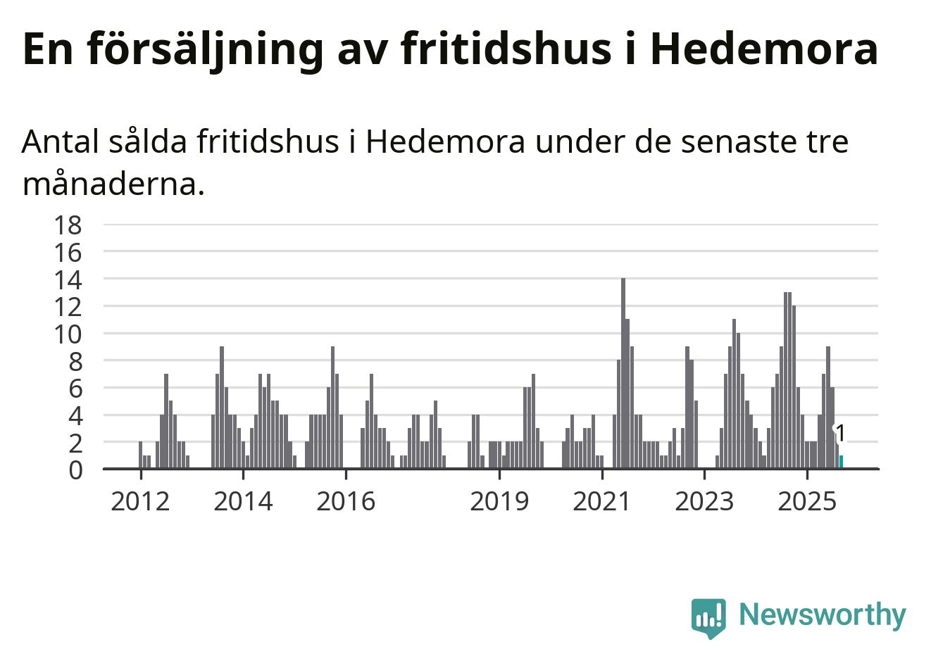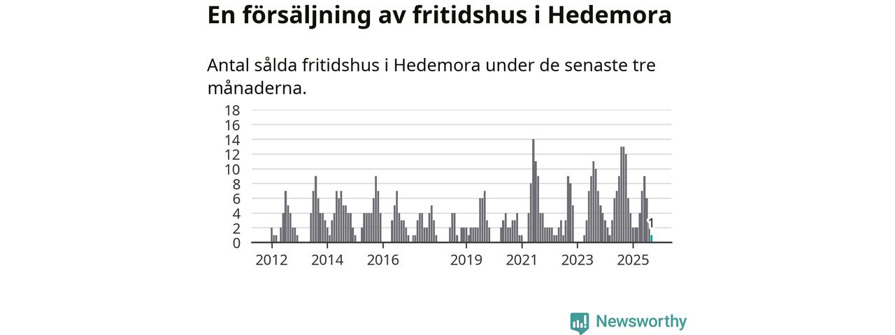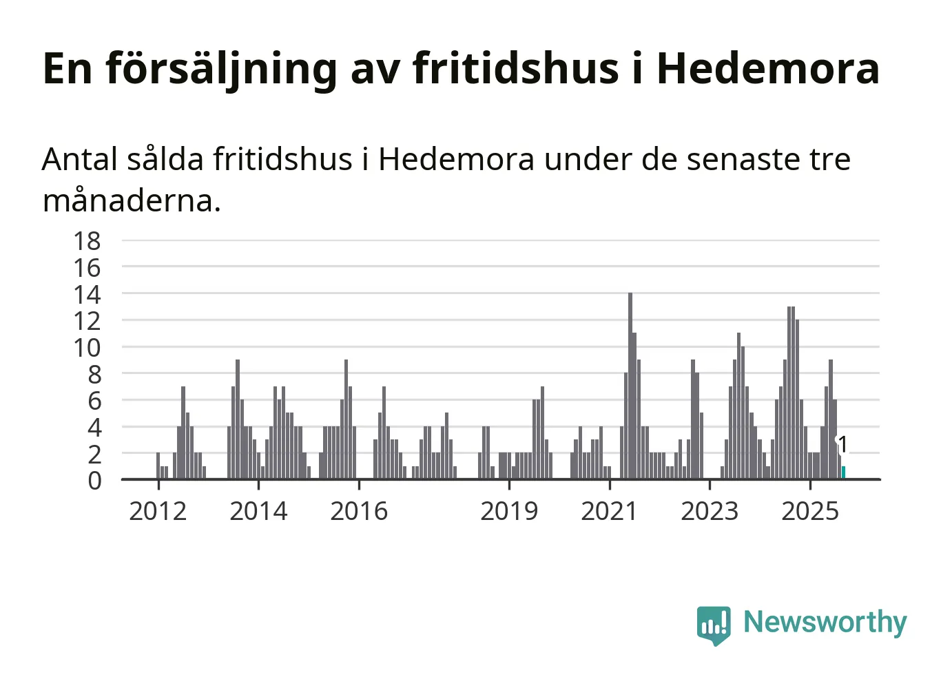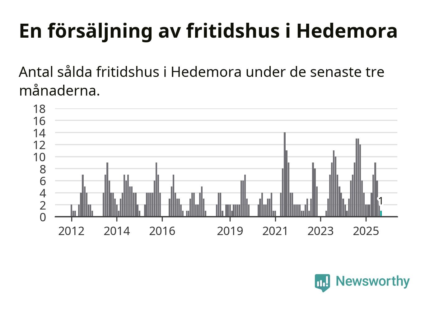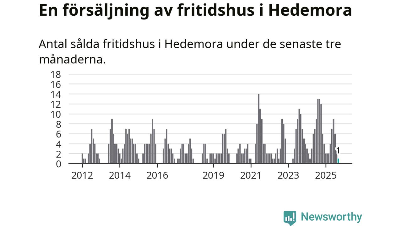 Mellan juli och september gjordes sammanlagt en affär med fritidshus i Hedemora kommun. Det kan jämföras med 13 vid motsvarande tid i fjol.