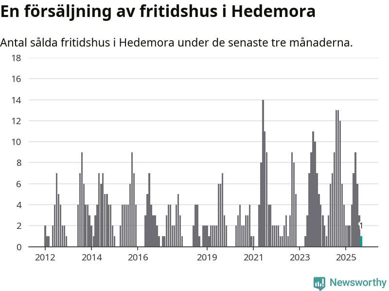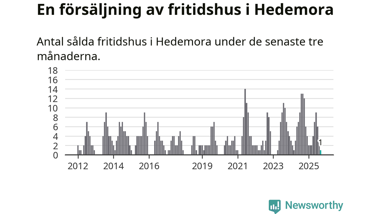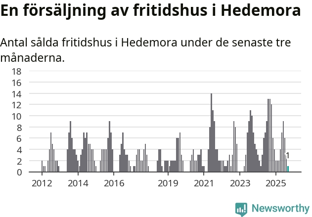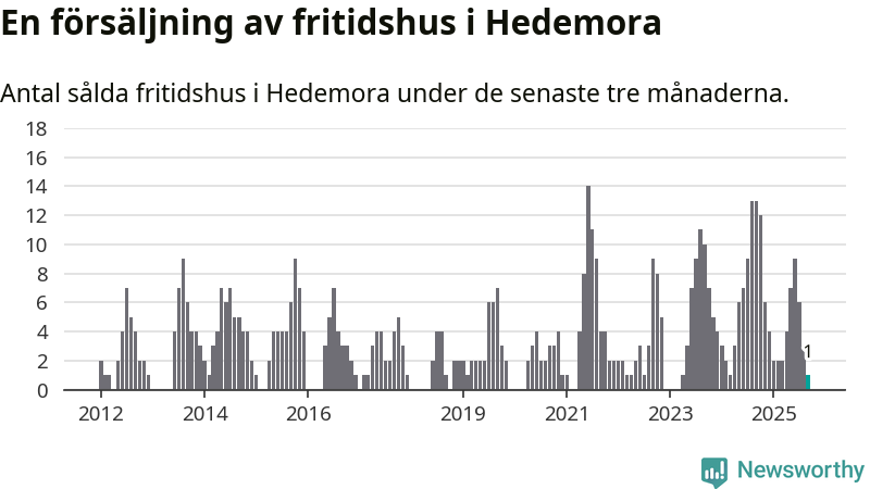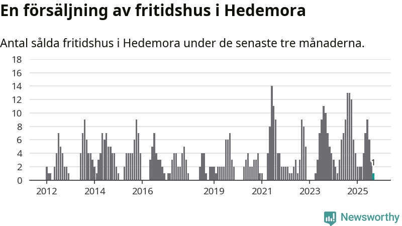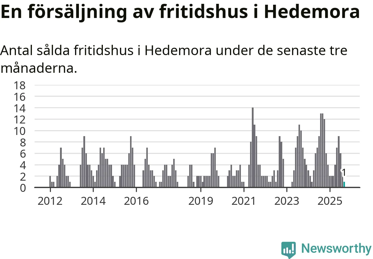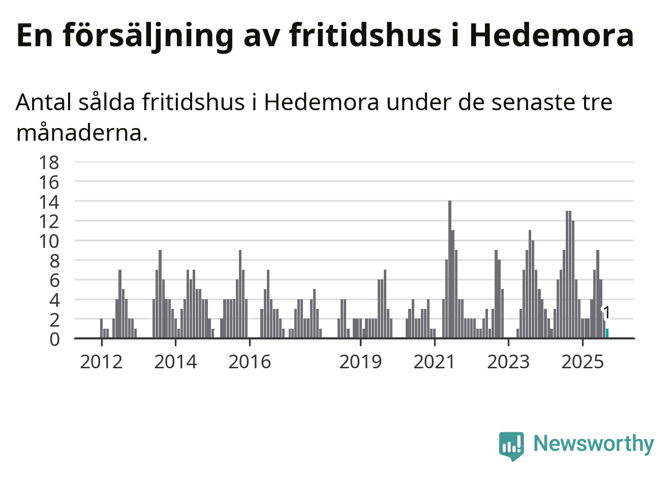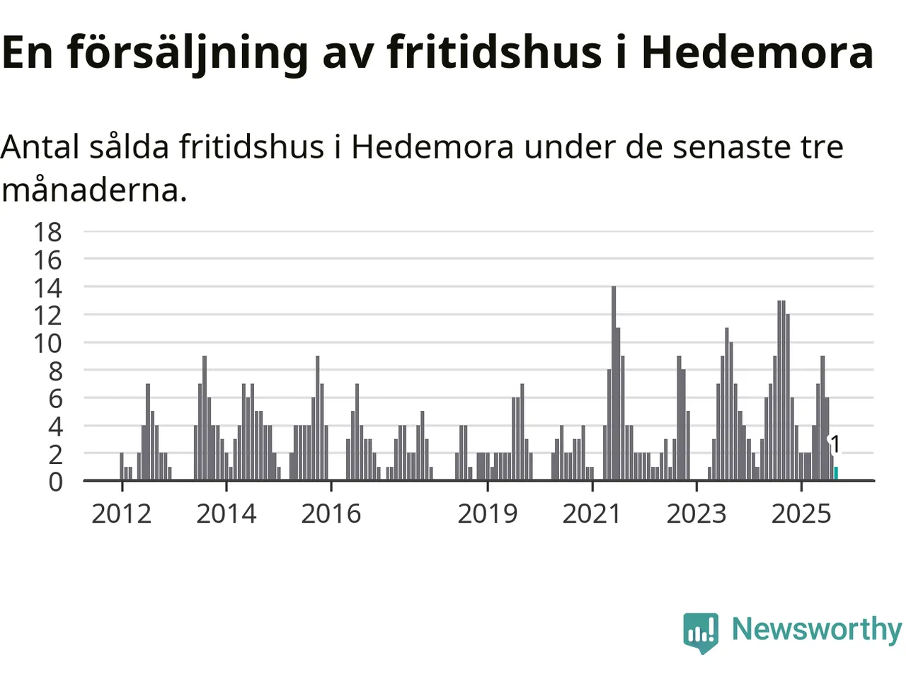 Mellan juli och september gjordes sammanlagt en affär med fritidshus i Hedemora kommun. Det kan jämföras med 13 vid motsvarande tid i fjol.