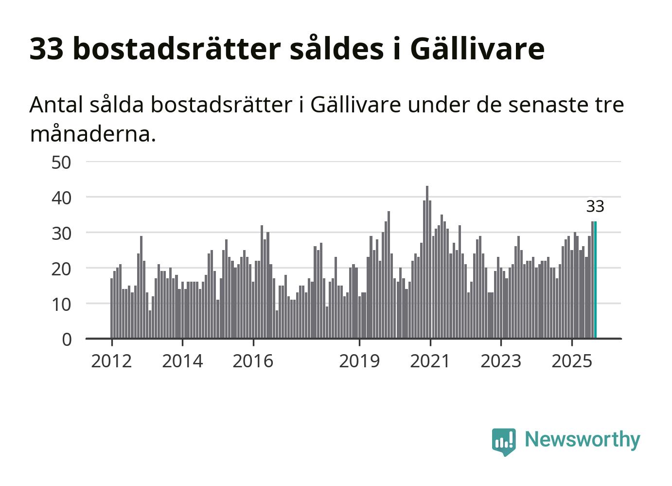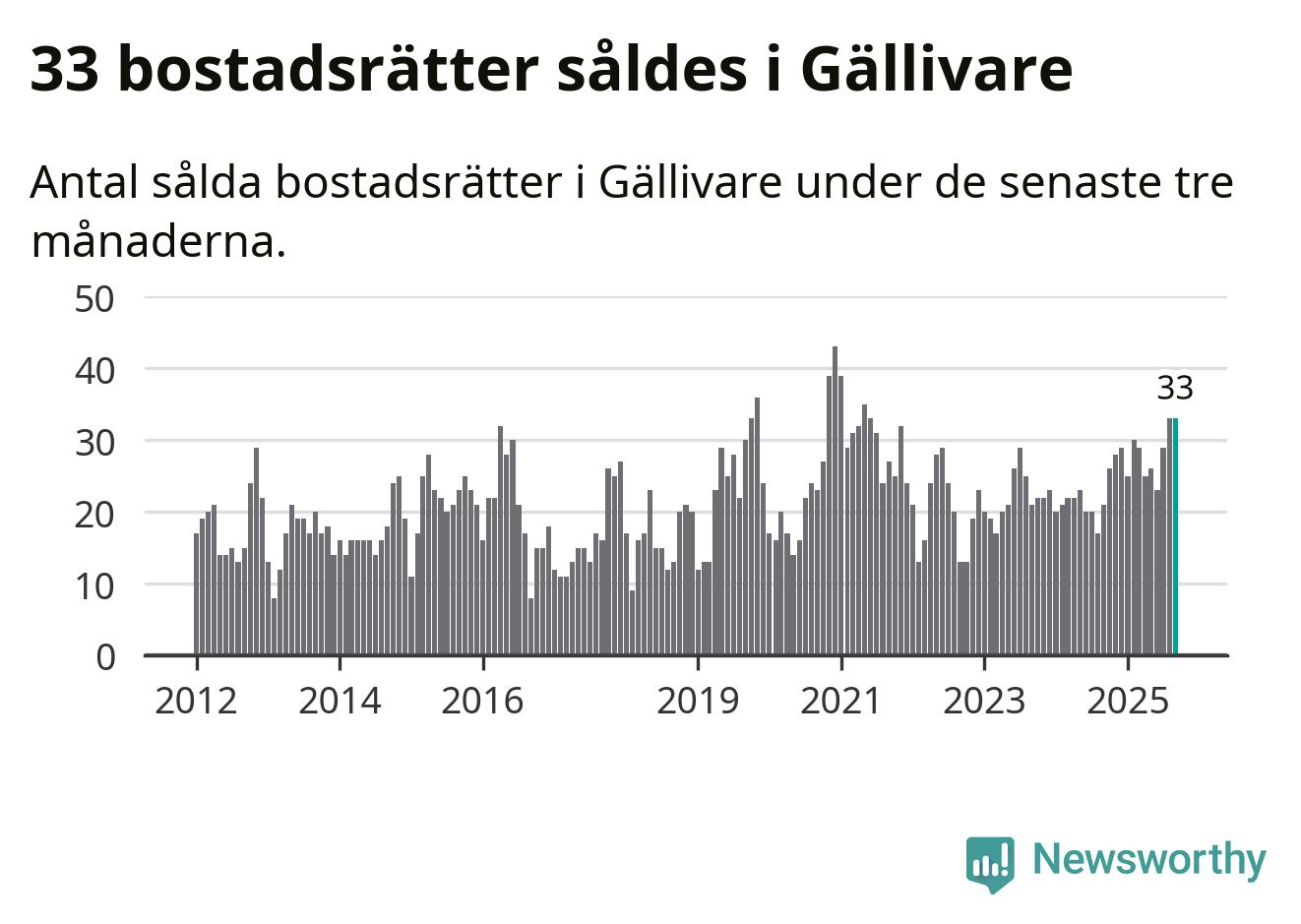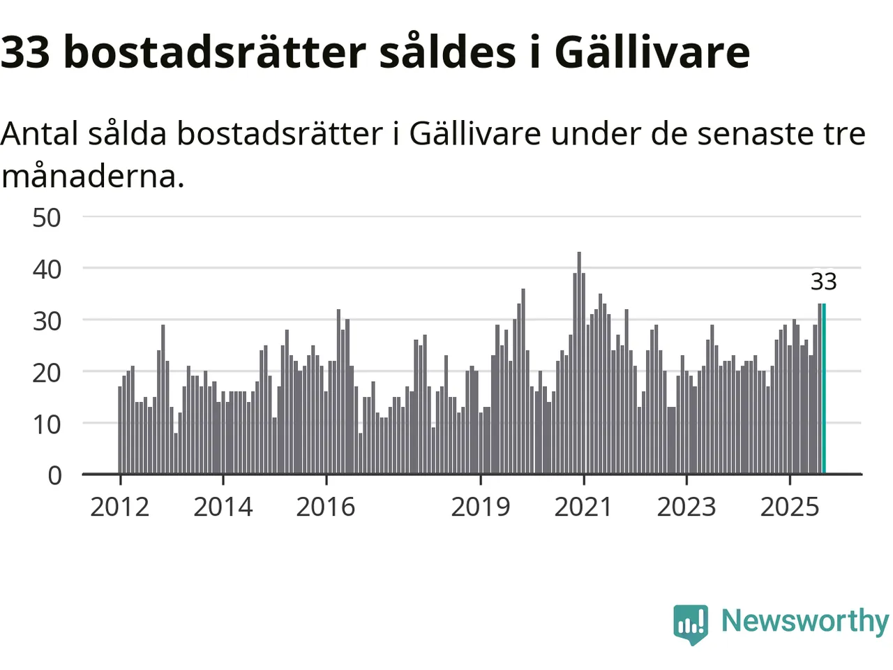 Mellan juli och september gjordes sammanlagt 33 affärer med bostadsrätter i Gällivare kommun. Det kan jämföras med 21 vid motsvarande tid i fjol.
