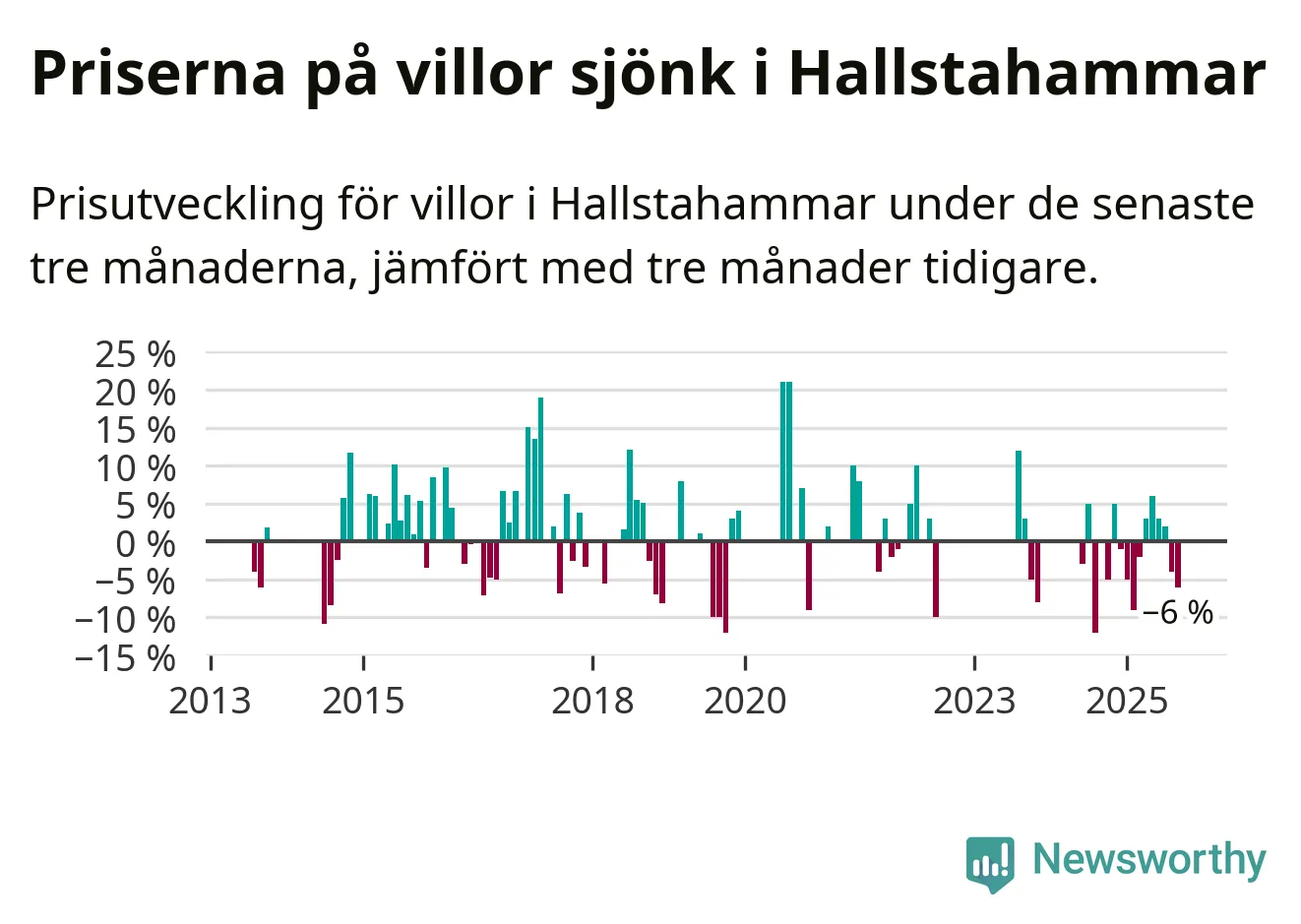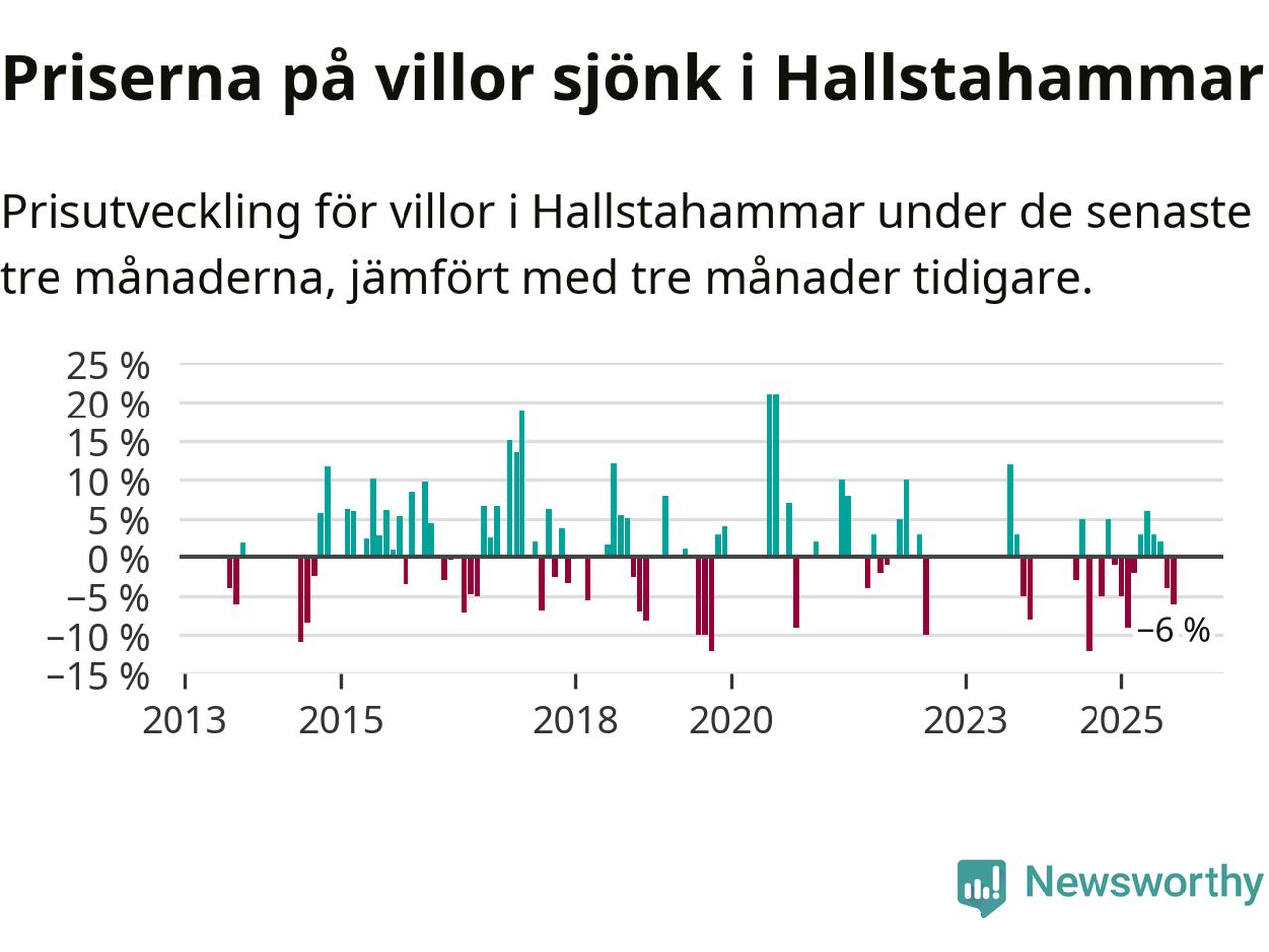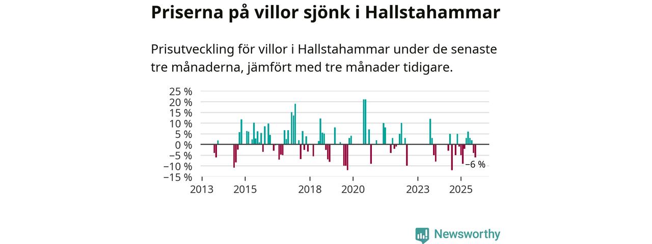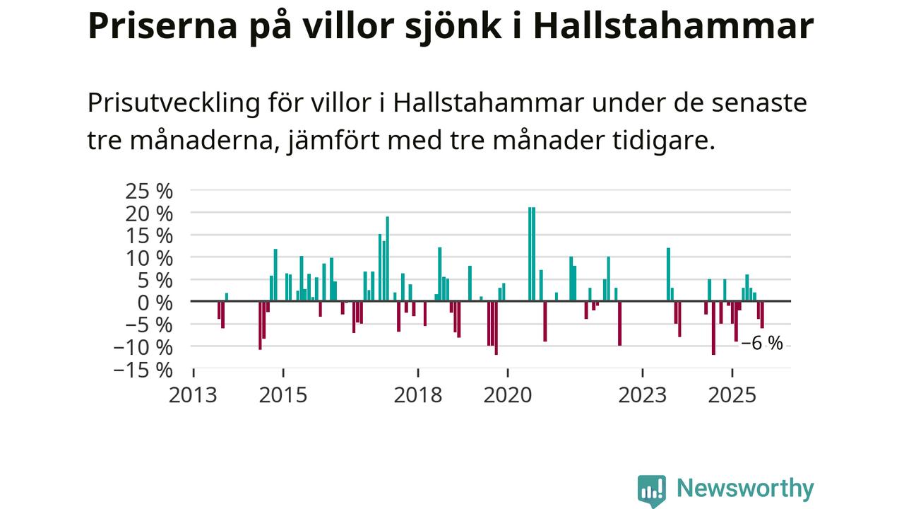 Statistiken visar även på en kännbar prisnedgång i Hallstahammars kommun. Medelpriset på försäljningarna av villor i kommunen var 6 procent lägre än för tre månader sedan. Även i hela Västmanland sjunker villapriserna. I hela länet noterades en prisnedgång på 1 procent.