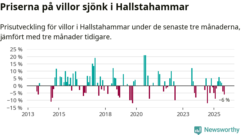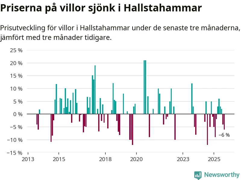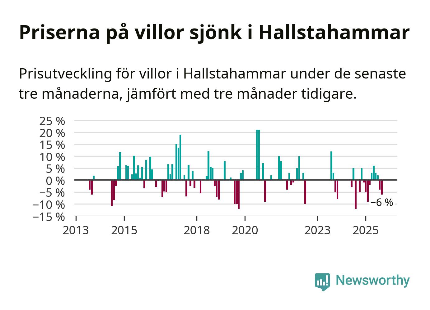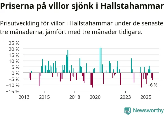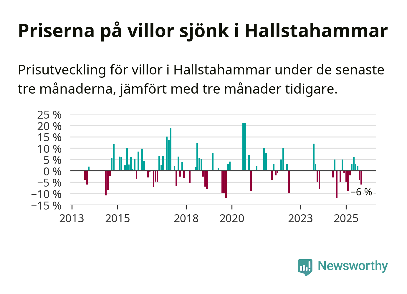 Statistiken visar även på en kännbar prisnedgång i Hallstahammars kommun. Medelpriset på försäljningarna av villor i kommunen var 6 procent lägre än för tre månader sedan. Även i hela Västmanland sjunker villapriserna. I hela länet noterades en prisnedgång på 1 procent.