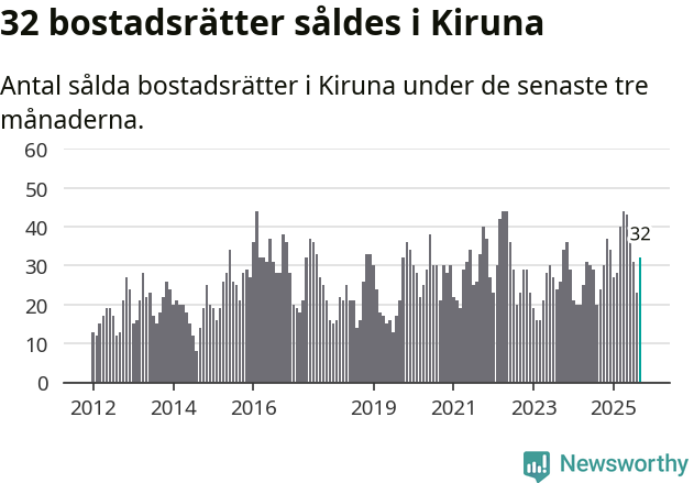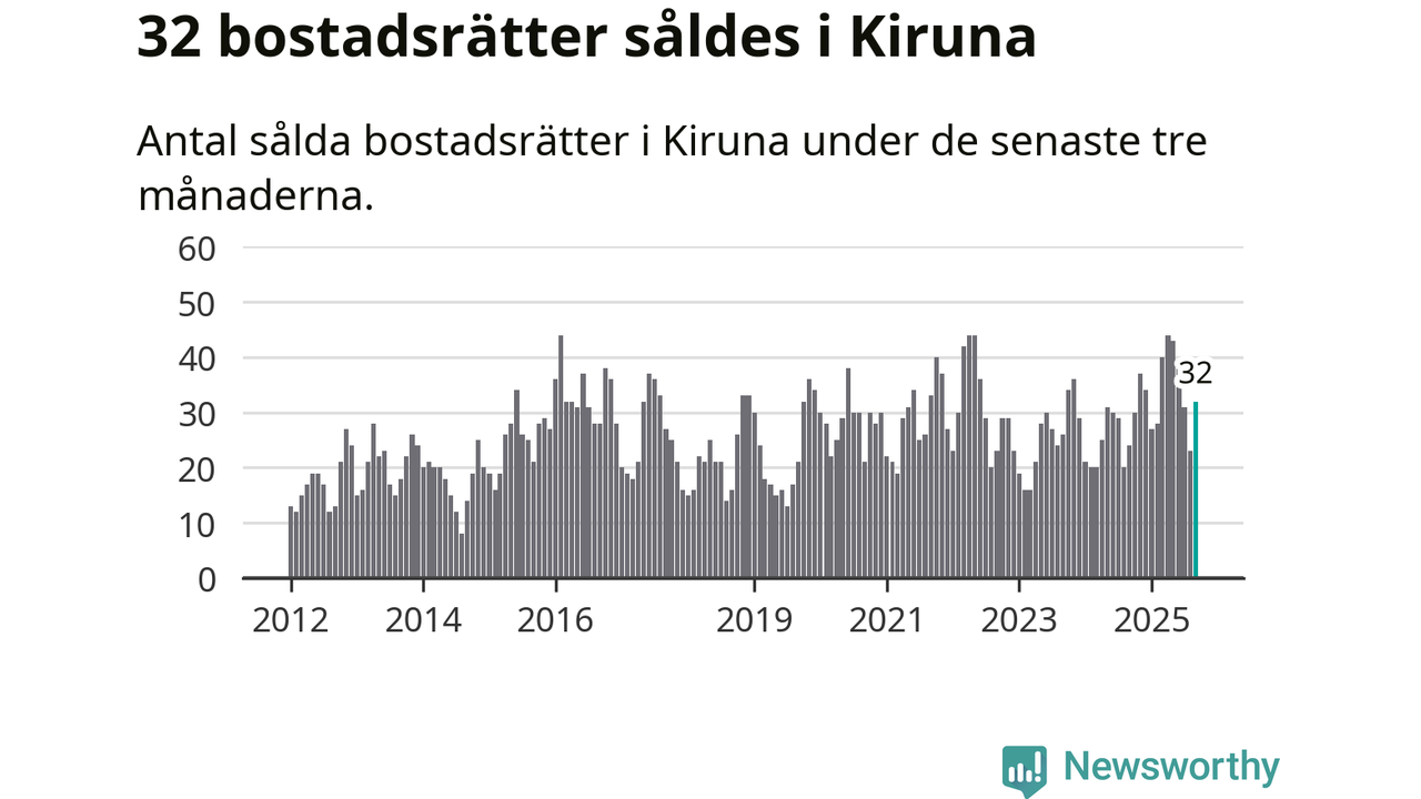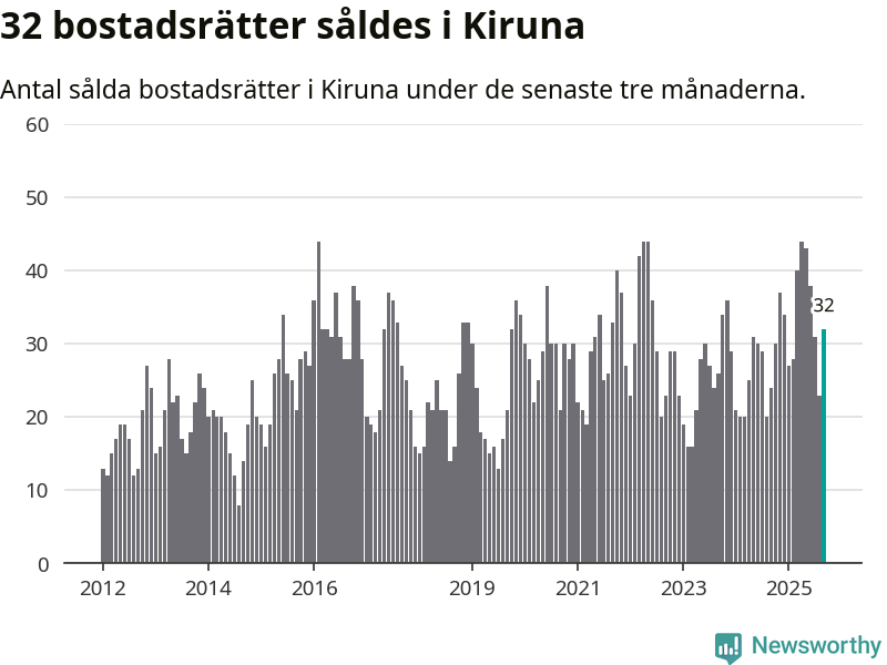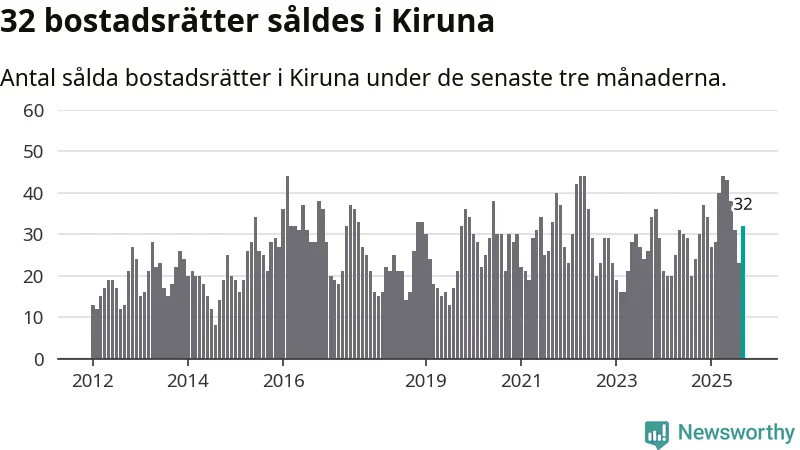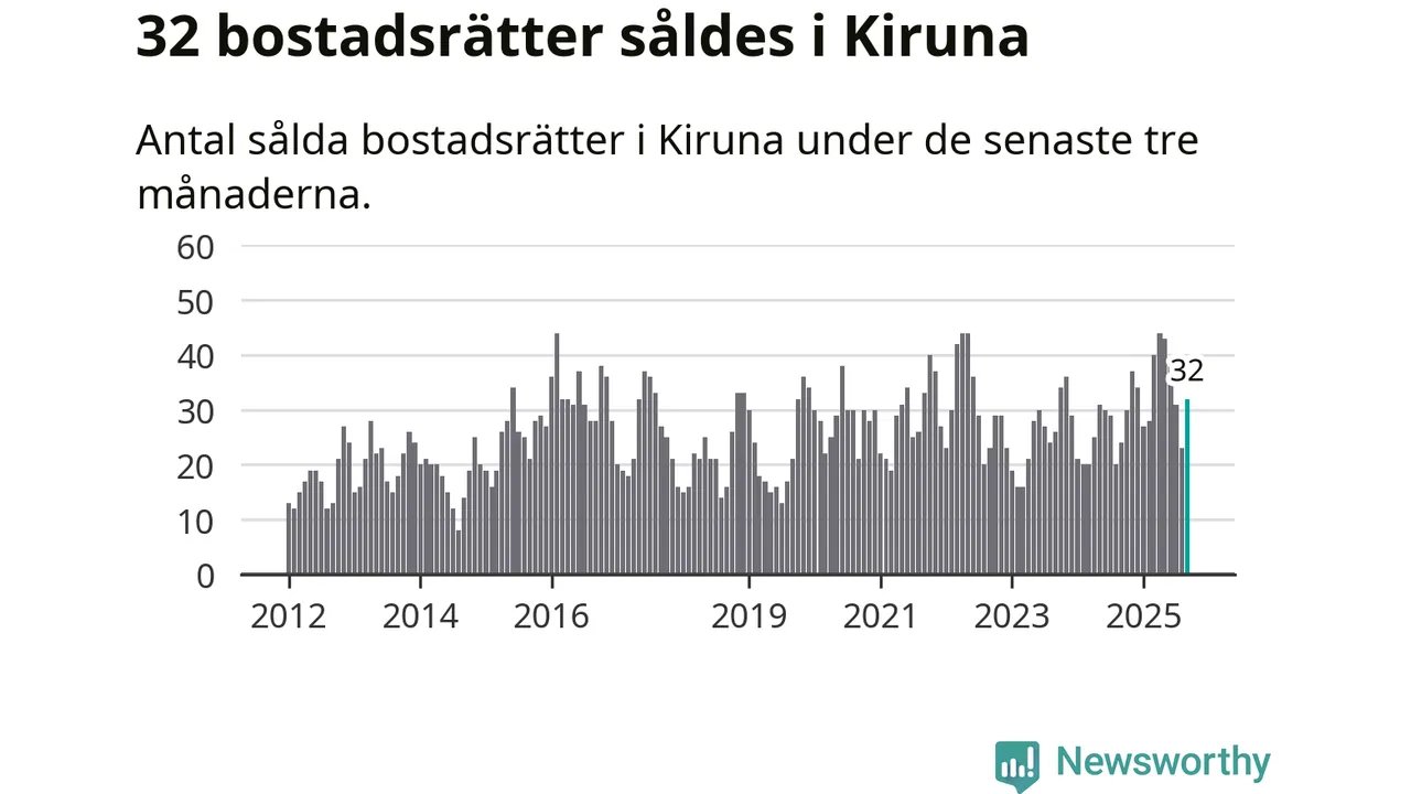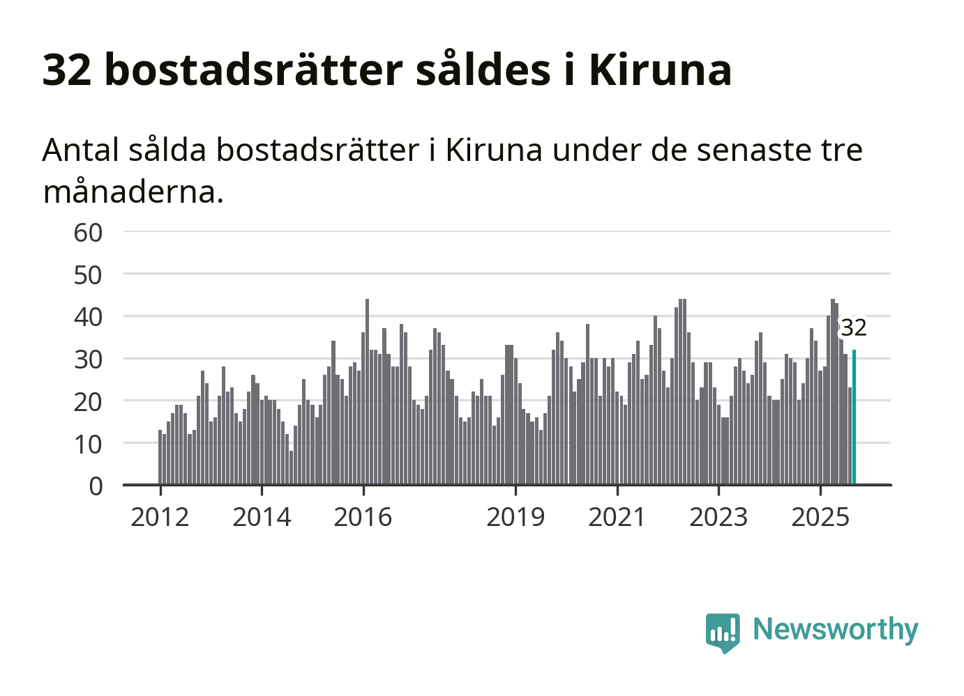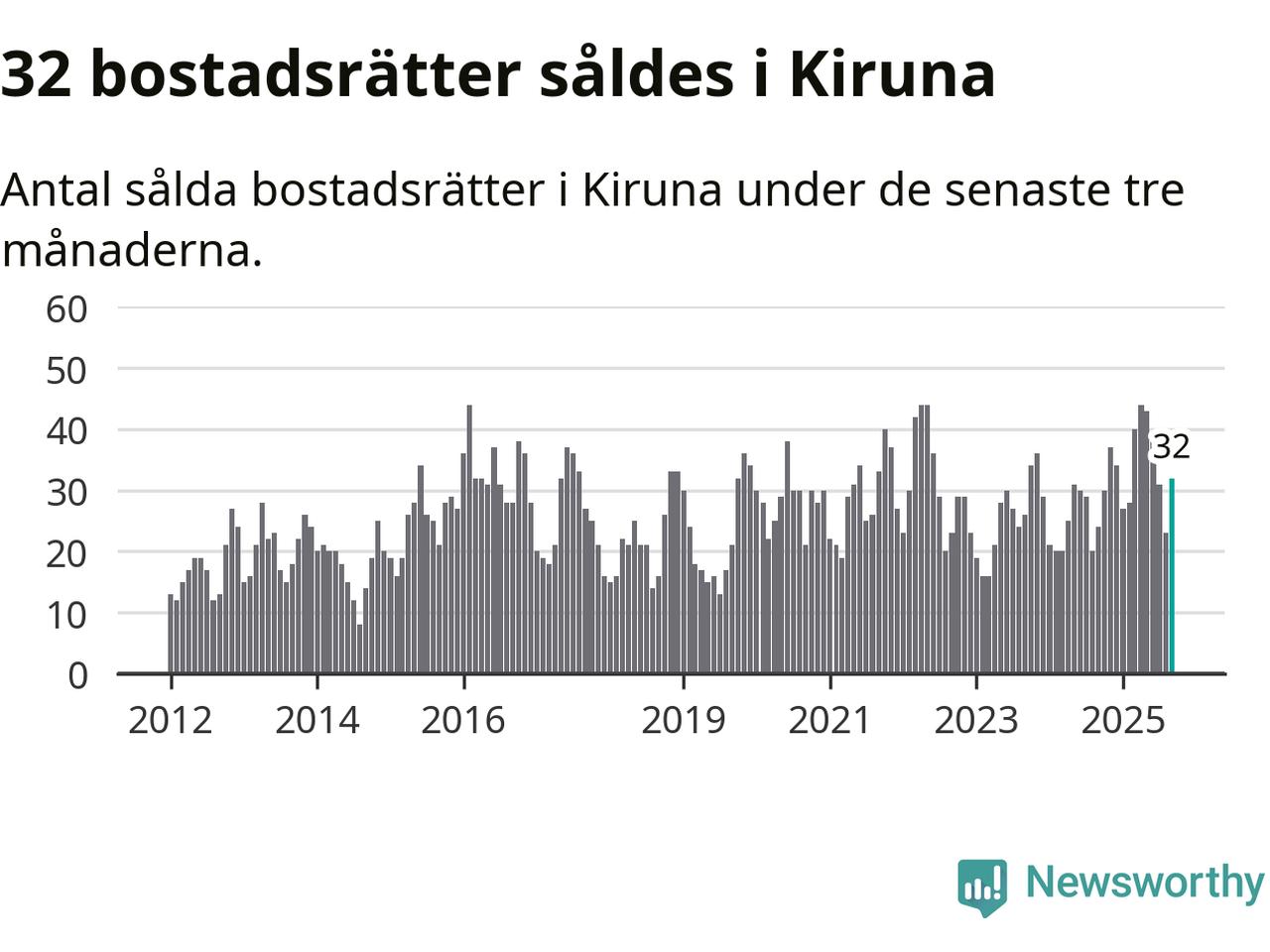 Mellan juli och september gjordes sammanlagt 32 affärer med bostadsrätter i Kiruna kommun. Det kan jämföras med 24 vid motsvarande tid i fjol.