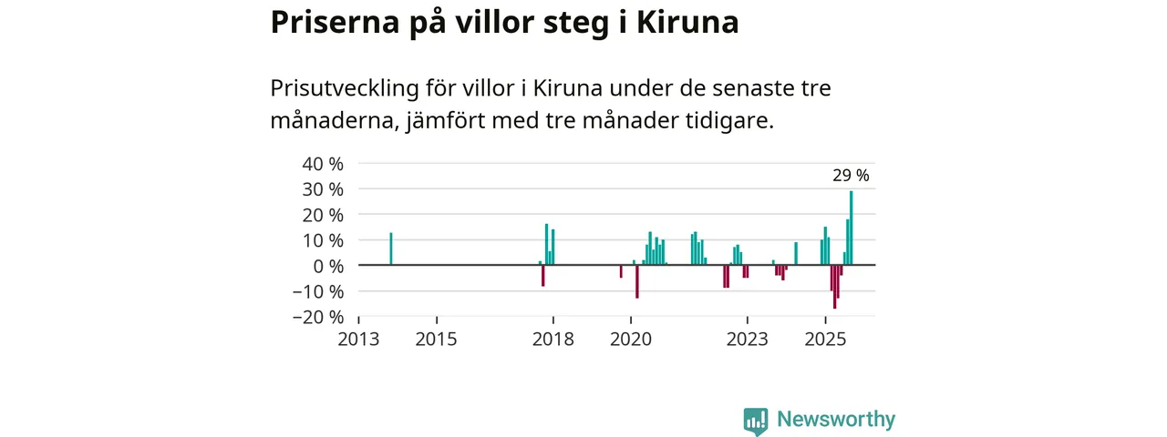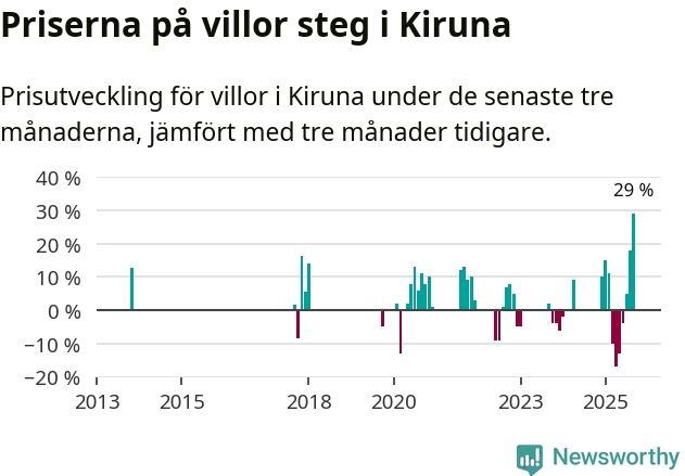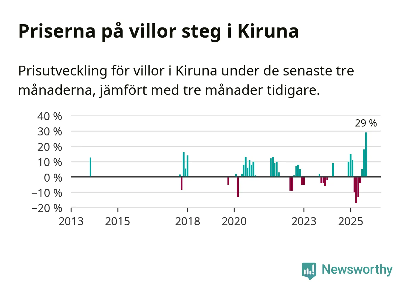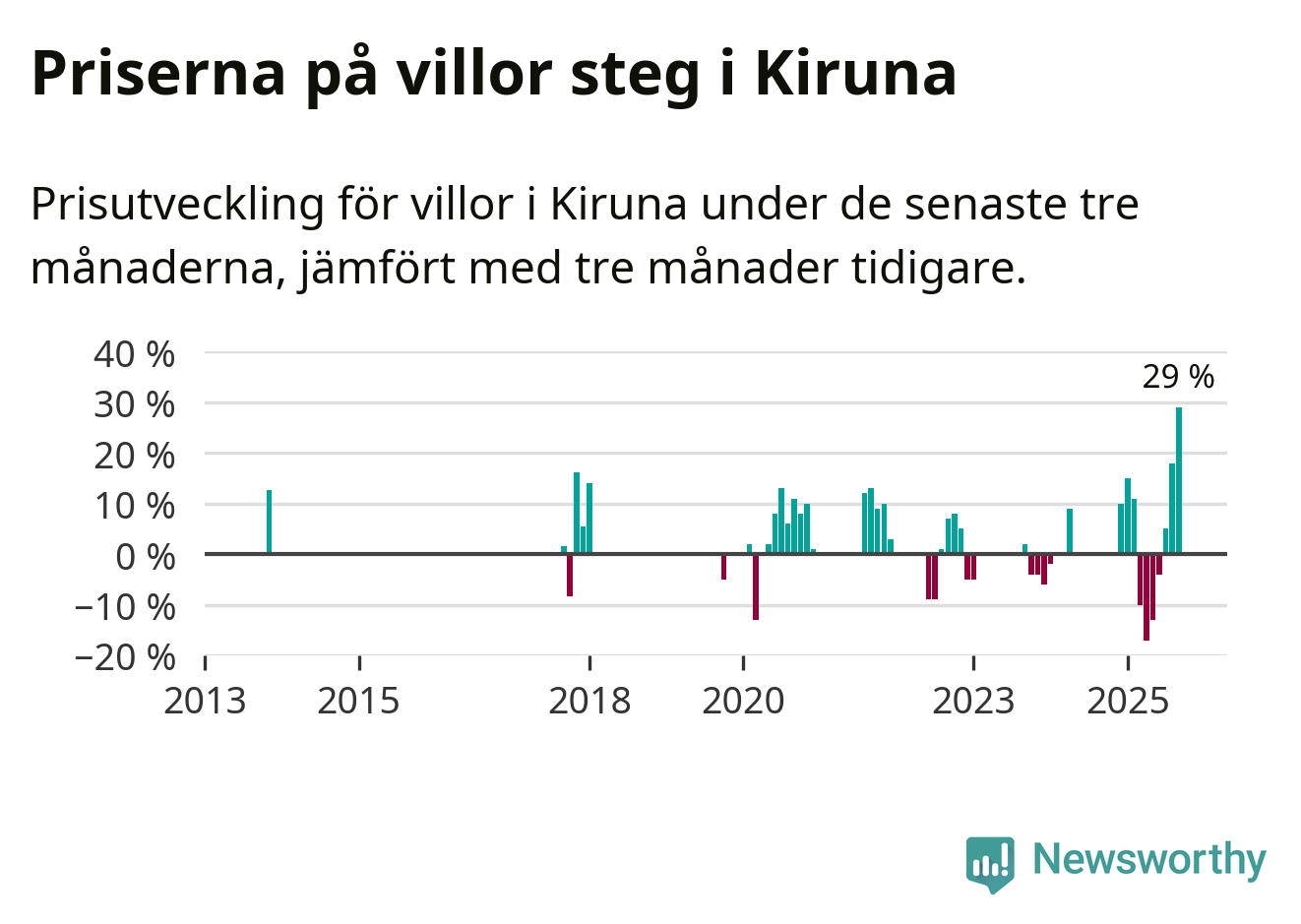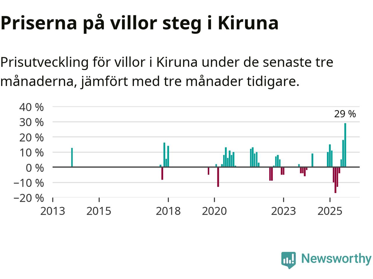 Statistiken visar även på en stor prisuppgång i Kiruna kommun. Medelpriset på försäljningarna av villor i kommunen var 29 procent högre än för tre månader sedan. Även i hela Norrbotten ökar villapriserna. I hela länet noterades en prisuppgång på 4 procent.