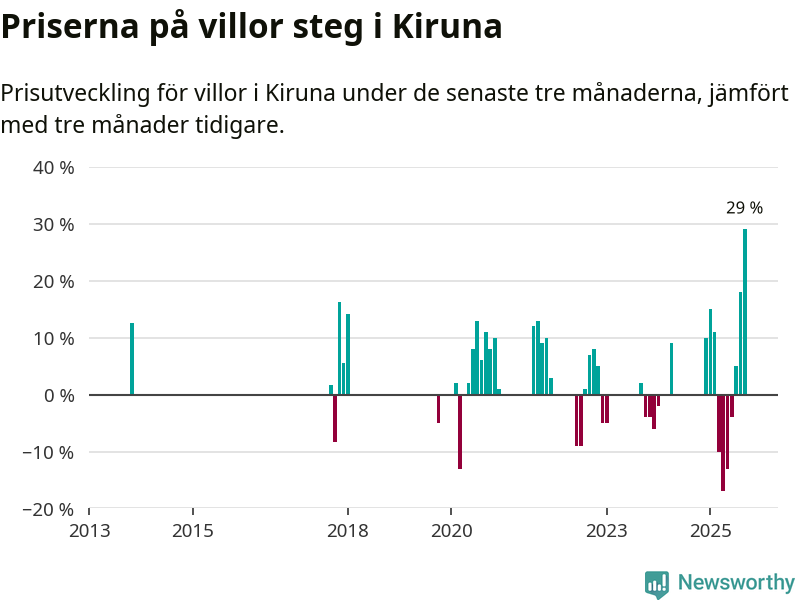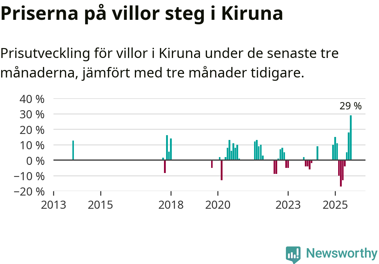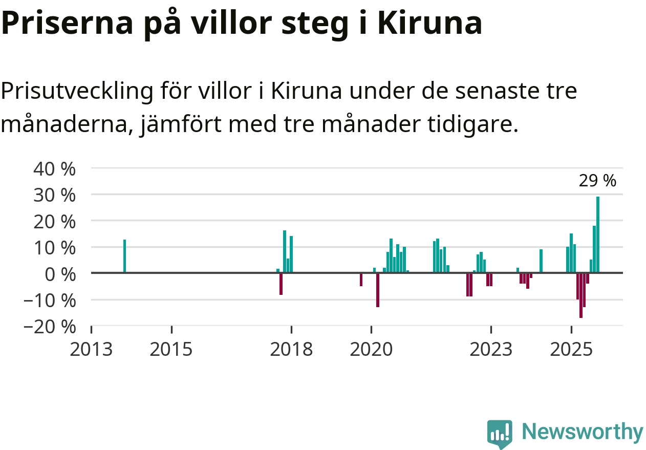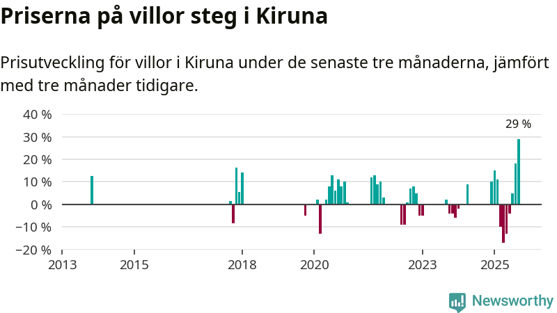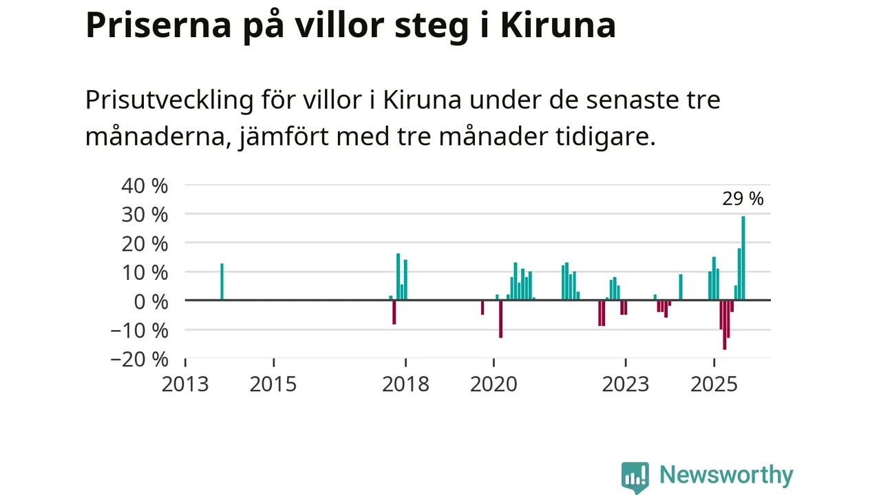 Statistiken visar även på en stor prisuppgång i Kiruna kommun. Medelpriset på försäljningarna av villor i kommunen var 29 procent högre än för tre månader sedan. Även i hela Norrbotten ökar villapriserna. I hela länet noterades en prisuppgång på 4 procent.