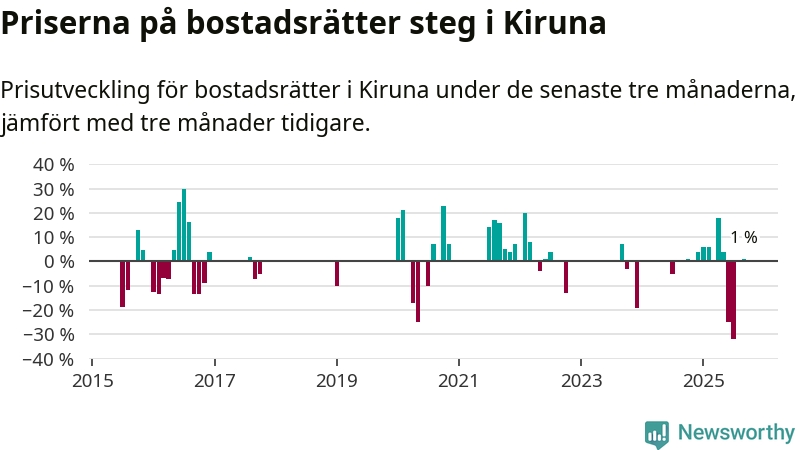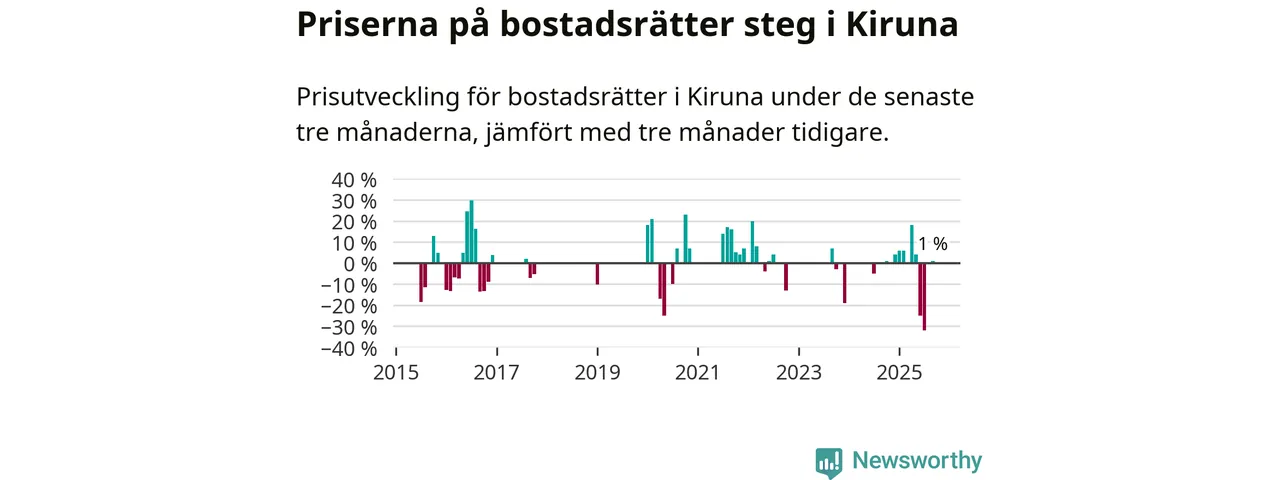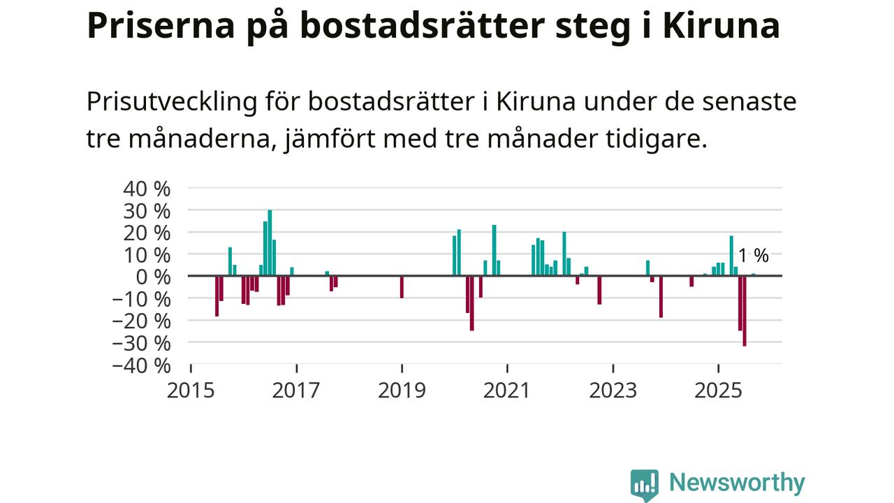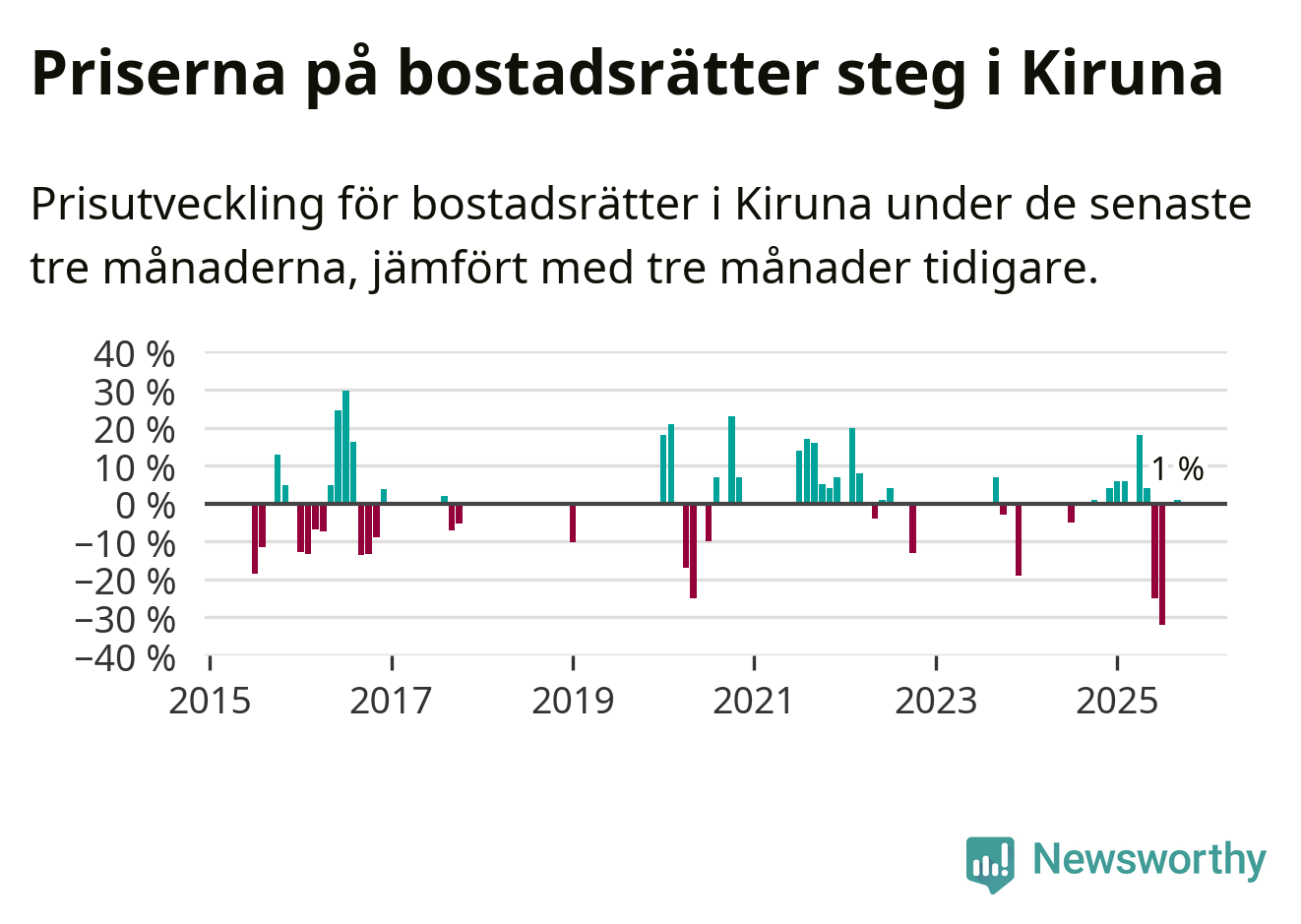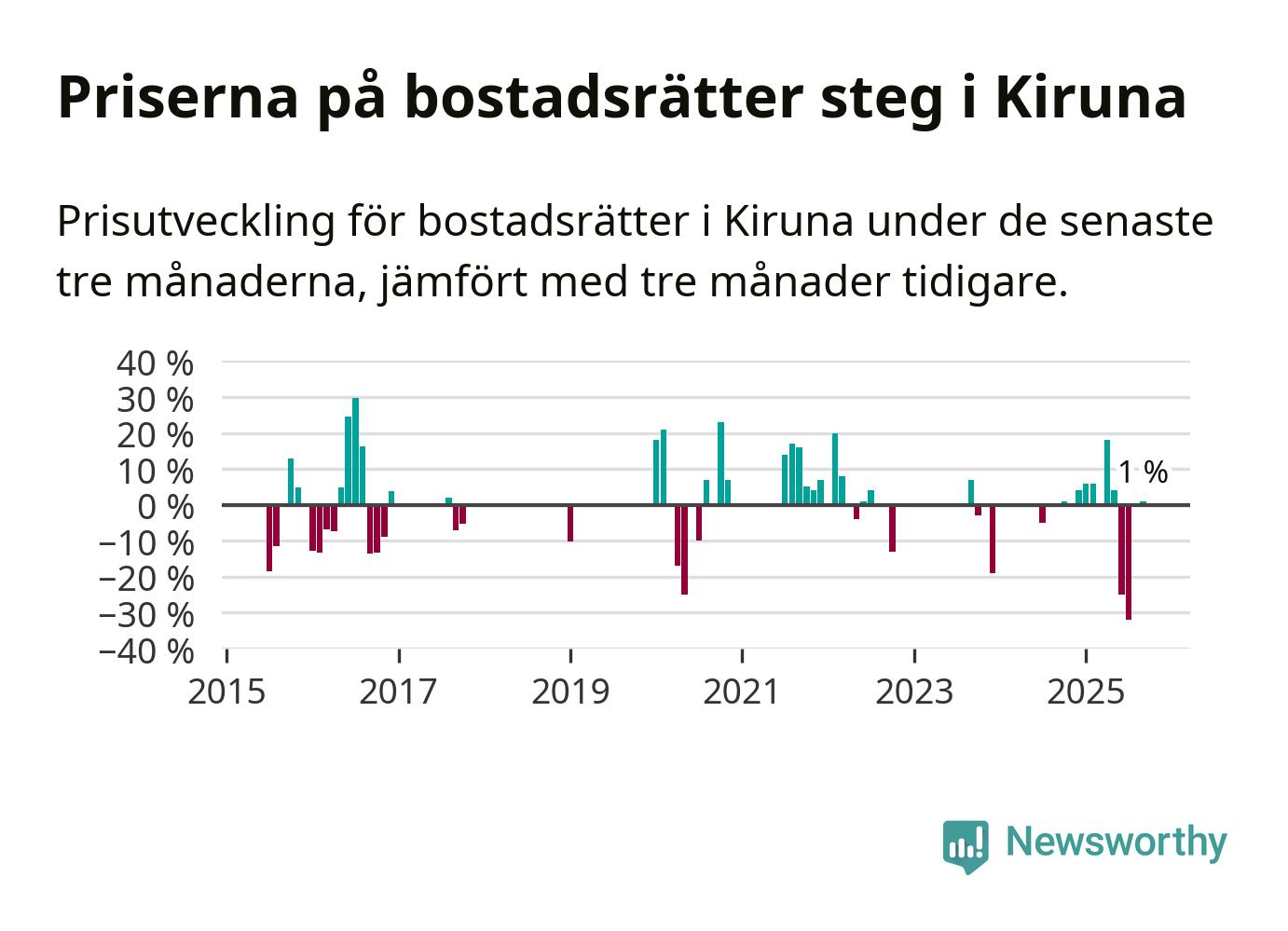 Statistiken visar även på en prisuppgång i Kiruna kommun. Medelpriset på försäljningarna av bostadsrätter i kommunen var 1 procent högre än för tre månader sedan. I hela Norrbotten däremot ligger priserna på bostadsrätter stilla.