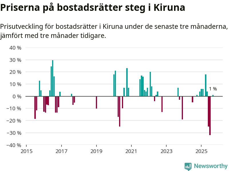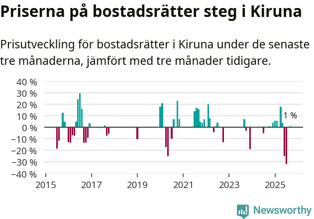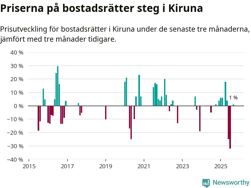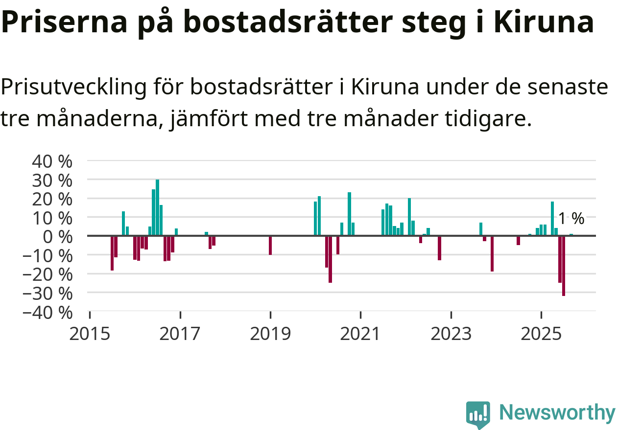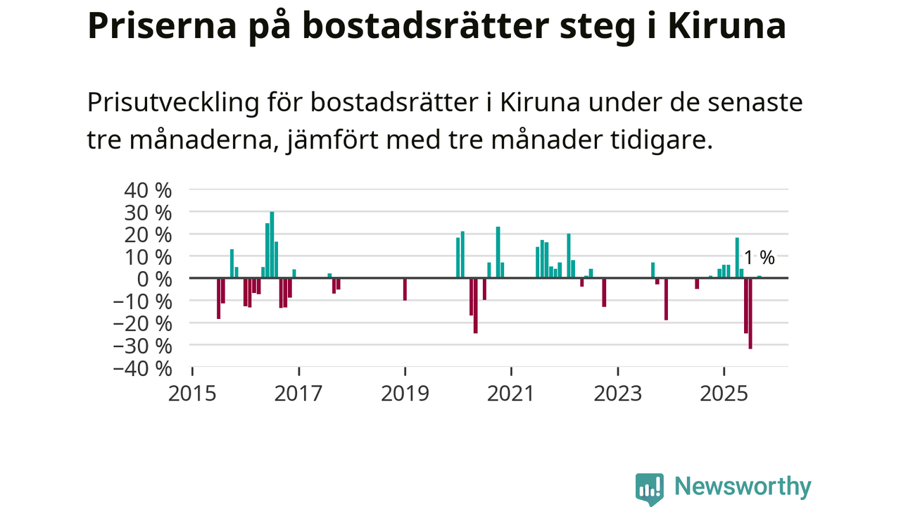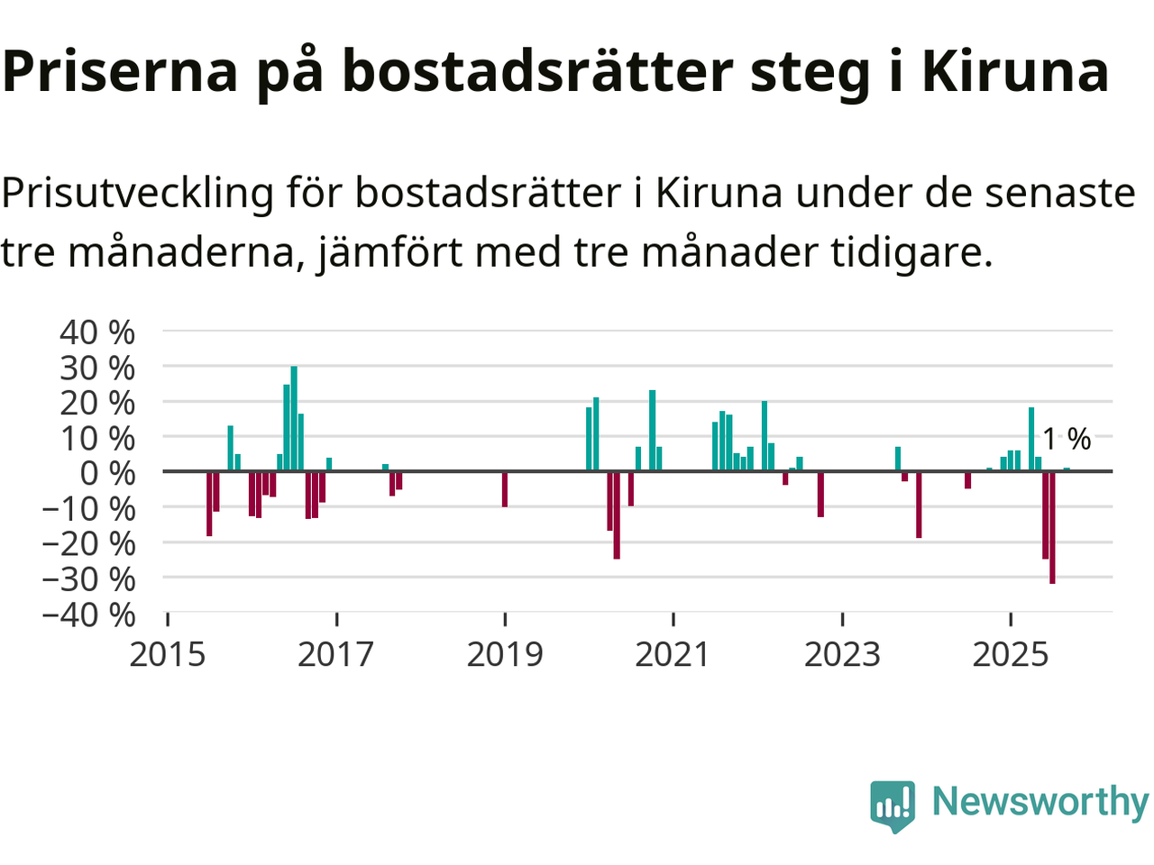 Statistiken visar även på en prisuppgång i Kiruna kommun. Medelpriset på försäljningarna av bostadsrätter i kommunen var 1 procent högre än för tre månader sedan. I hela Norrbotten däremot ligger priserna på bostadsrätter stilla.