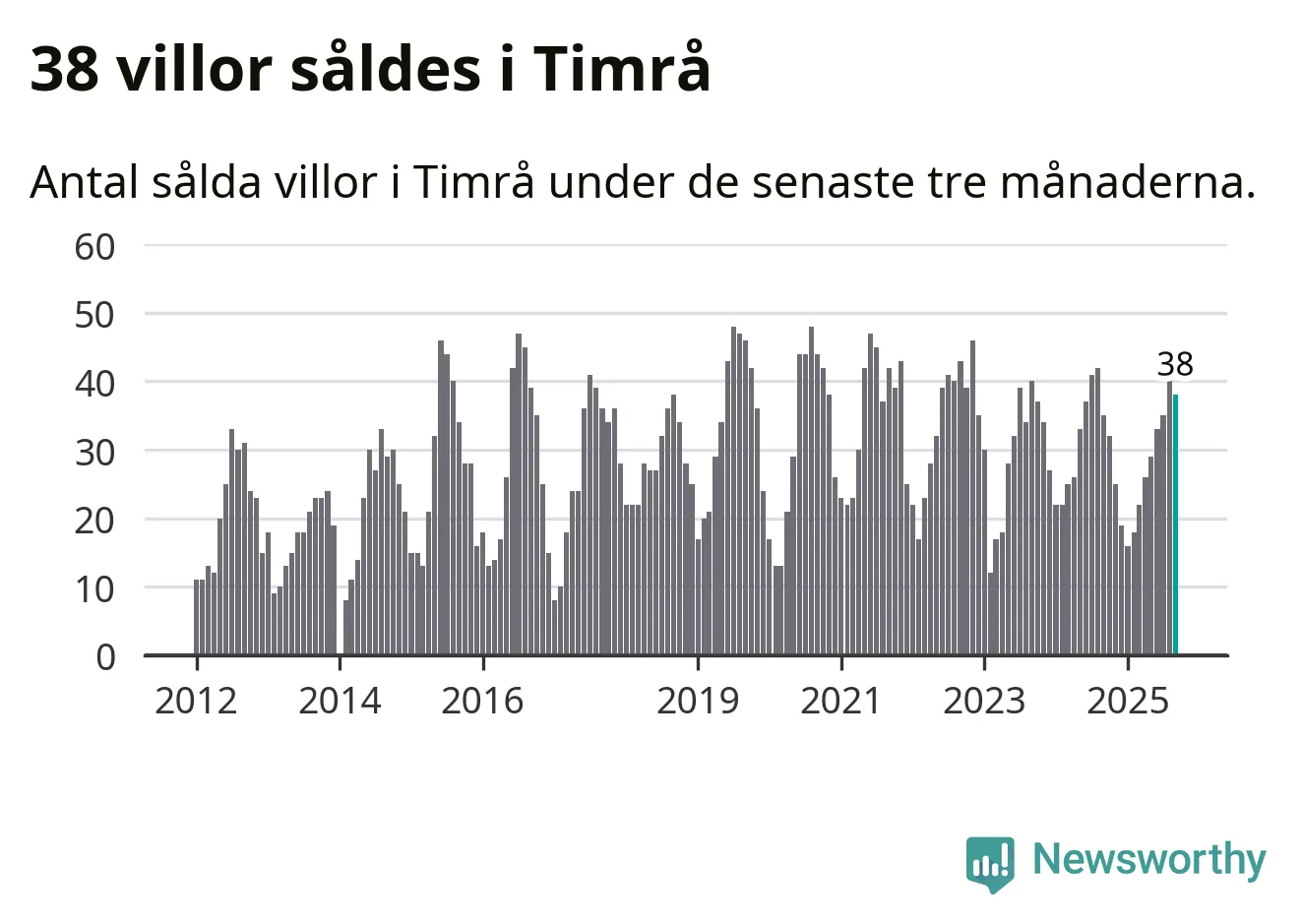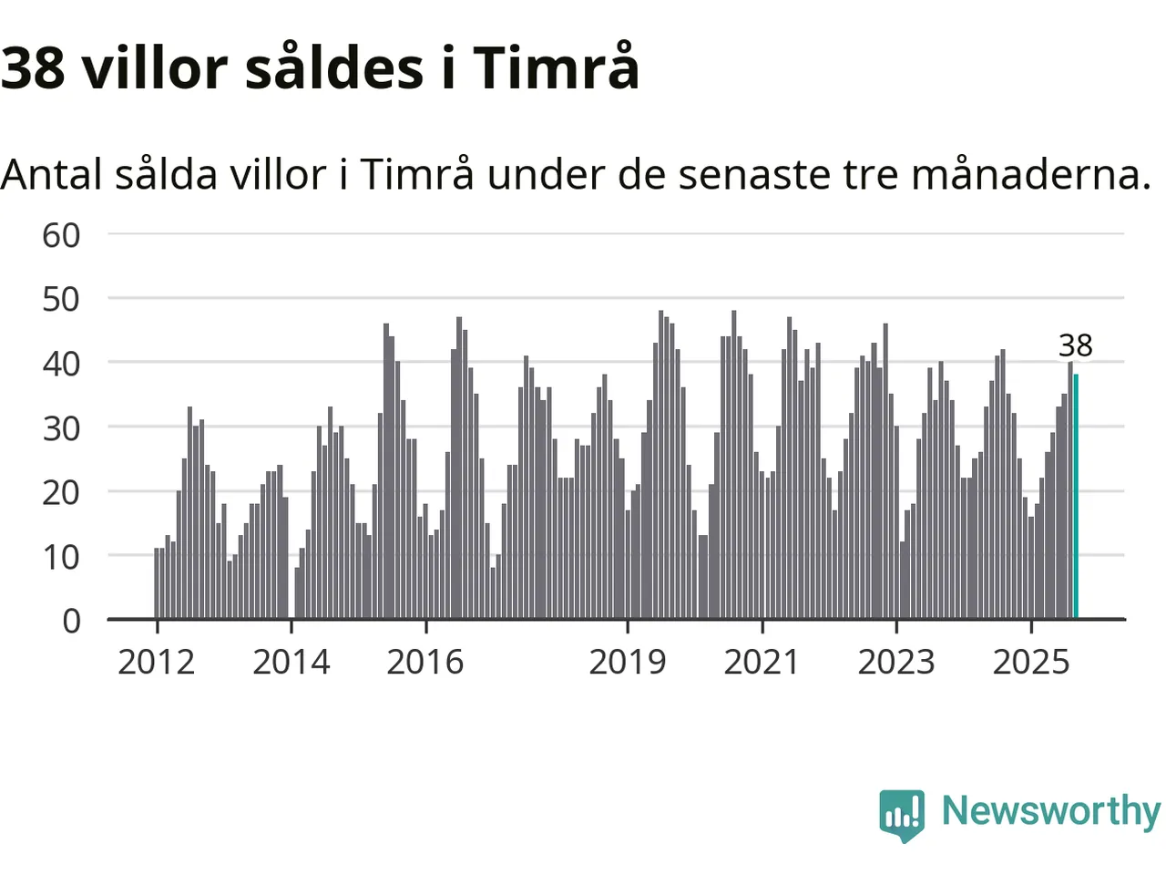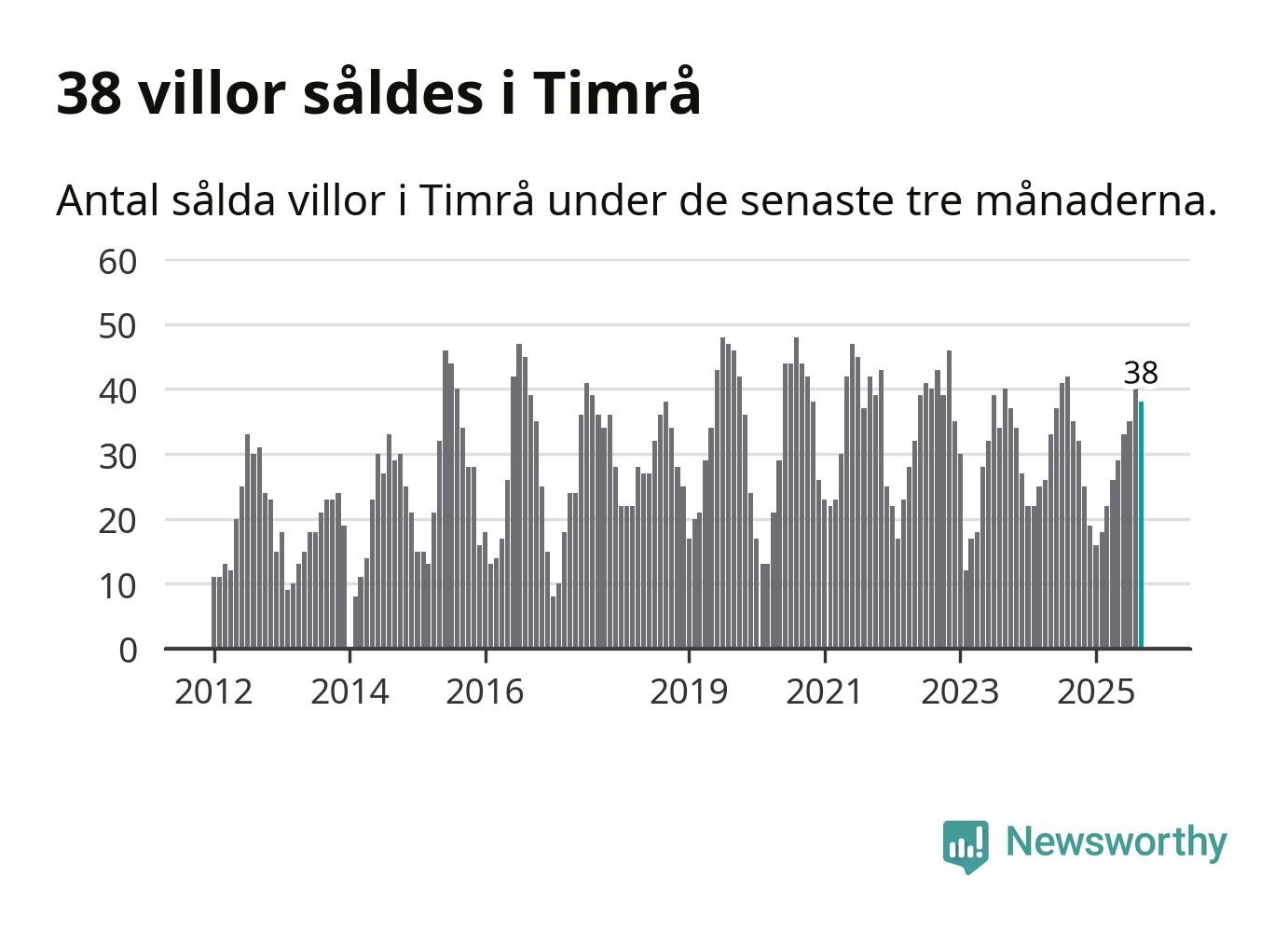 Mellan juli och september gjordes sammanlagt 38 affärer med villor i Timrå kommun. Det kan jämföras med 35 vid motsvarande tid i fjol.