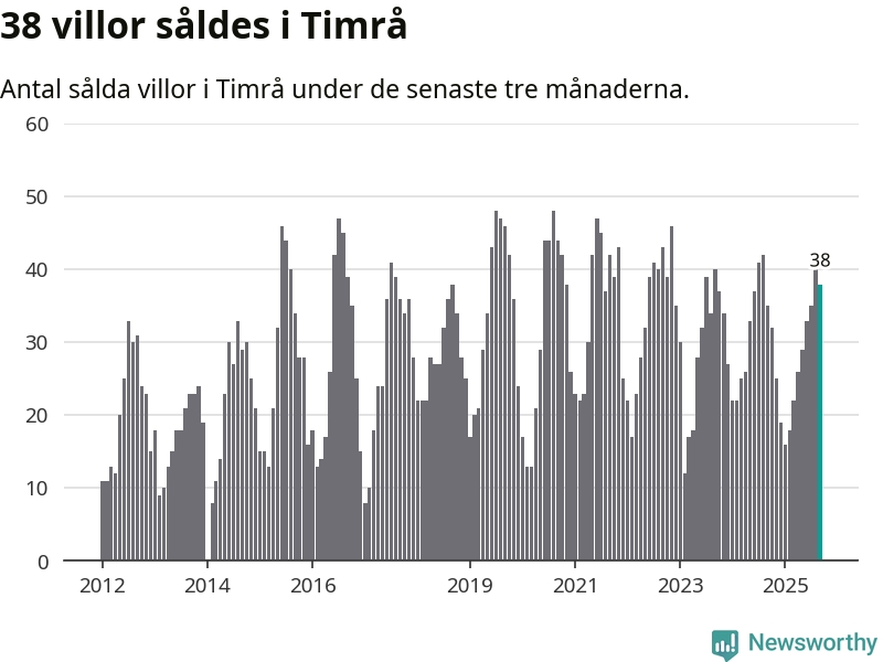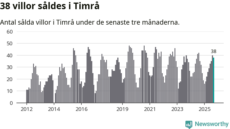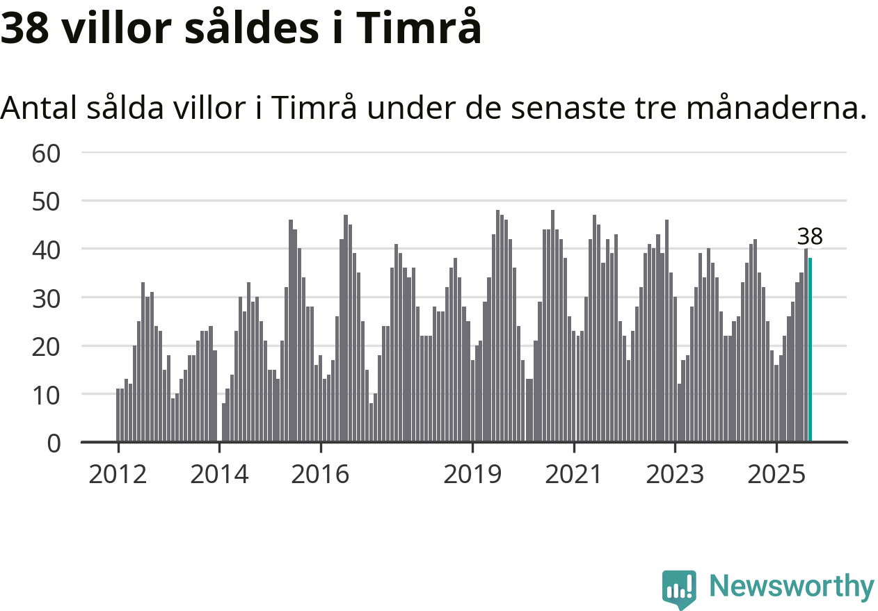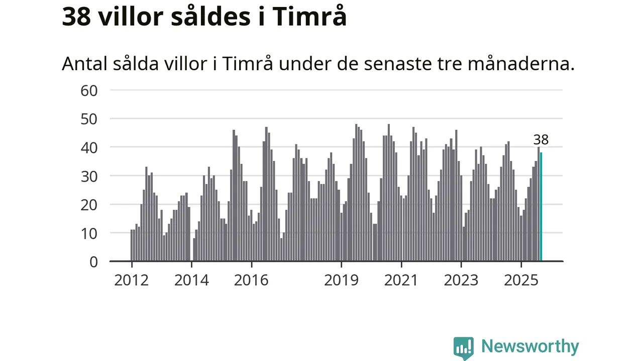 Mellan juli och september gjordes sammanlagt 38 affärer med villor i Timrå kommun. Det kan jämföras med 35 vid motsvarande tid i fjol.