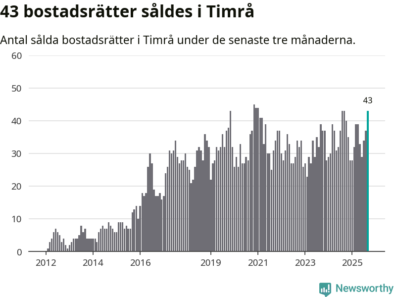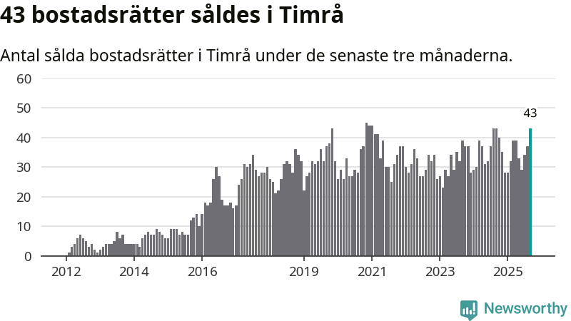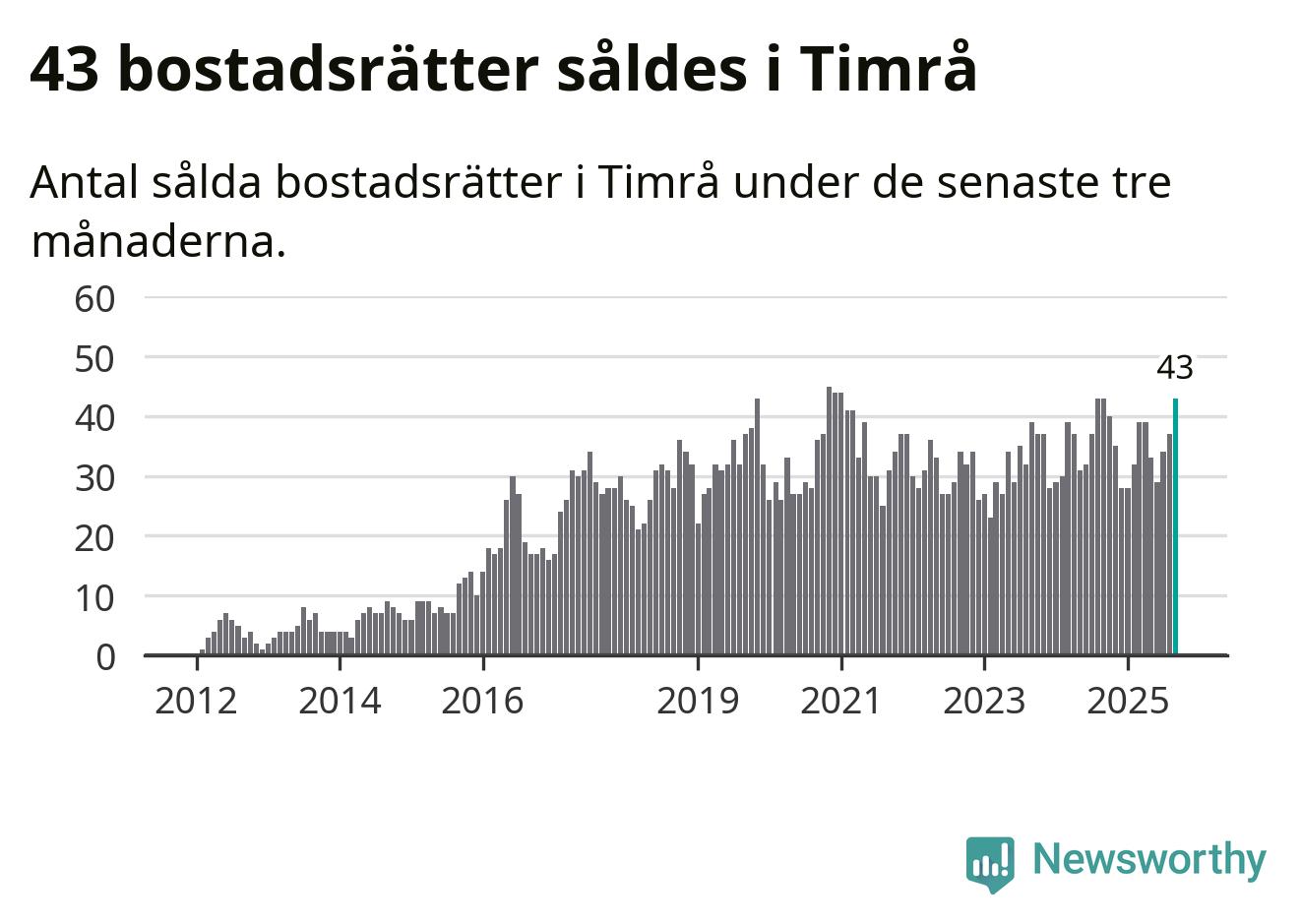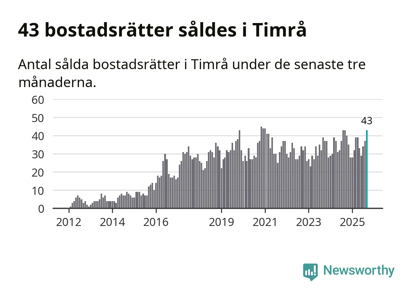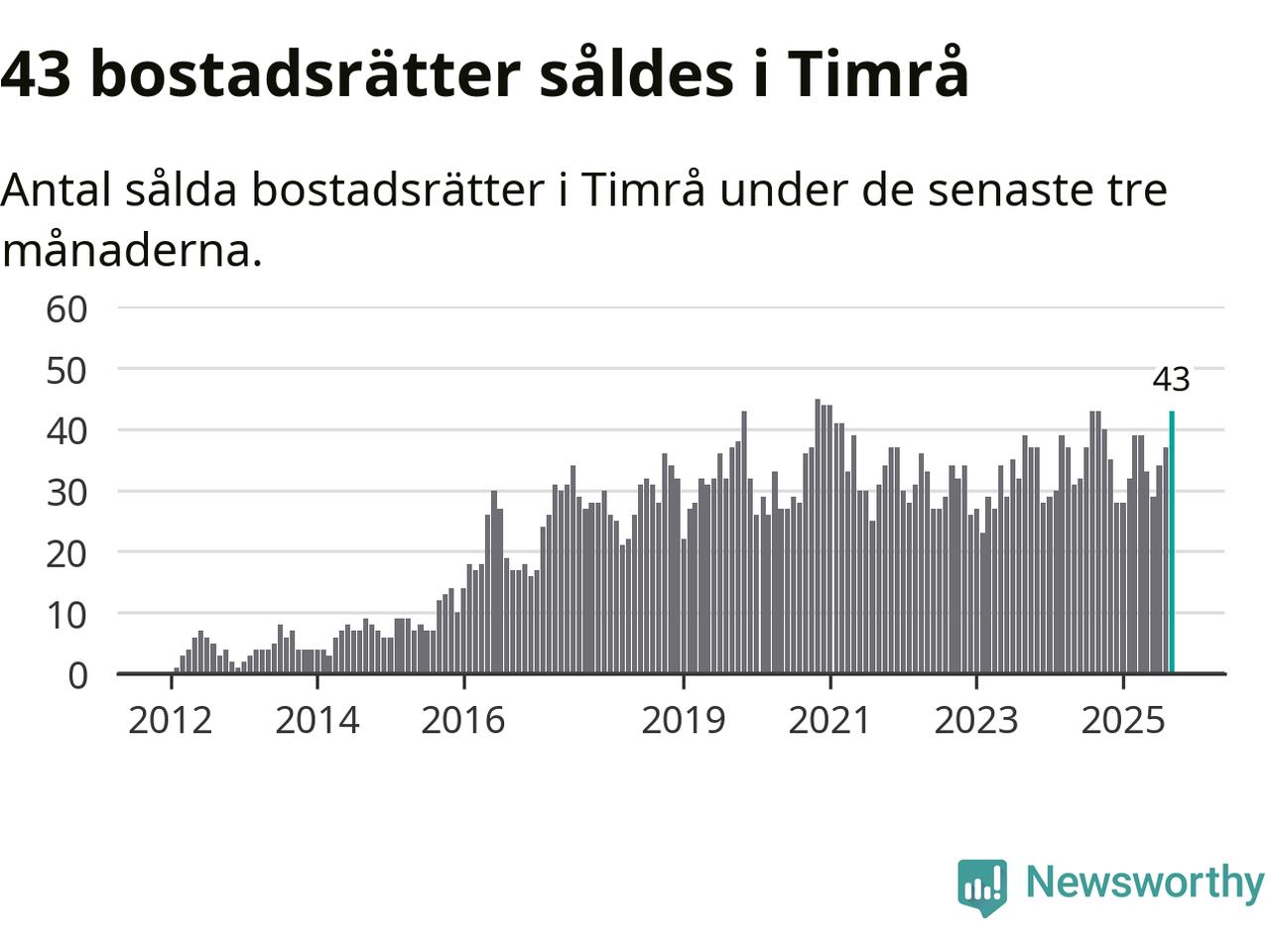 Sammanlagt såldes 43 bostadsrätter i Timrå kommun mellan juli och september till ett genomsnittligt pris på 0,6 miljoner kronor. I fjol gjordes 43 affärer vid den här tiden på året.