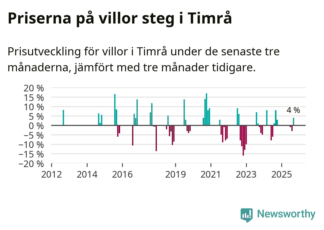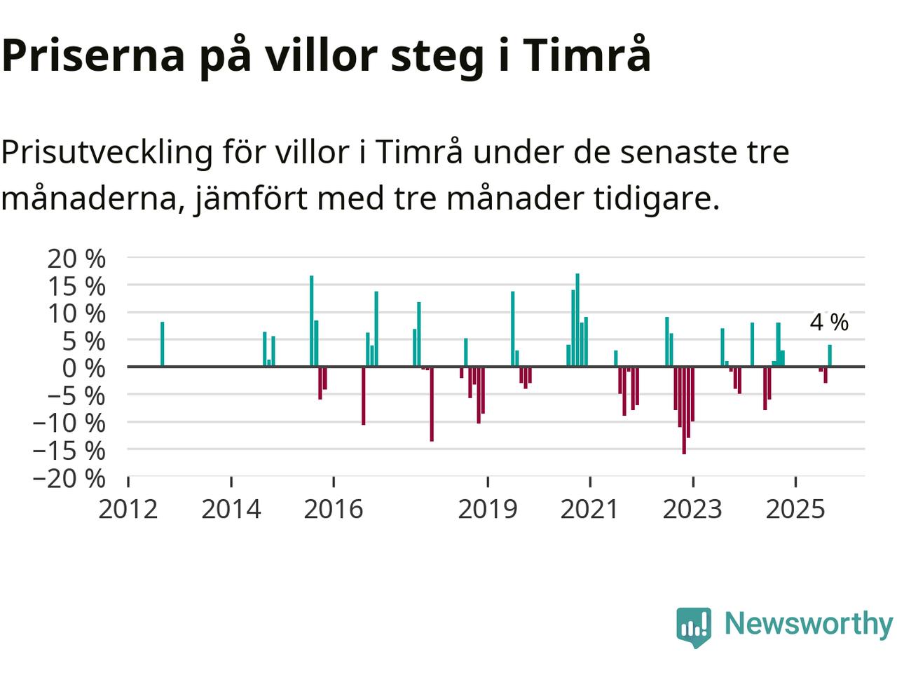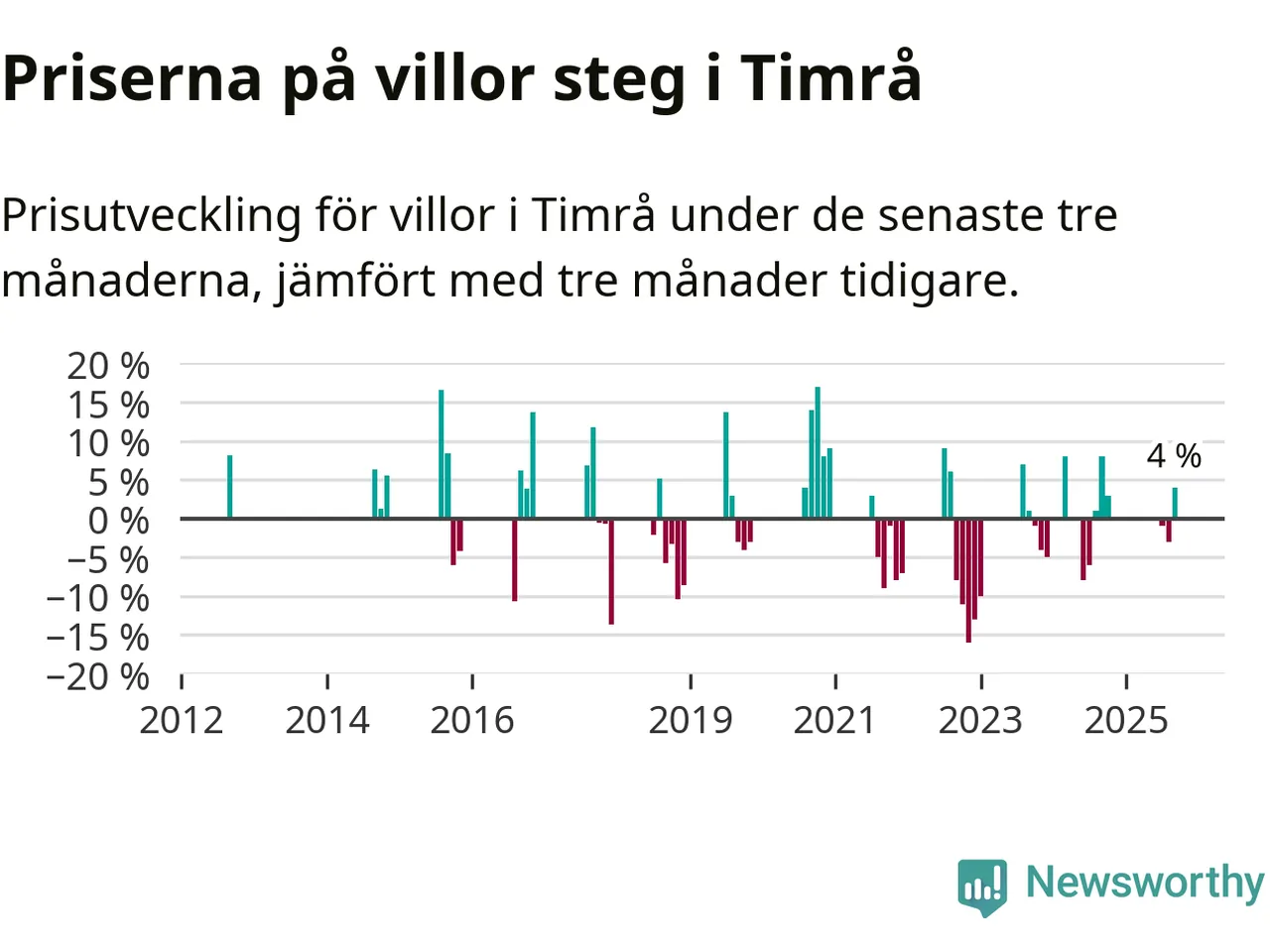 Statistiken visar även på en kännbar prisuppgång i Timrå kommun. Medelpriset på försäljningarna av villor i kommunen var 4 procent högre än för tre månader sedan. Även i hela Västernorrland ökar villapriserna. I hela länet noterades en prisuppgång på 2 procent.