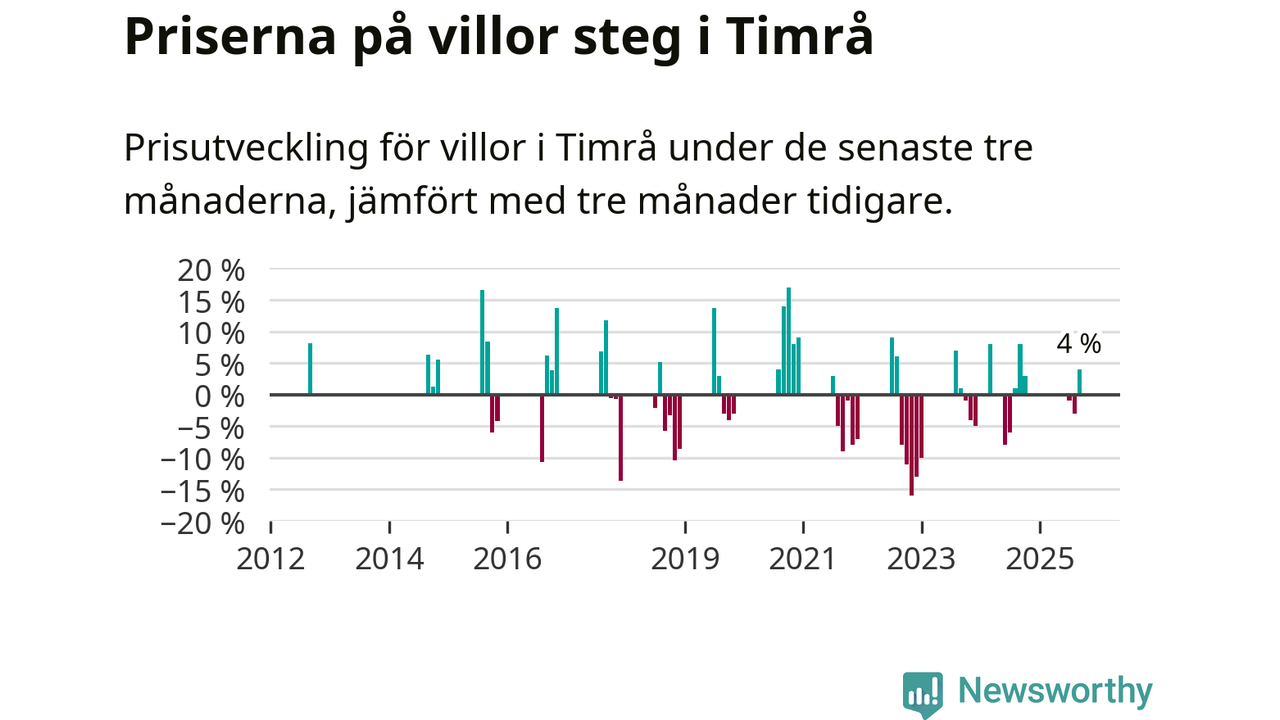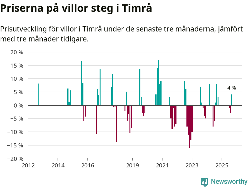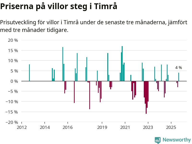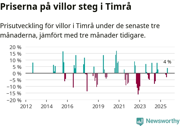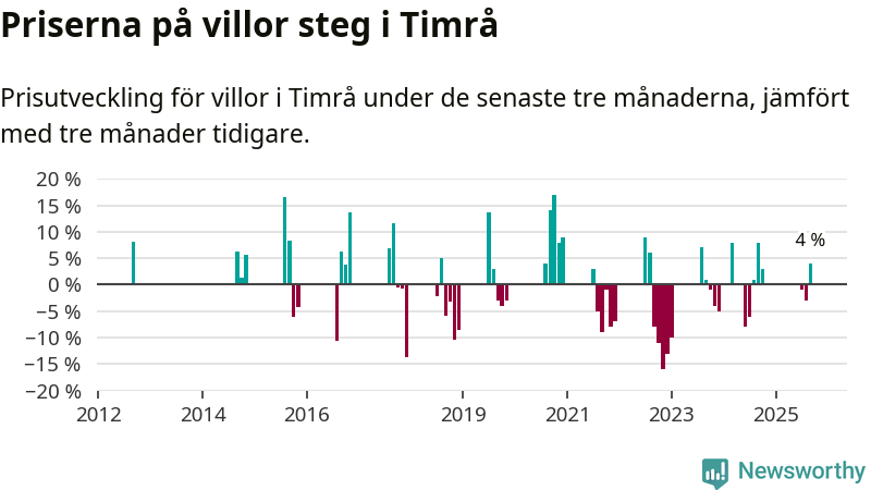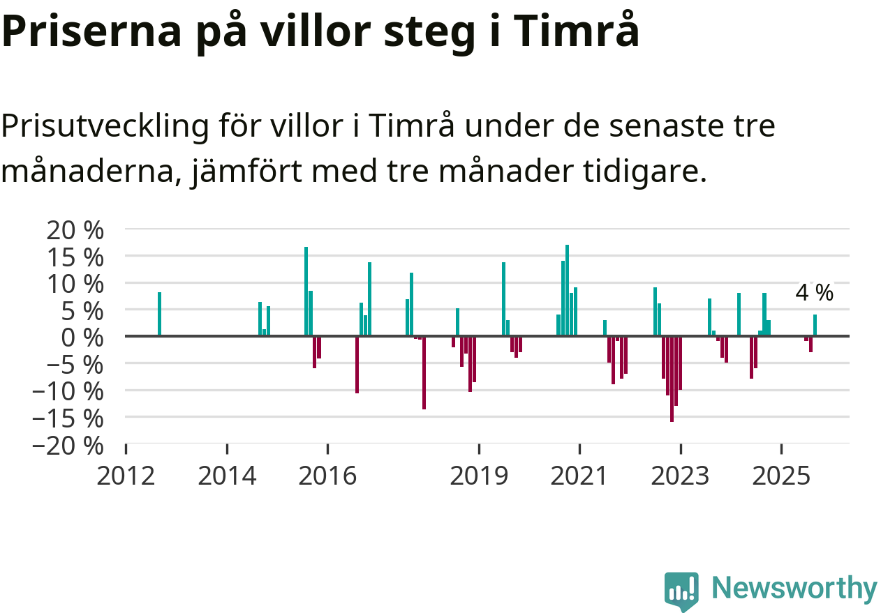 Statistiken visar även på en kännbar prisuppgång i Timrå kommun. Medelpriset på försäljningarna av villor i kommunen var 4 procent högre än för tre månader sedan. Även i hela Västernorrland ökar villapriserna. I hela länet noterades en prisuppgång på 2 procent.