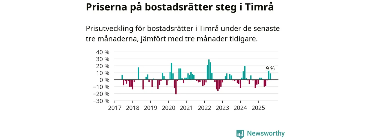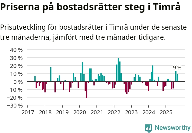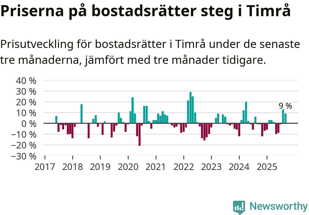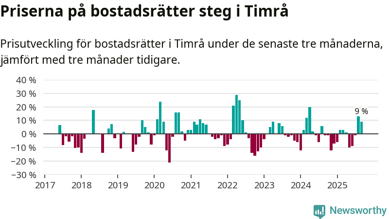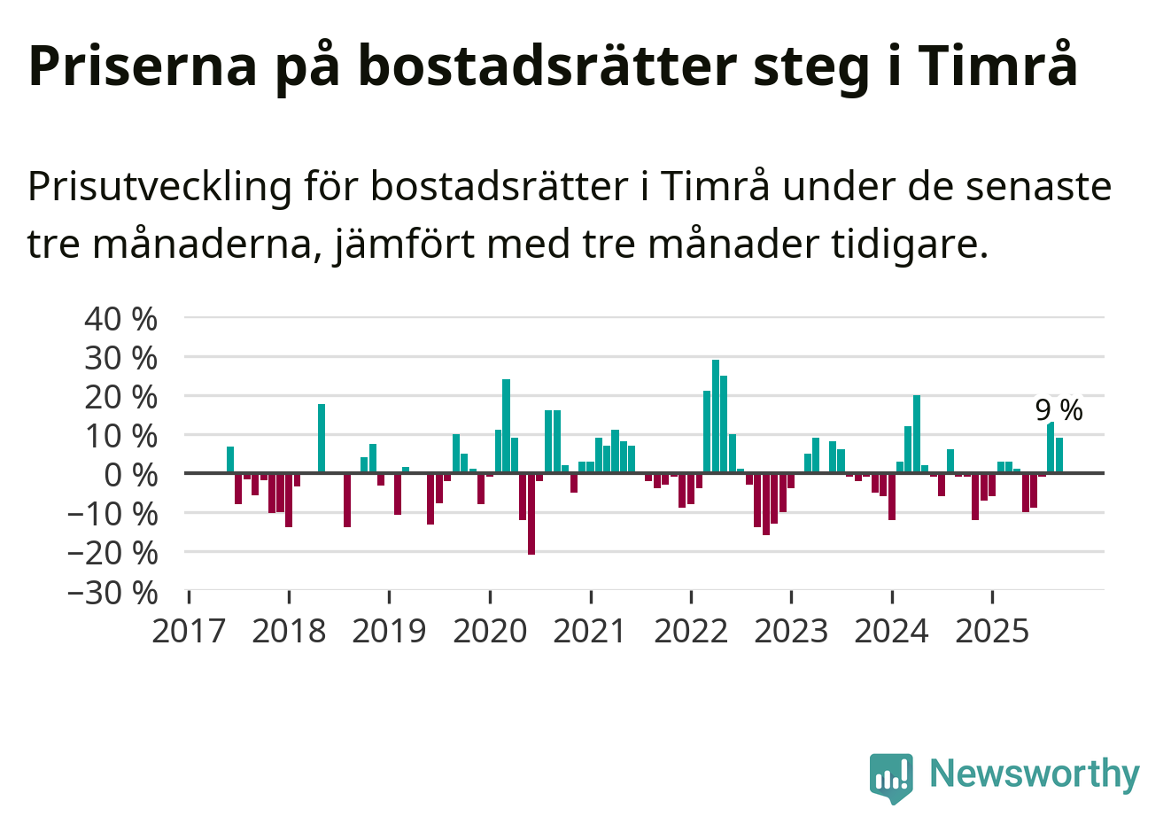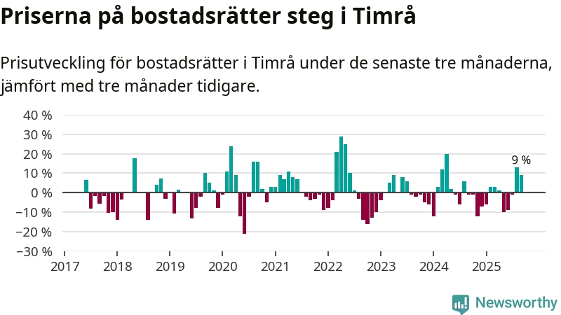 Priserna på bostadsrätter har gått upp i Timrå kommun. Medelpriset på försäljningarna under de senaste tre månaderna visar på en uppgång med 9 procent.