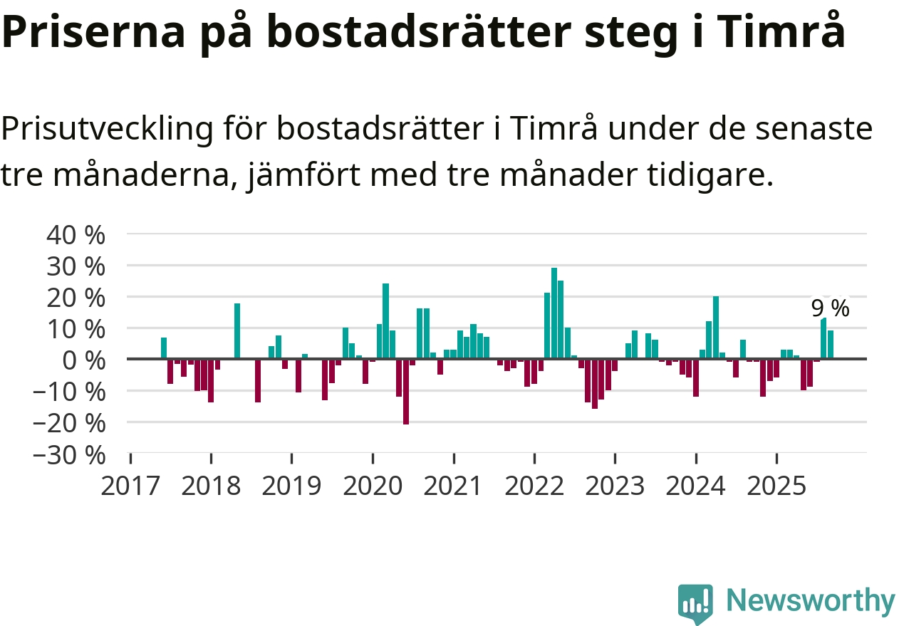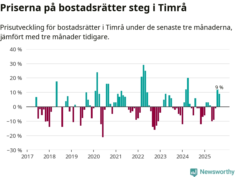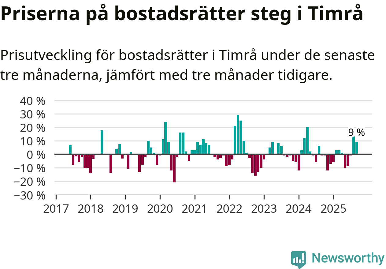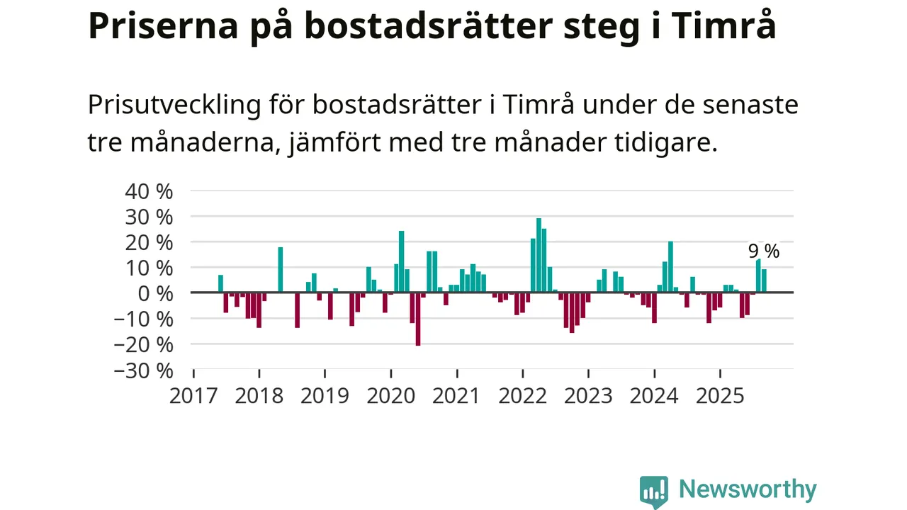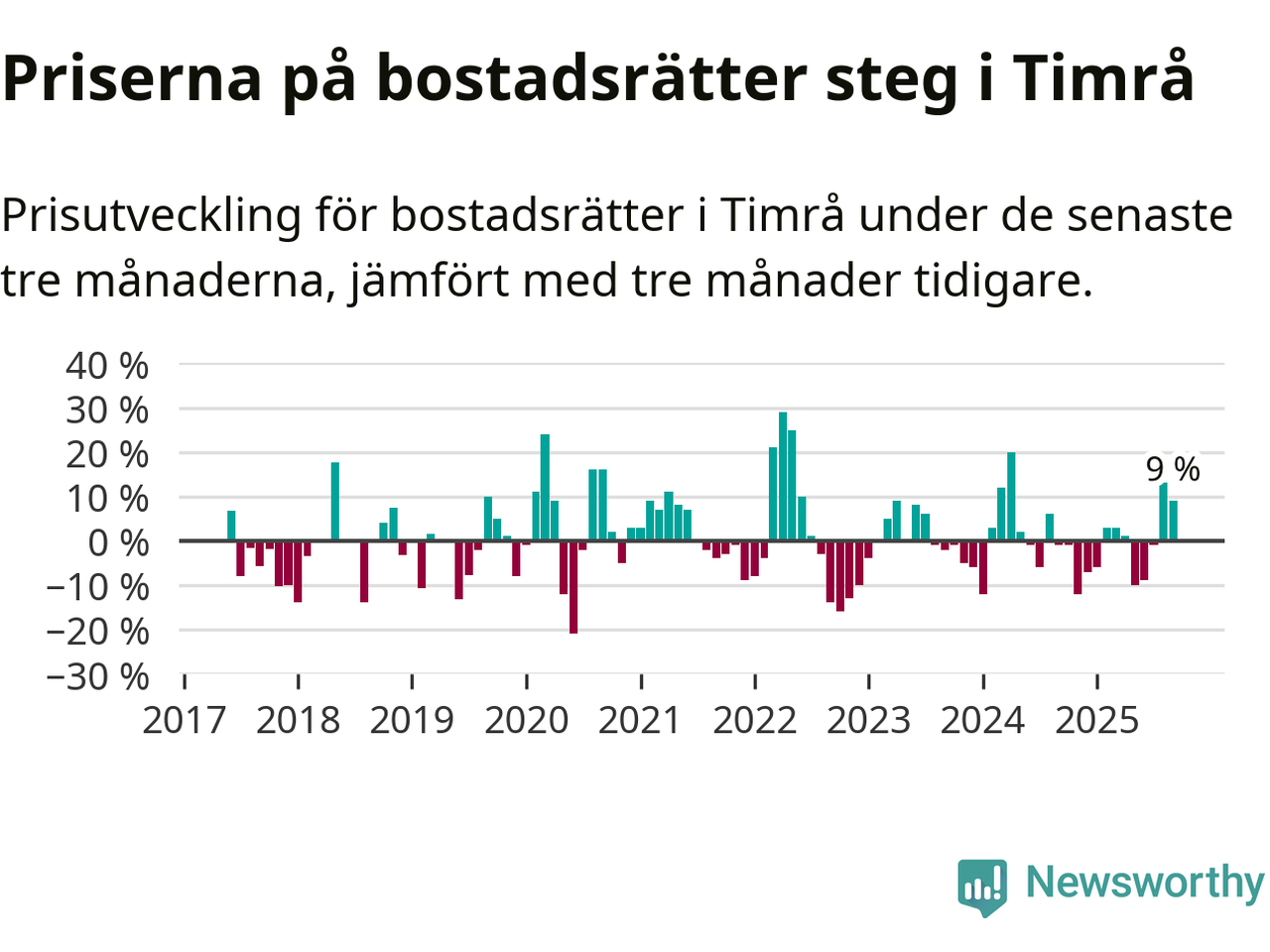 Priserna på bostadsrätter har gått upp i Timrå kommun. Medelpriset på försäljningarna under de senaste tre månaderna visar på en uppgång med 9 procent.