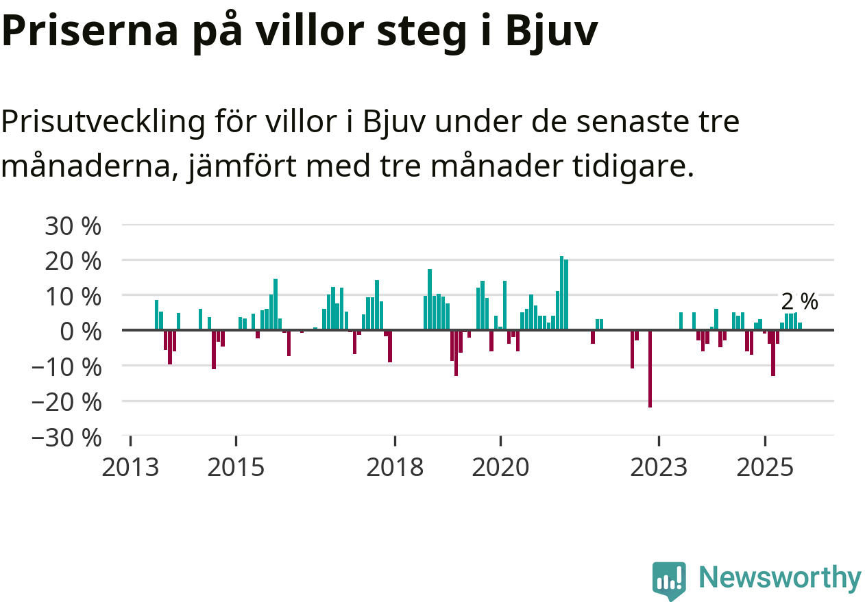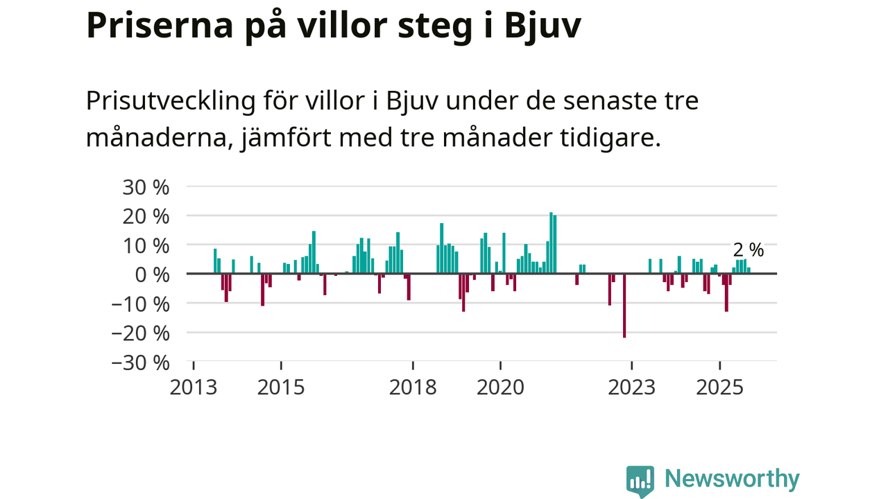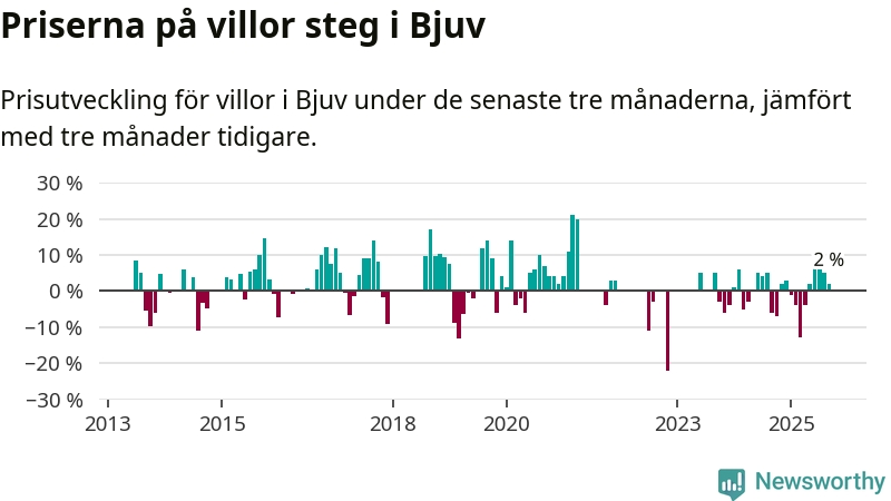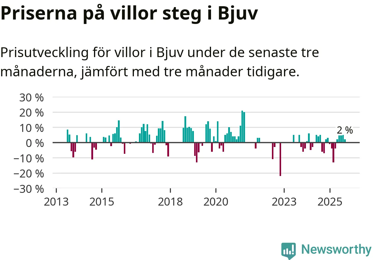 Statistiken visar även på en prisuppgång i Bjuvs kommun. Medelpriset på försäljningarna av villor i kommunen var 2 procent högre än för tre månader sedan. Även i hela Skåne ökar villapriserna. I hela länet noterades en prisuppgång på 1 procent.