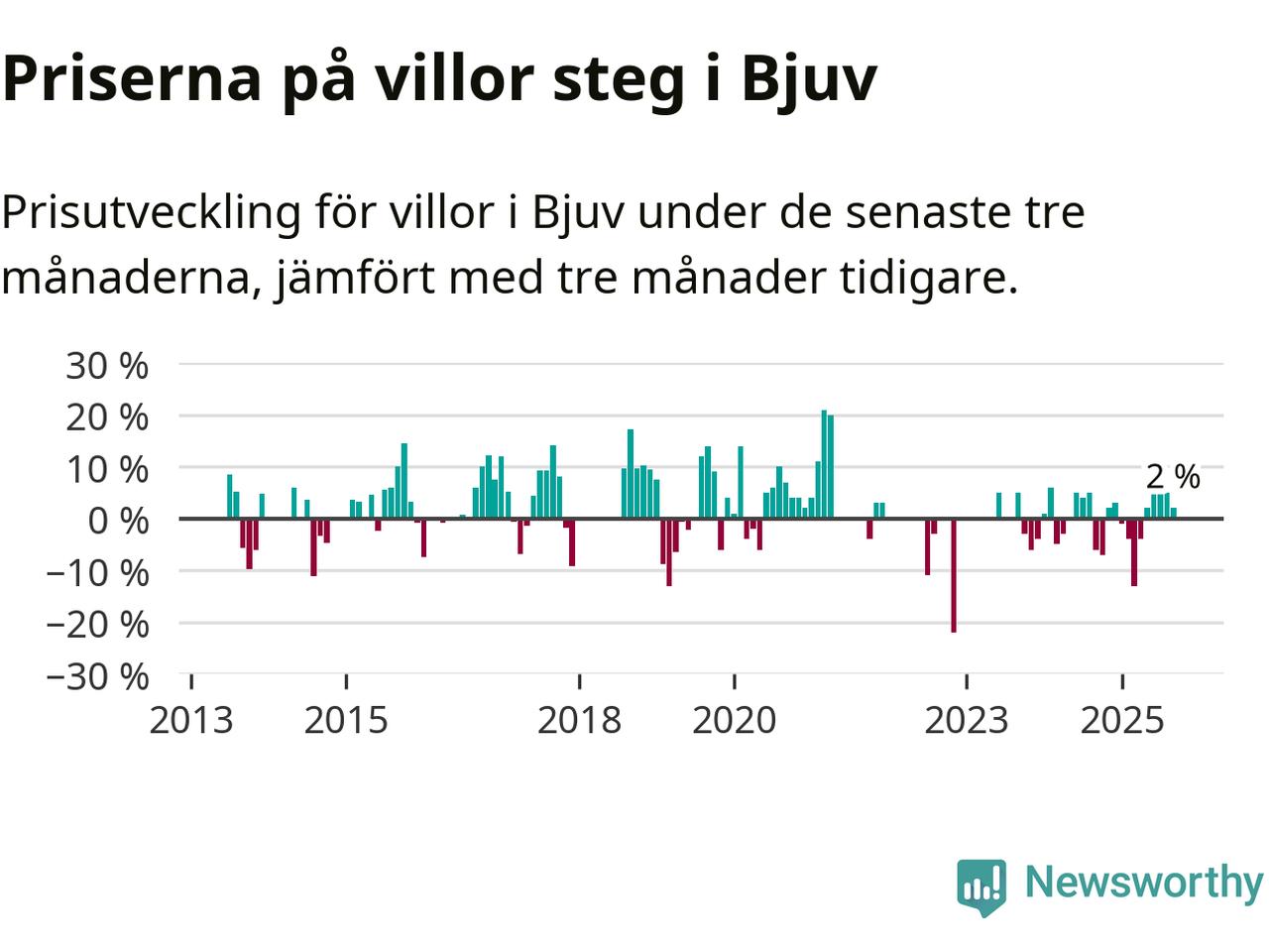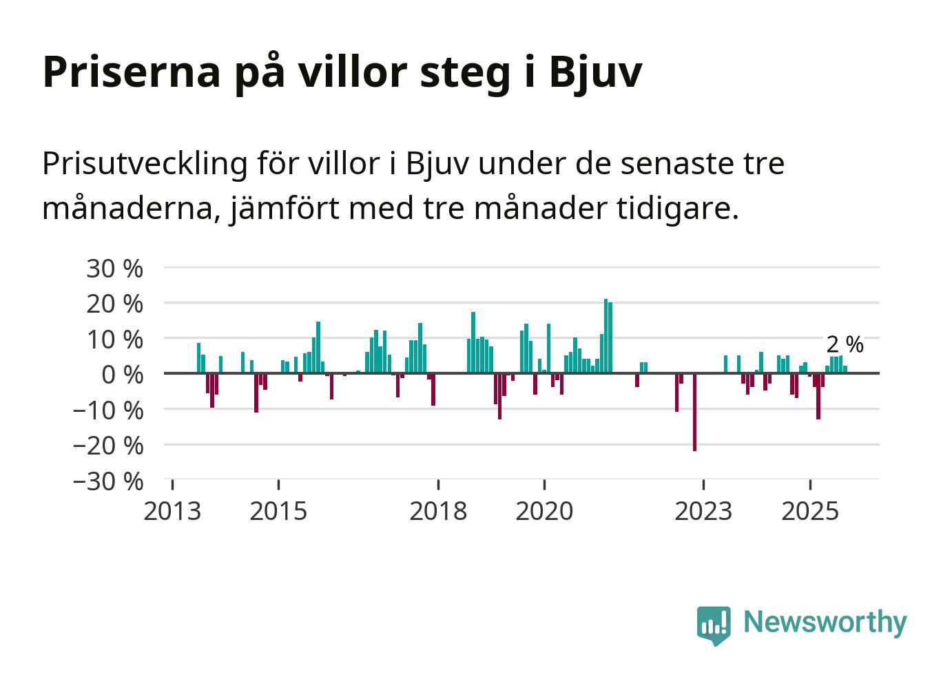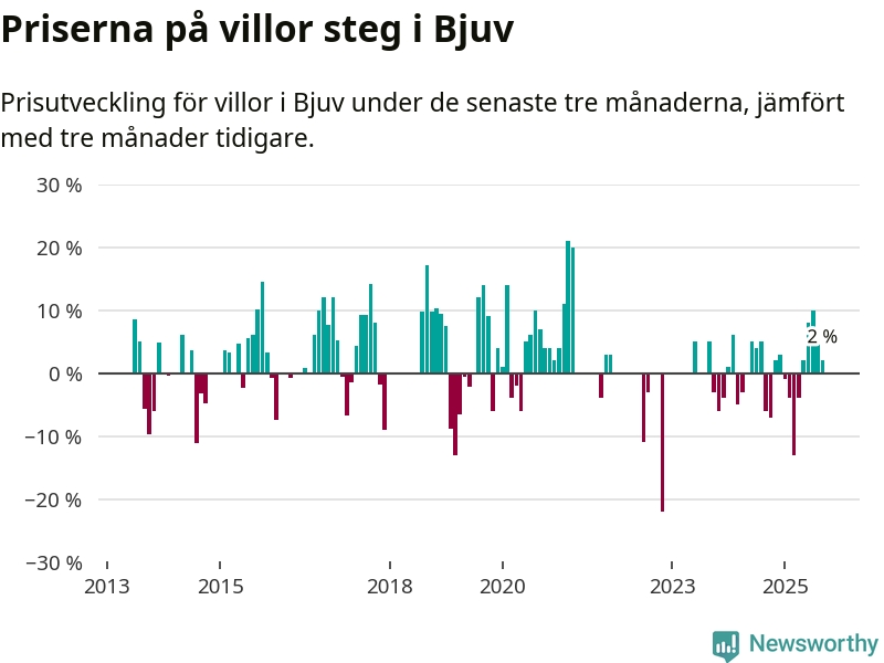 Statistiken visar även på en prisuppgång i Bjuvs kommun. Medelpriset på försäljningarna av villor i kommunen var 2 procent högre än för tre månader sedan. Även i hela Skåne ökar villapriserna. I hela länet noterades en prisuppgång på 1 procent.
