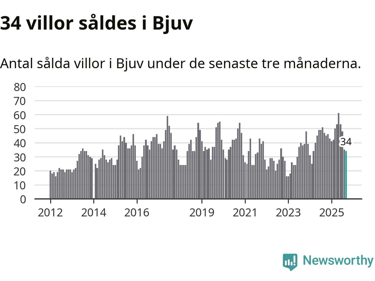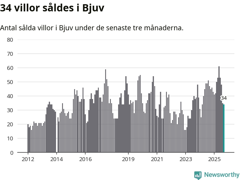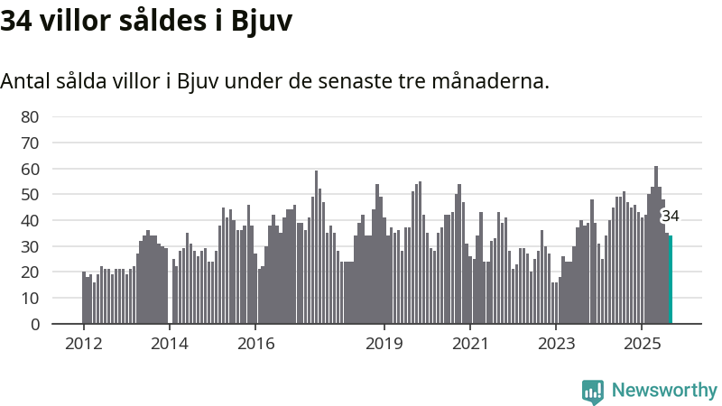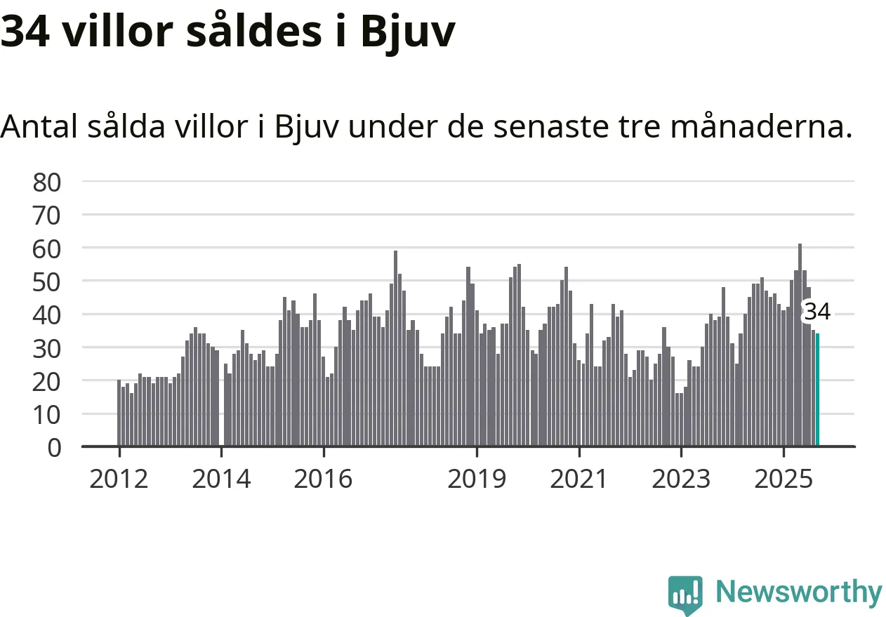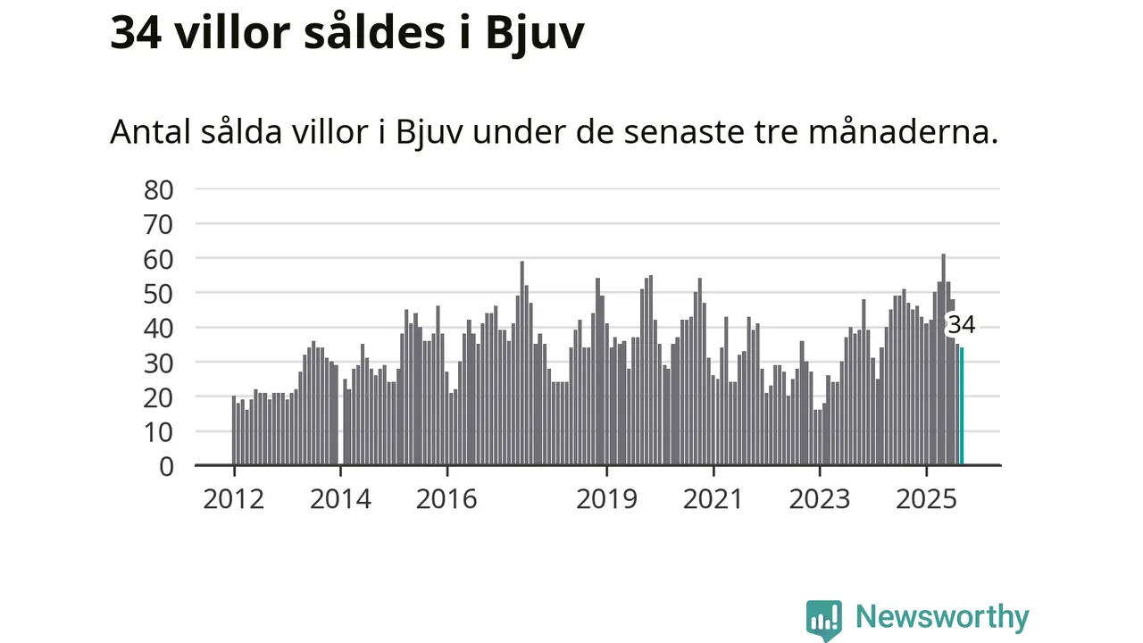 Mellan juli och september såldes 34 villor i Bjuvs kommun. Det är relativt få sett till aktiviteten på bostadsmarknaden i kommunen under de senaste tolv månaderna, samt det historiska snittet för den här tiden på året.