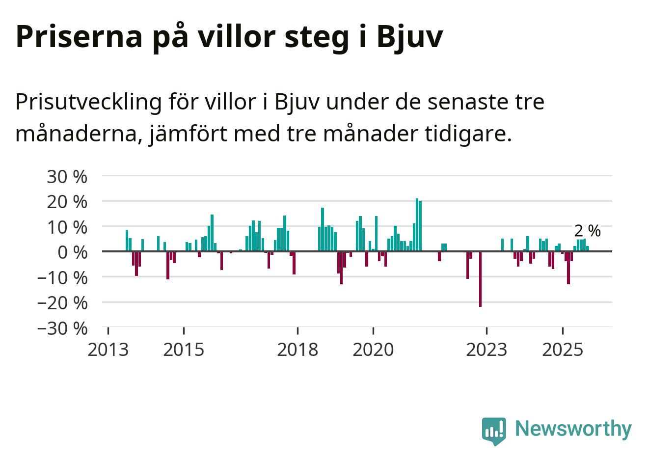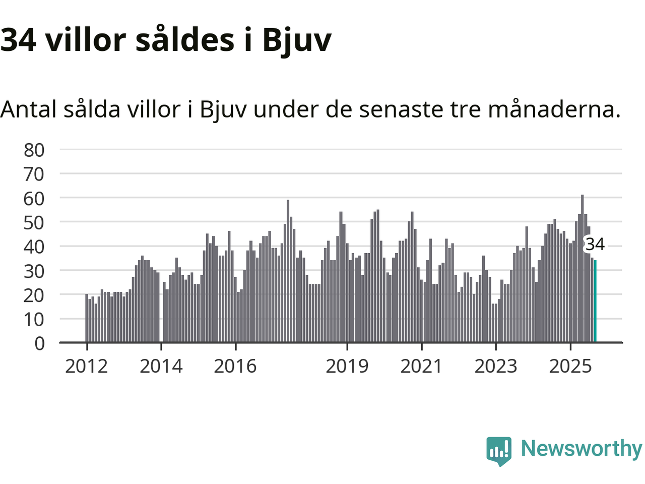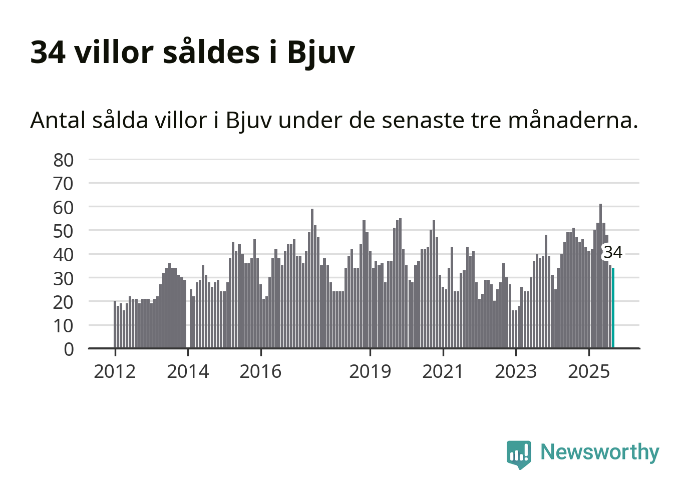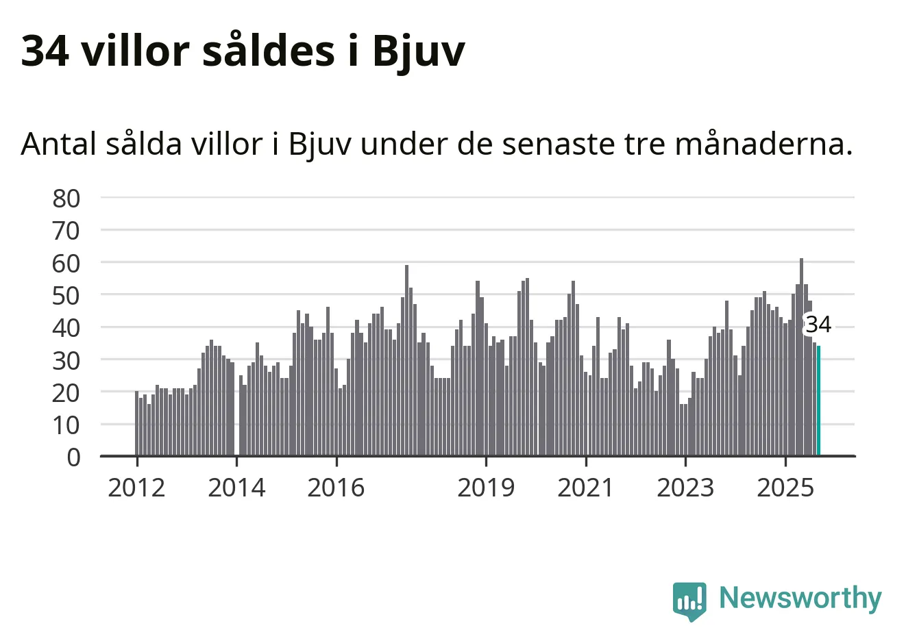 Mellan juli och september såldes 34 villor i Bjuvs kommun. Det är relativt få sett till aktiviteten på bostadsmarknaden i kommunen under de senaste tolv månaderna, samt det historiska snittet för den här tiden på året.