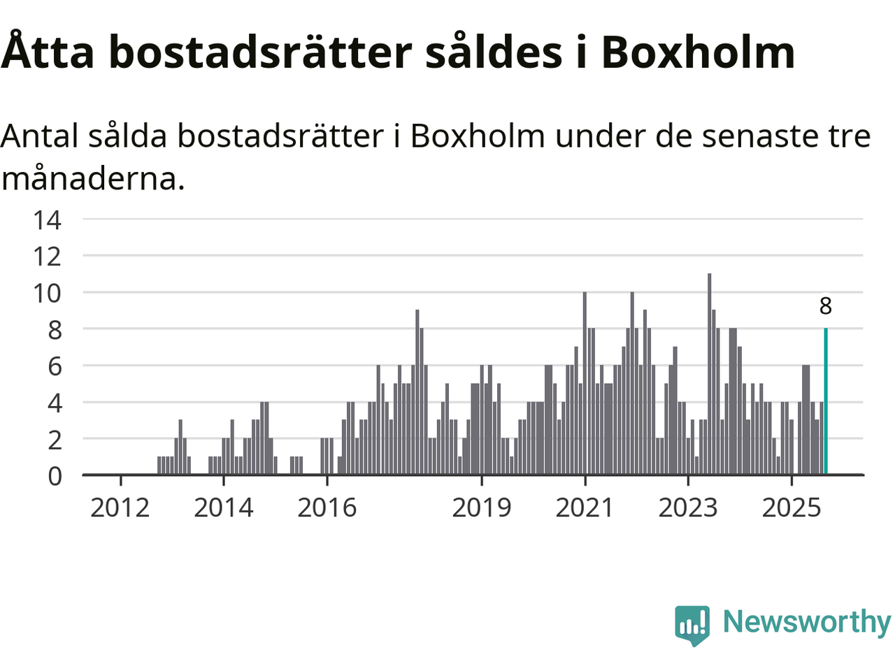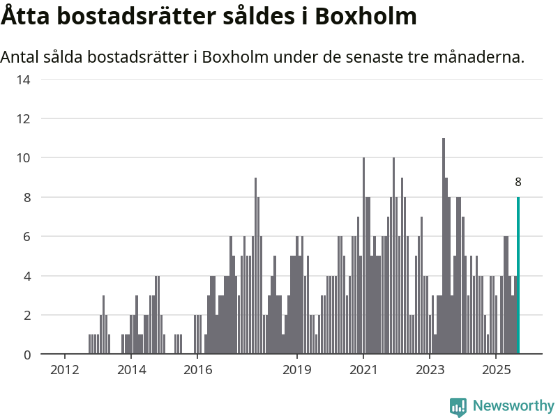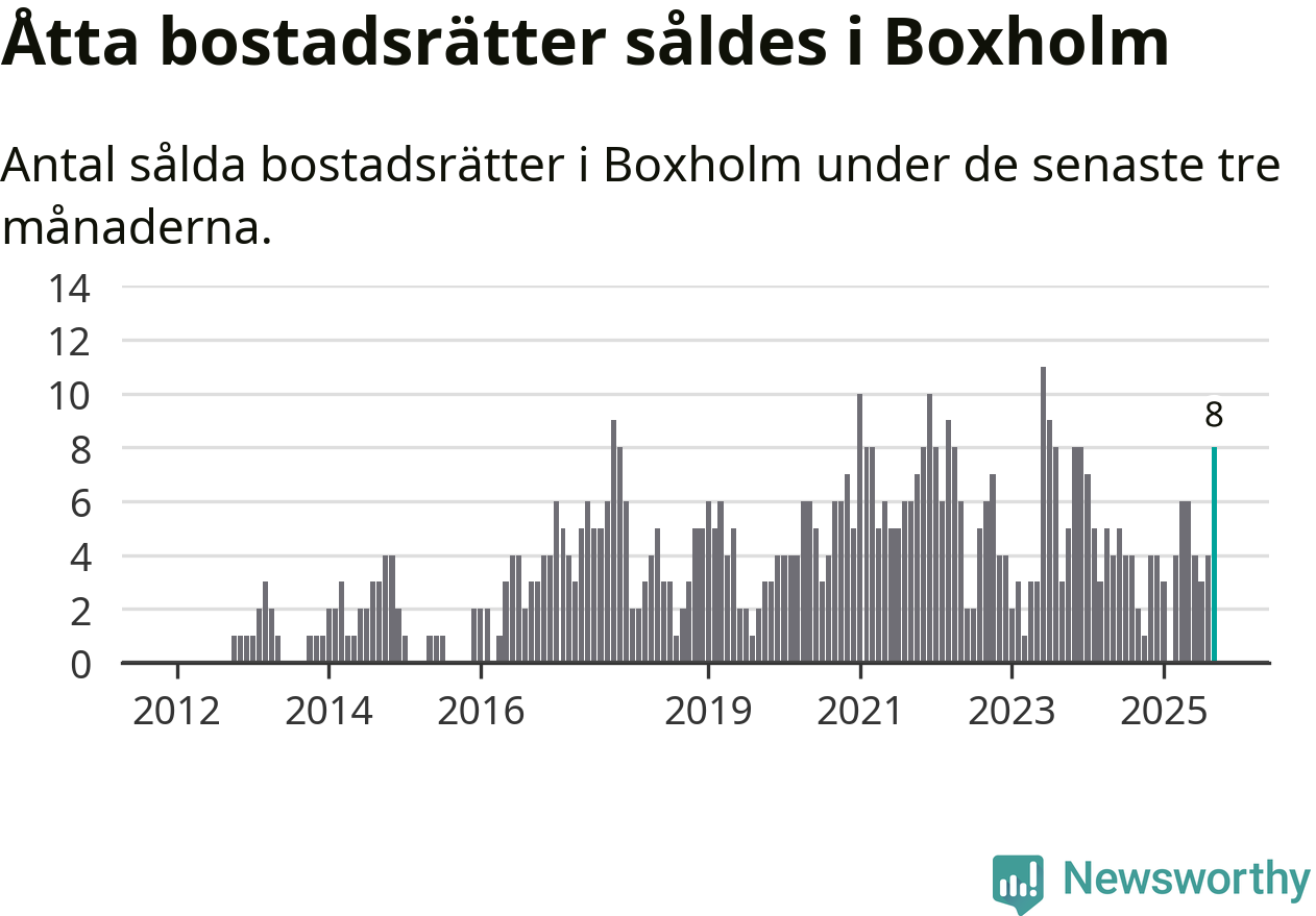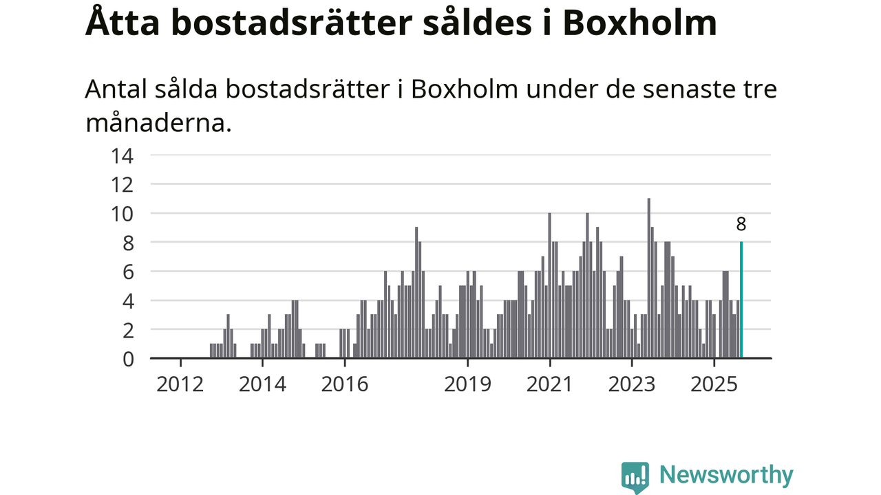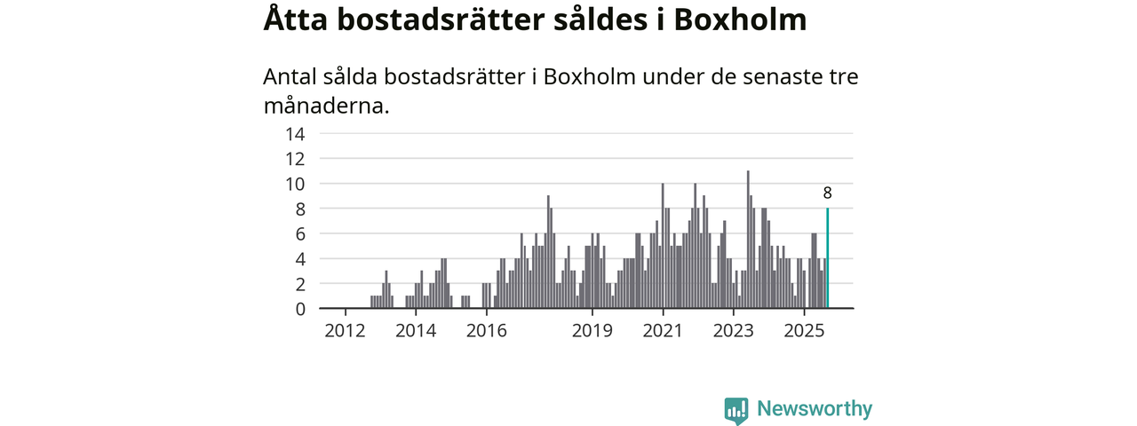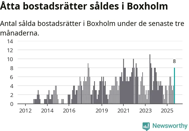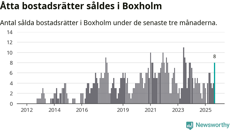 Mellan juli och september gjordes sammanlagt åtta affärer med bostadsrätter i Boxholms kommun. Det kan jämföras med två vid motsvarande tid i fjol.