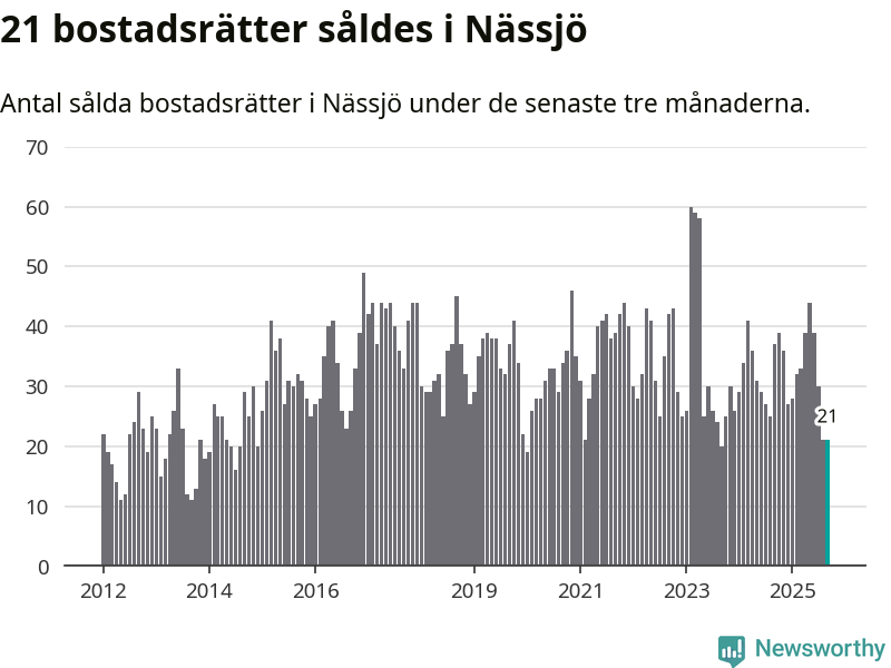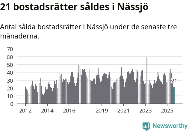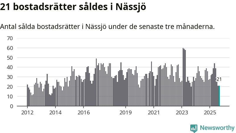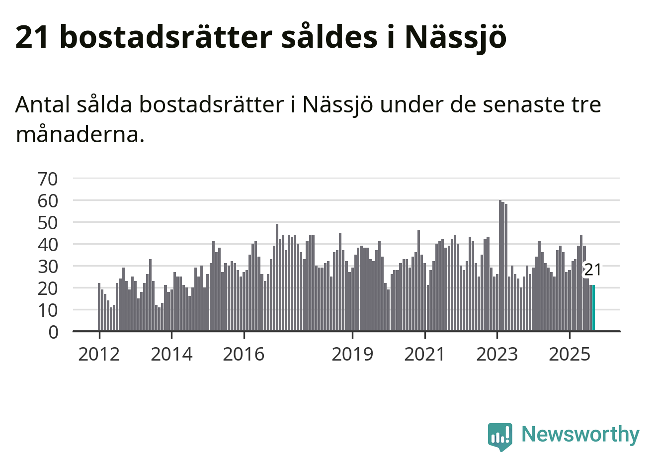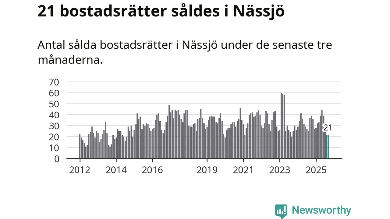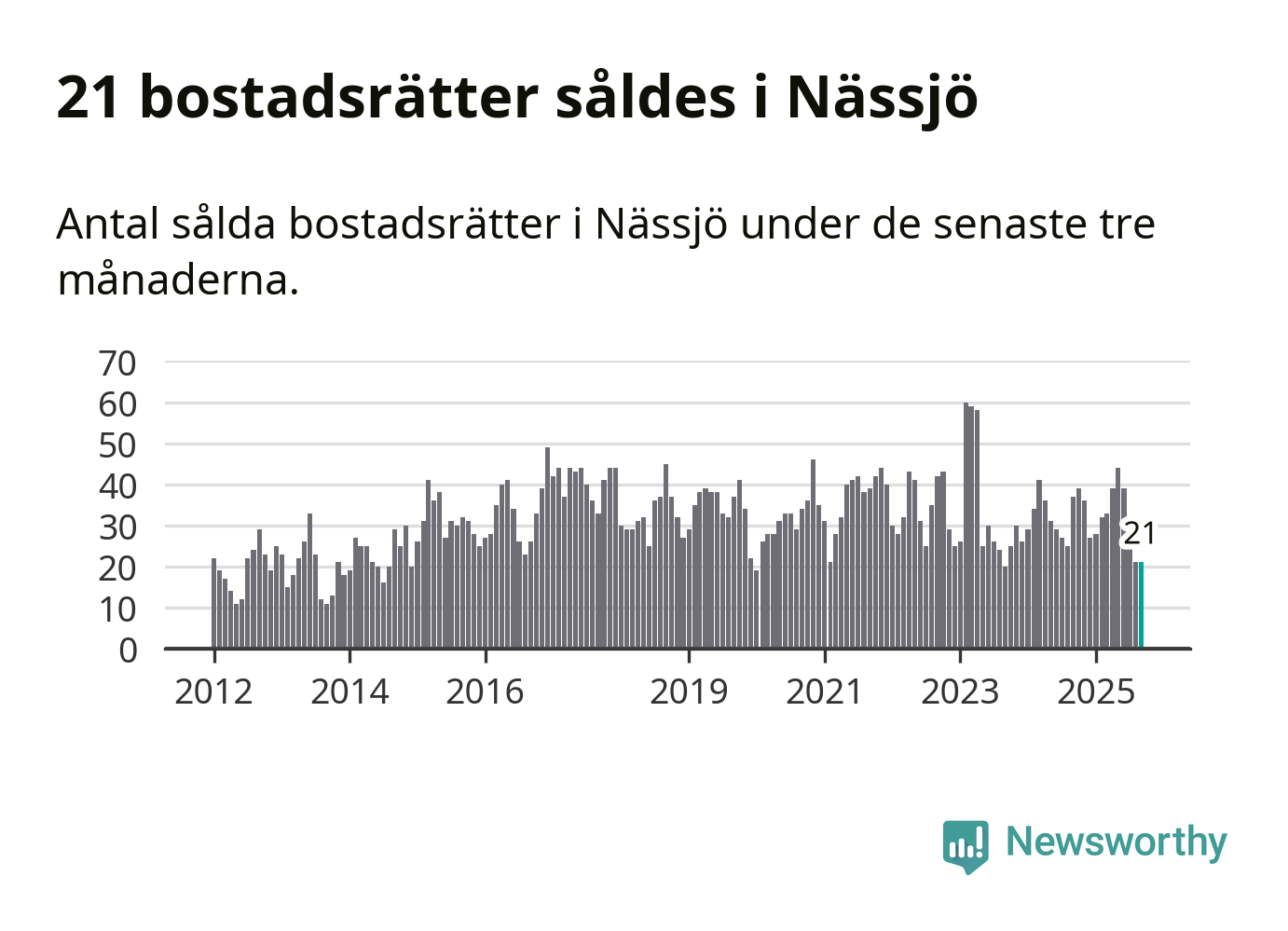 Mellan juli och september såldes 21 bostadsrätter i Nässjö kommun. Det är relativt få sett till aktiviteten på bostadsmarknaden i kommunen under de senaste tolv månaderna, samt det historiska snittet för den här tiden på året.