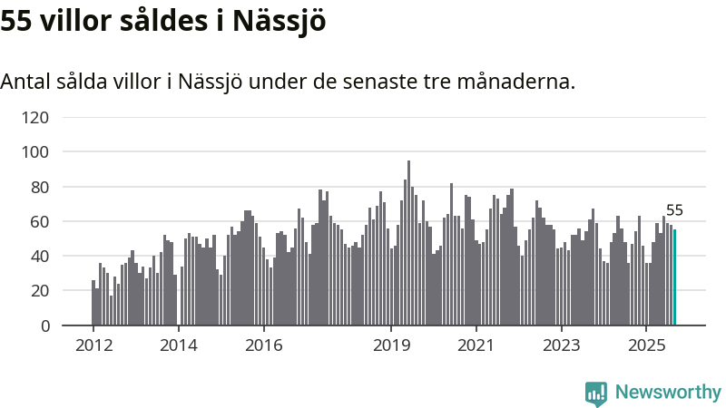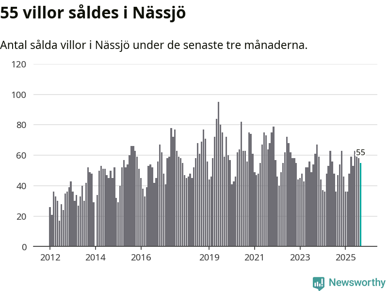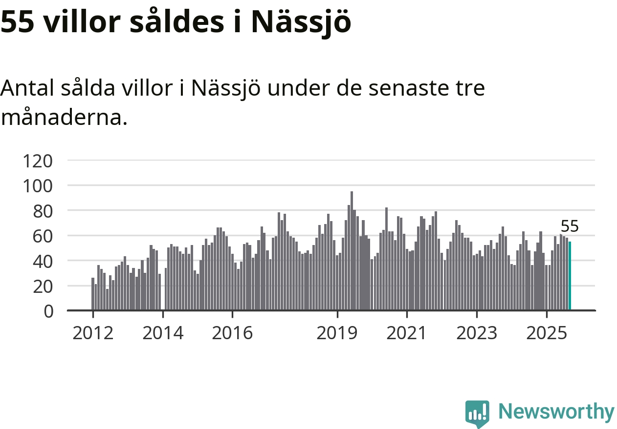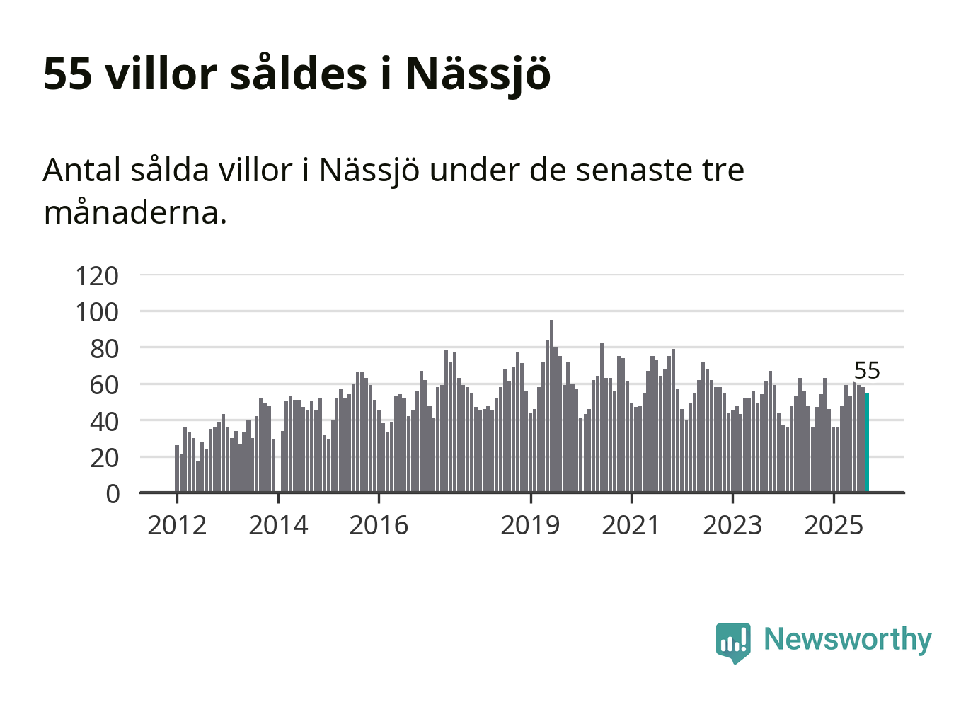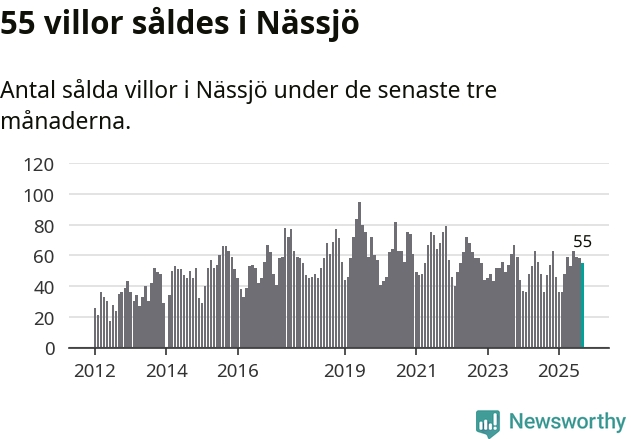 Sammanlagt såldes 55 villor i Nässjö kommun mellan juli och september till ett genomsnittligt pris på 2,1 miljoner kronor. I fjol gjordes 47 affärer vid den här tiden på året.