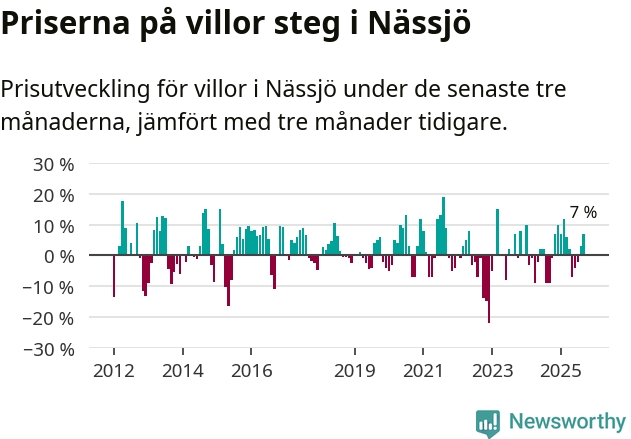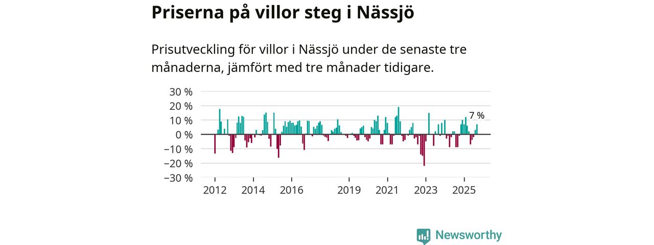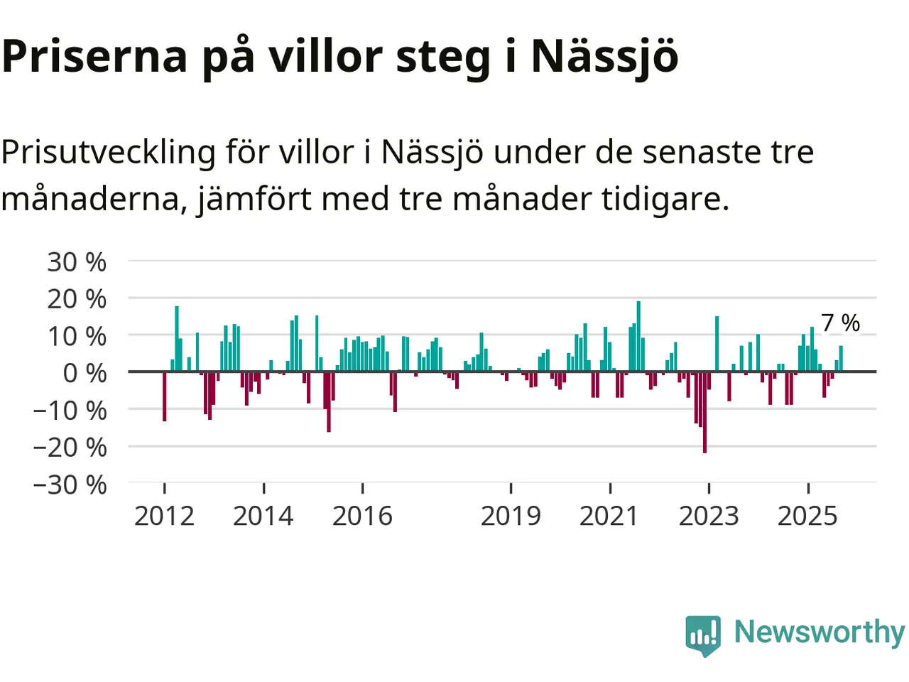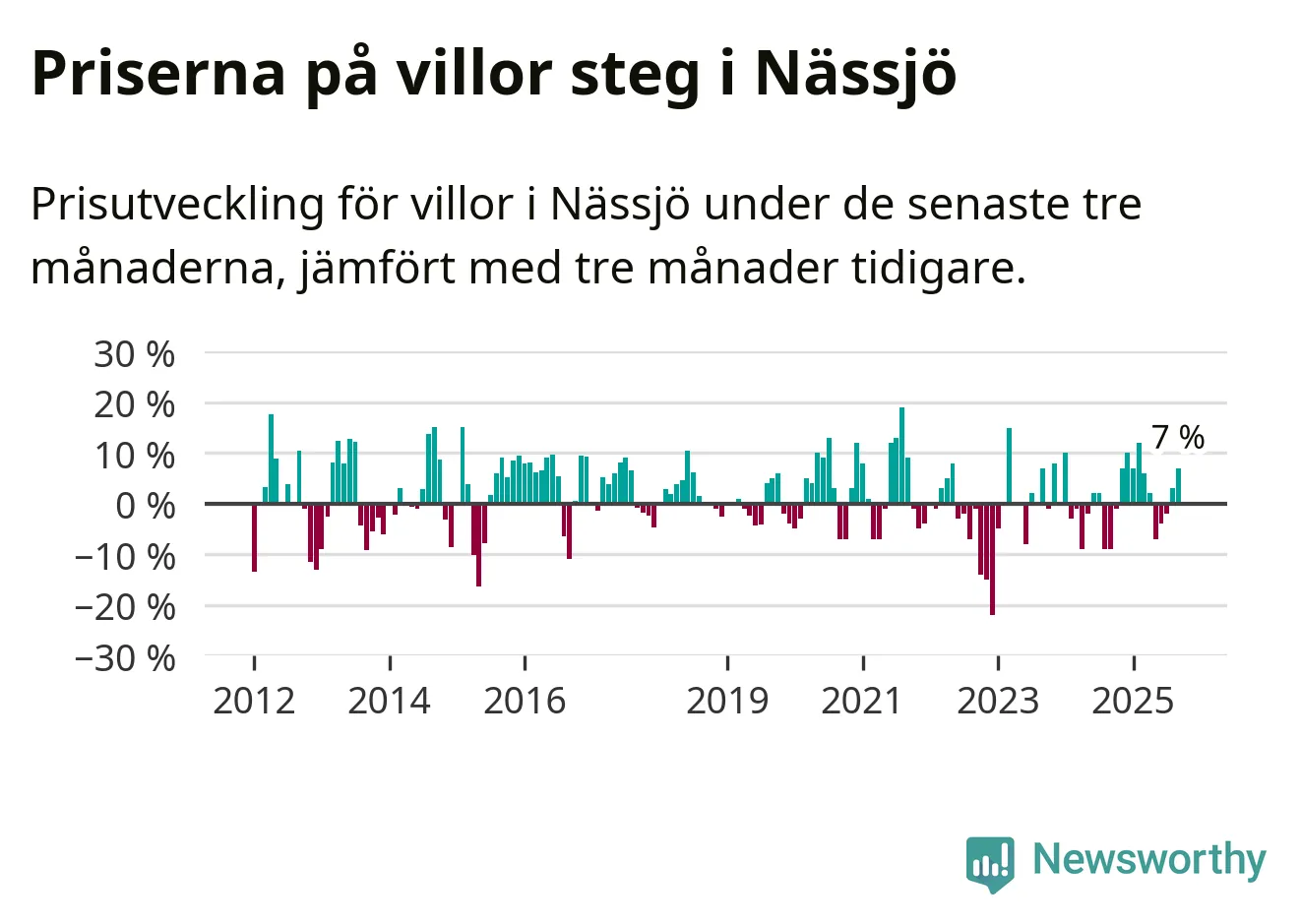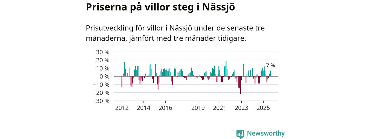 Villapriserna har gått upp i Nässjö kommun. Medelpriset på försäljningarna under de senaste tre månaderna visar på en uppgång med 7 procent.