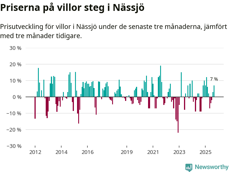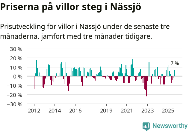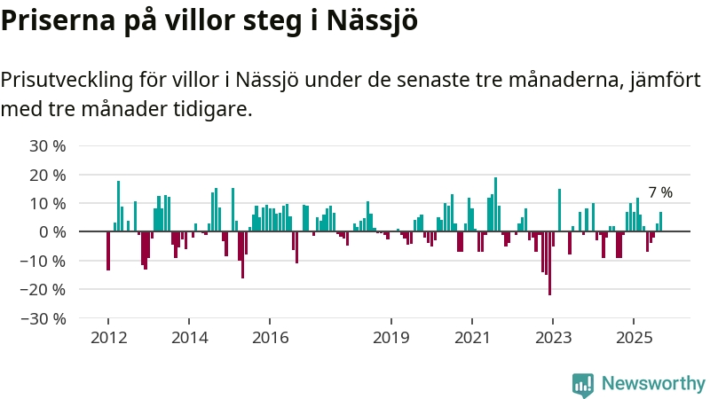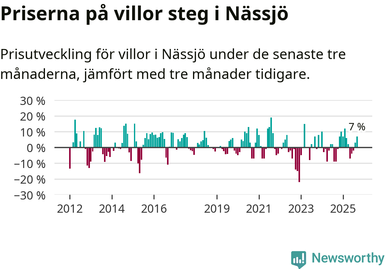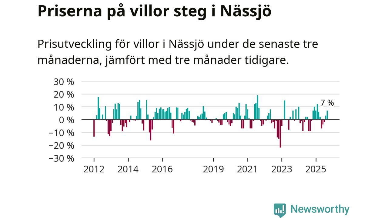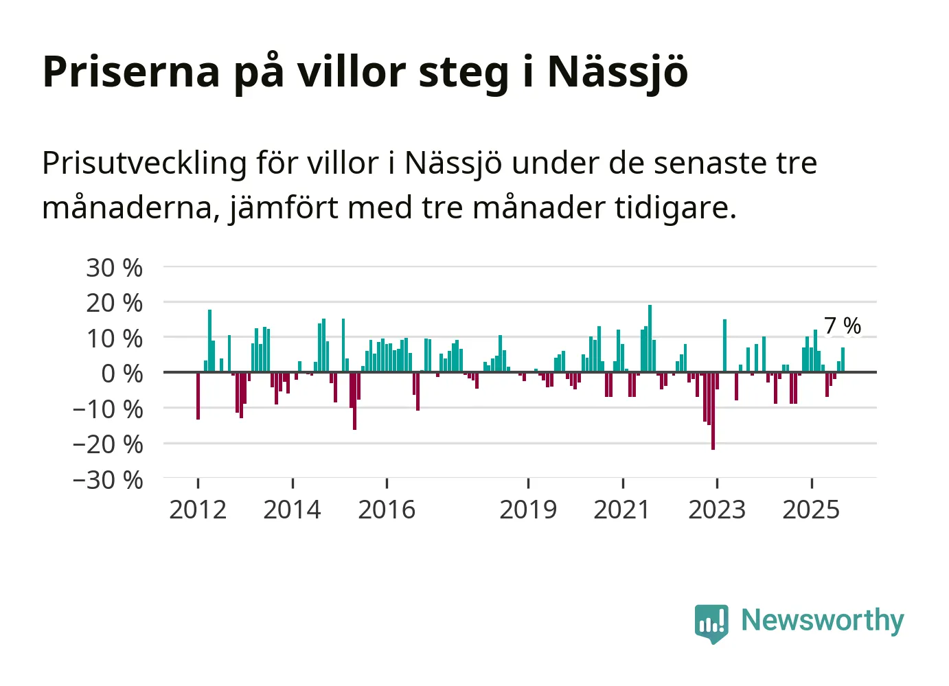 Villapriserna har gått upp i Nässjö kommun. Medelpriset på försäljningarna under de senaste tre månaderna visar på en uppgång med 7 procent.