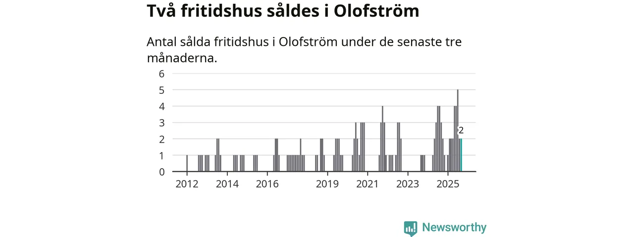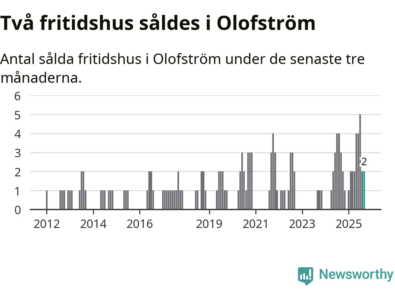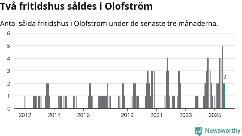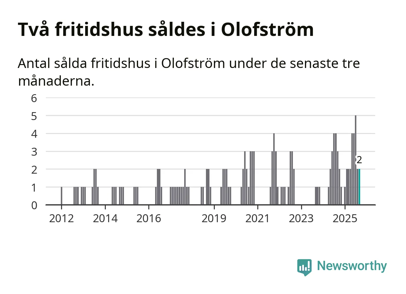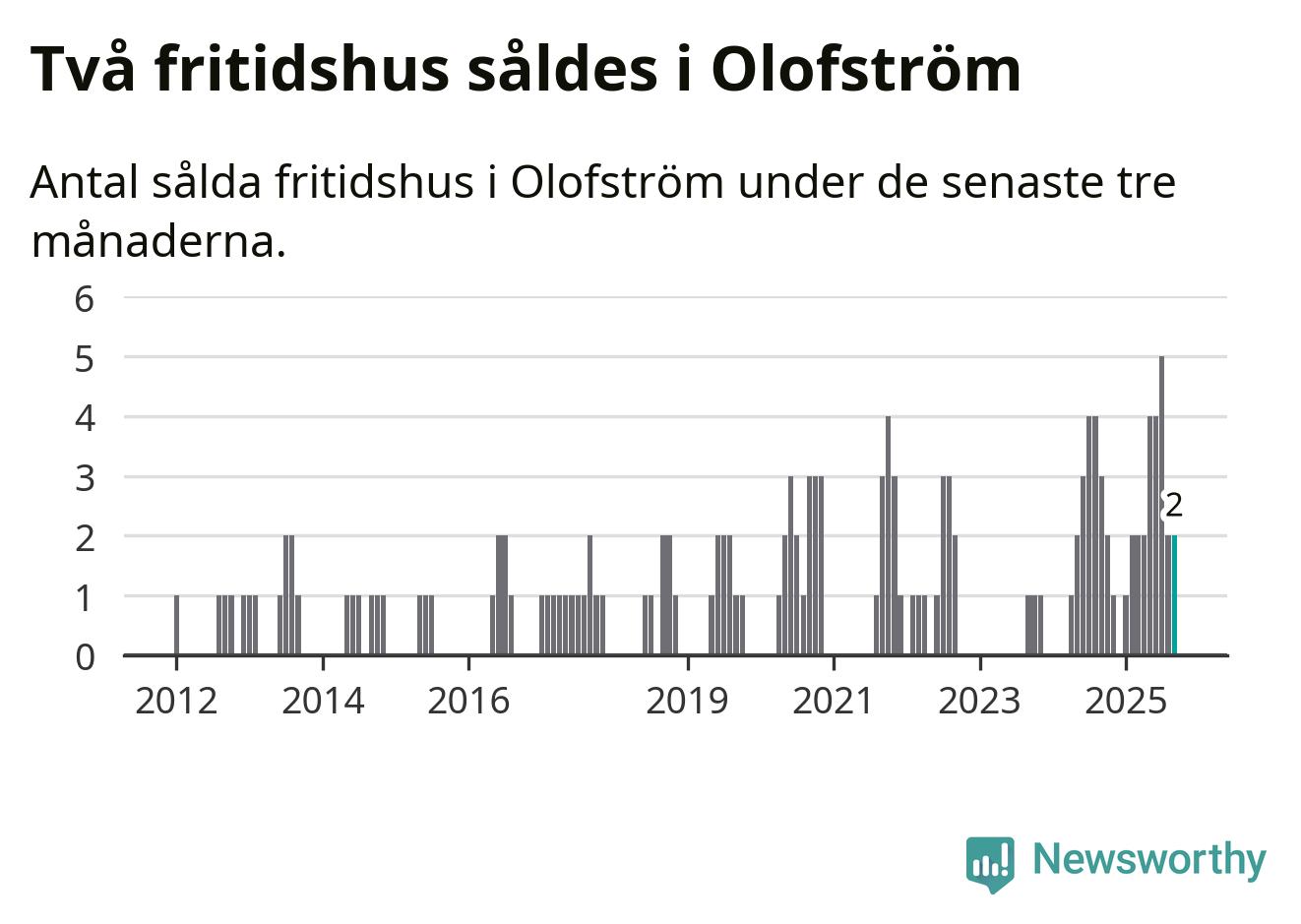 Mellan juli och september gjordes sammanlagt två affärer med fritidshus i Olofströms kommun. Det kan jämföras med tre vid motsvarande tid i fjol.