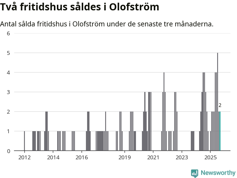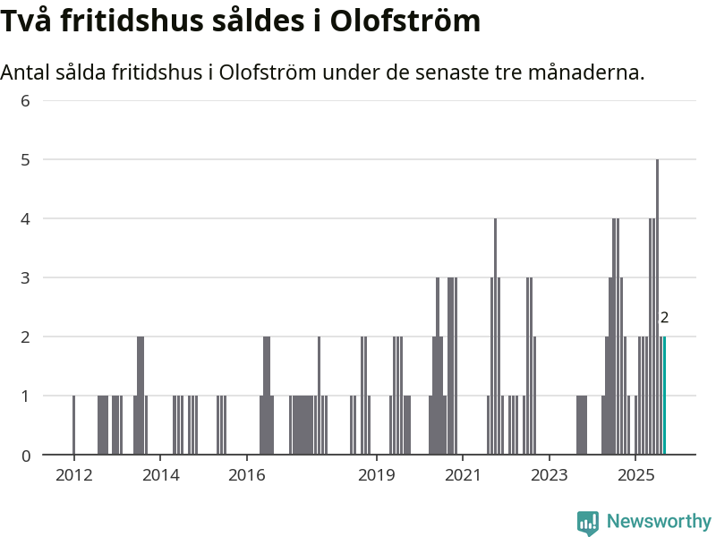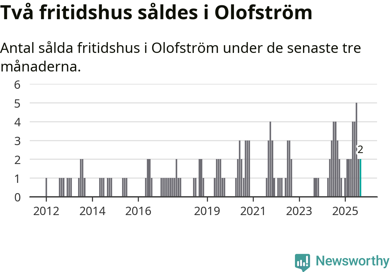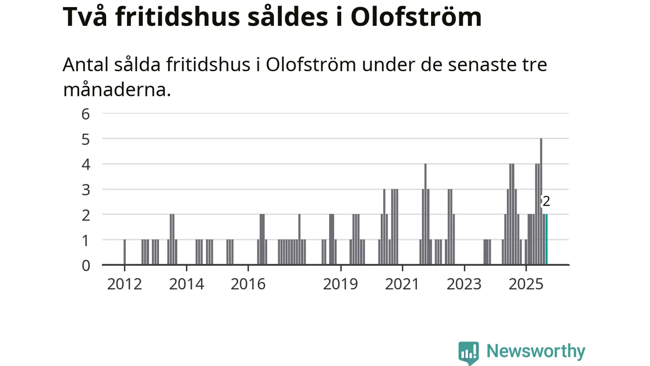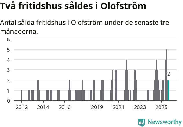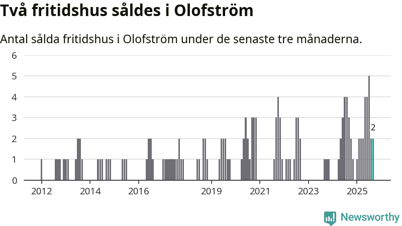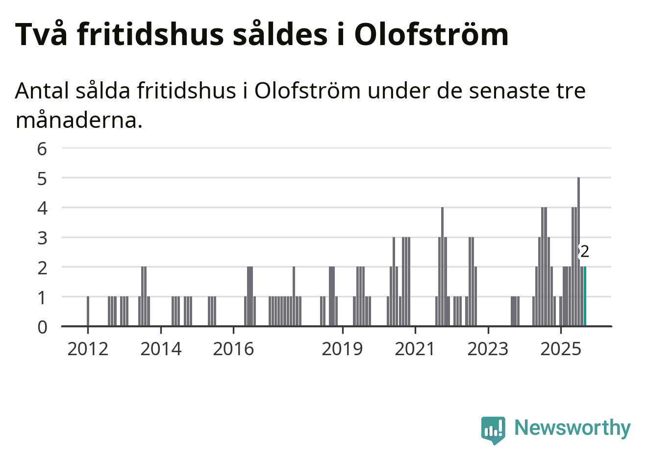 Mellan juli och september gjordes sammanlagt två affärer med fritidshus i Olofströms kommun. Det kan jämföras med tre vid motsvarande tid i fjol.