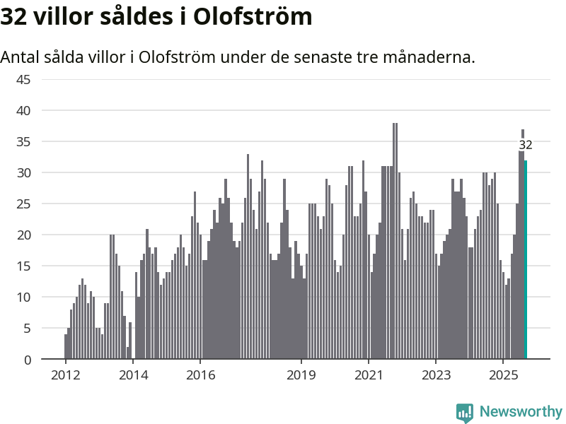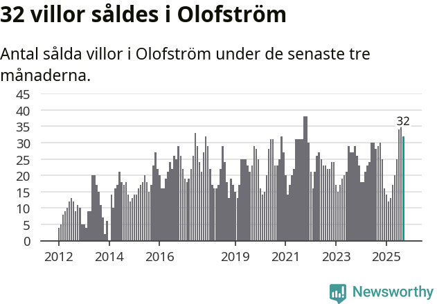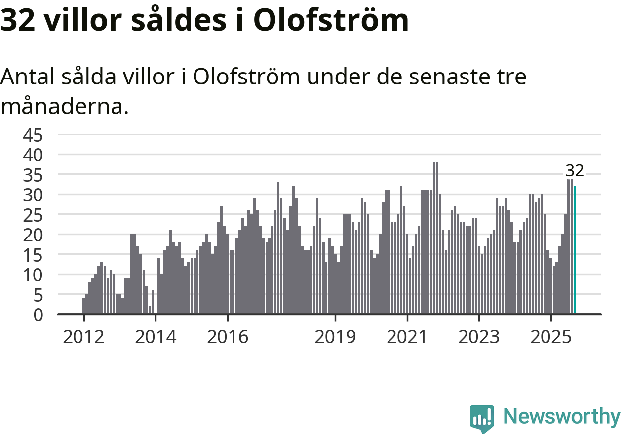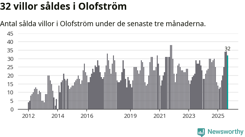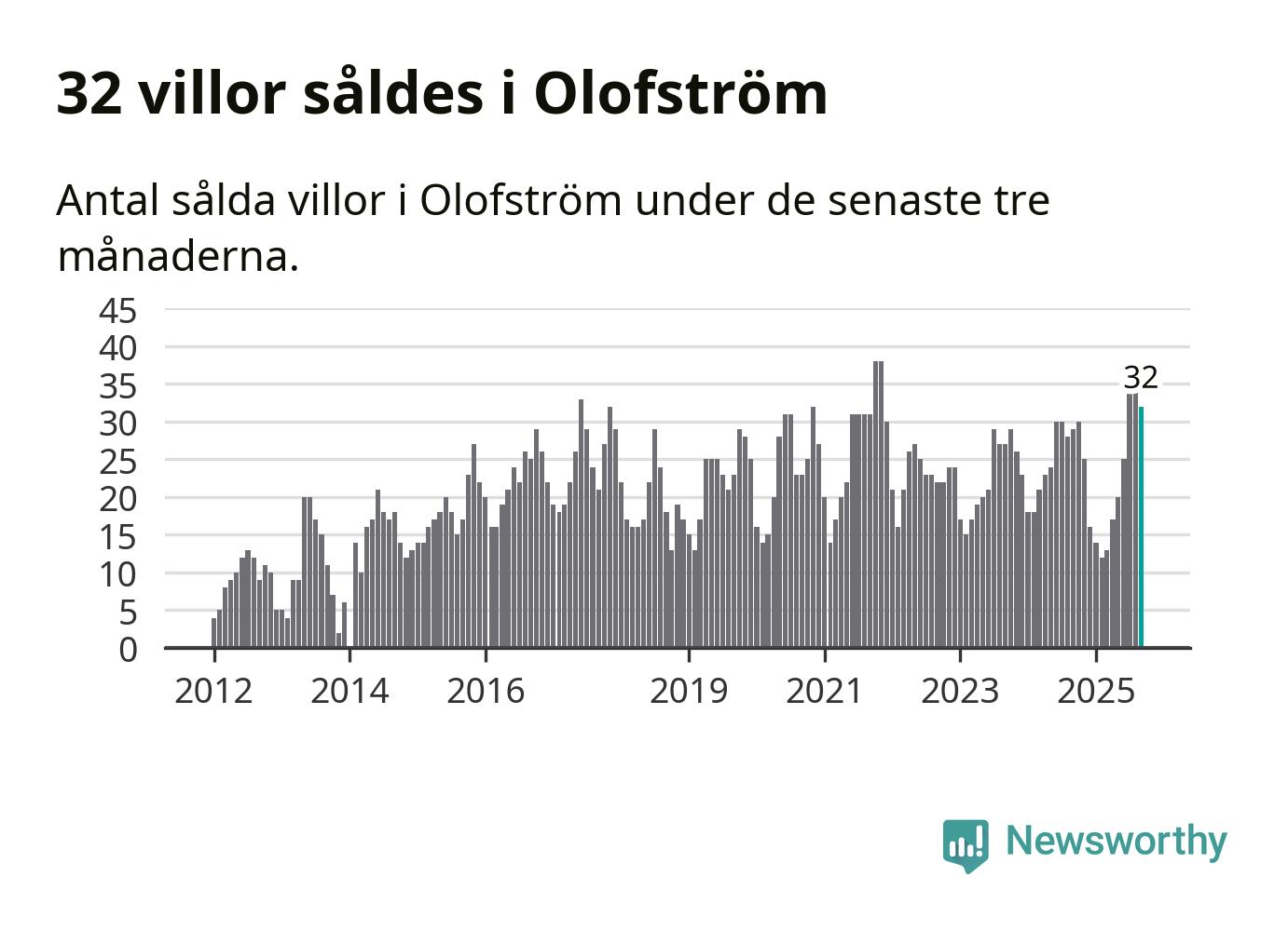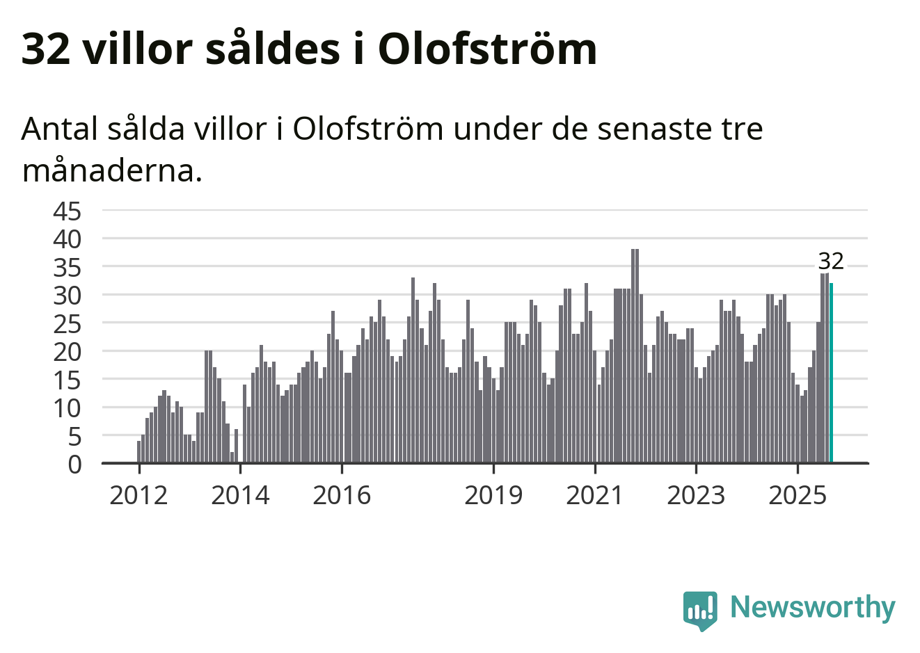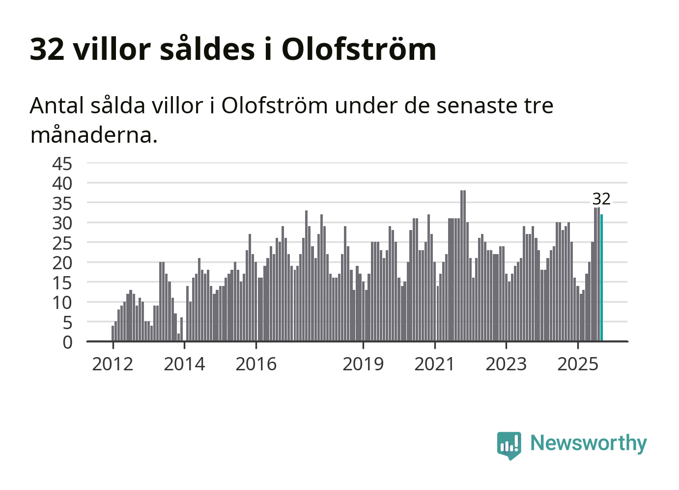 Mellan juli och september såldes 32 villor i Olofströms kommun. Det är relativt många sett till aktiviteten på bostadsmarknaden i kommunen under de senaste tolv månaderna, samt det historiska snittet för den här tiden på året.