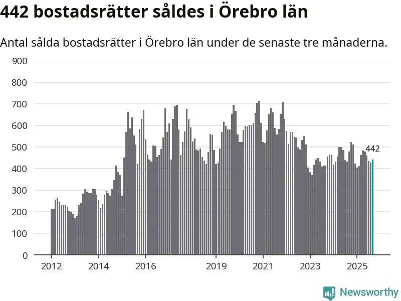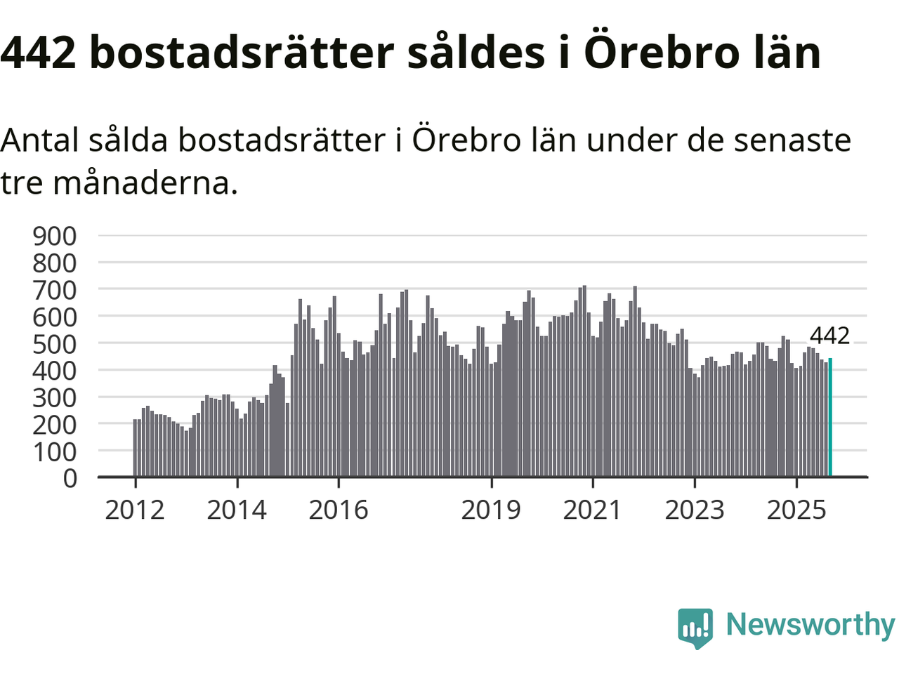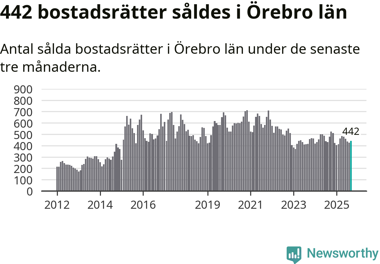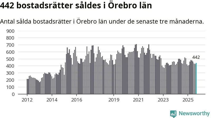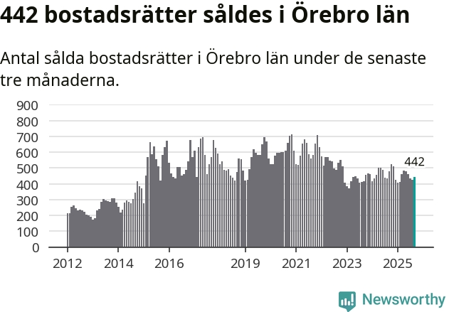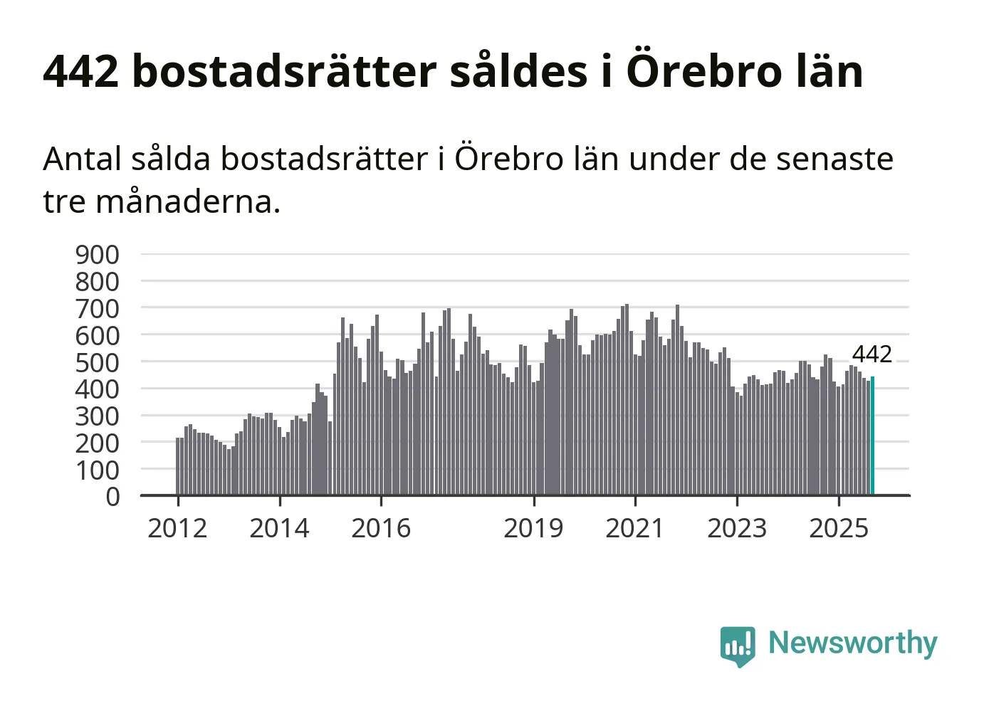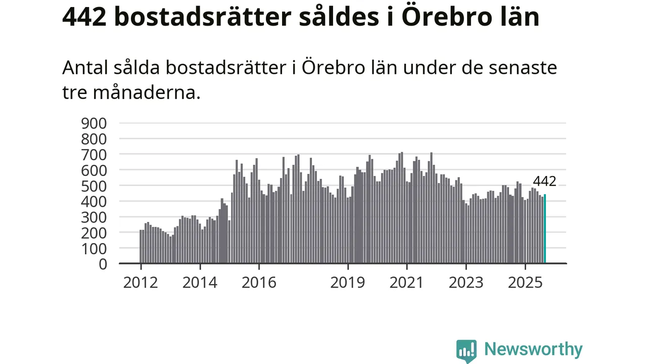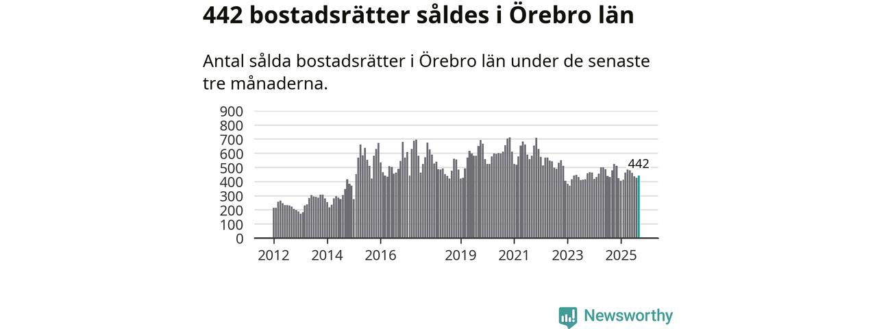 Sammanlagt såldes 442 bostadsrätter i Örebro län mellan juli och september till ett genomsnittligt pris på 1,5 miljoner kronor. I fjol gjordes 478 affärer vid den här tiden på året.