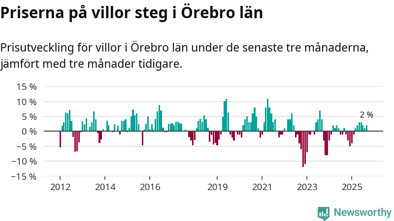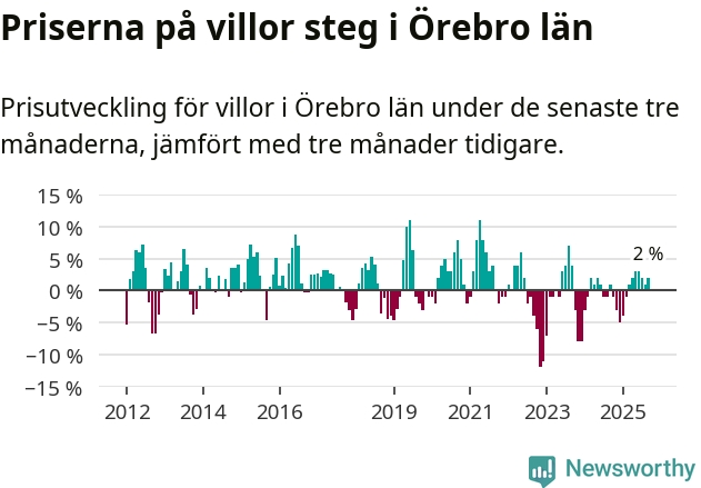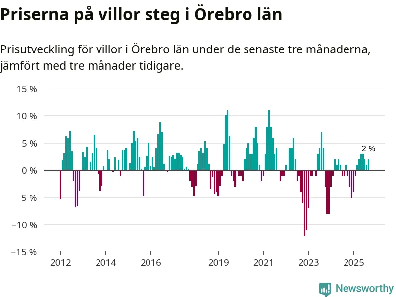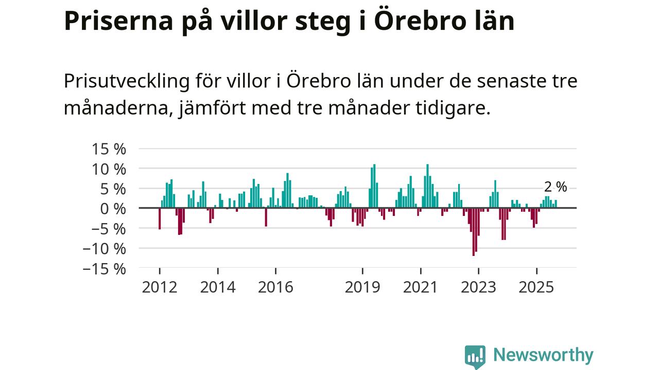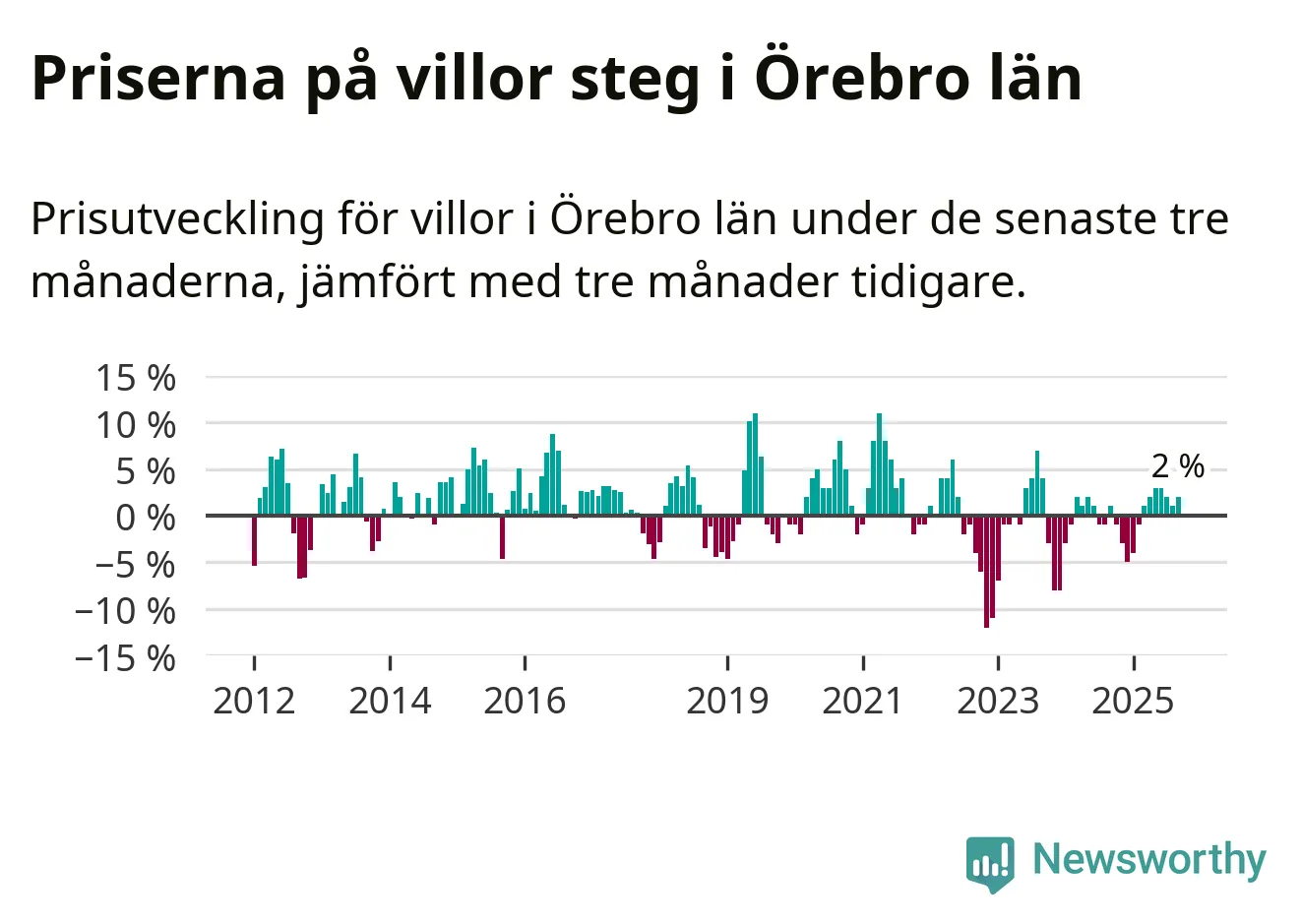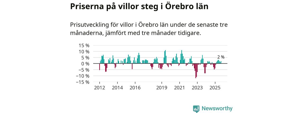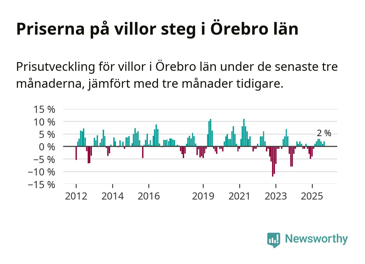 Villapriserna har gått upp i Örebro län. Medelpriset på försäljningarna under de senaste tre månaderna visar på en uppgång med 2 procent.