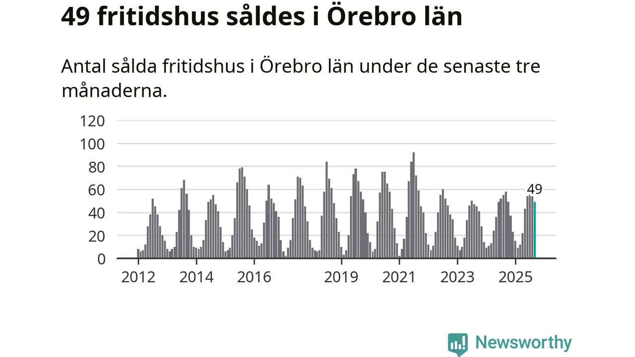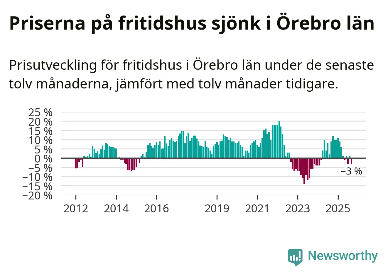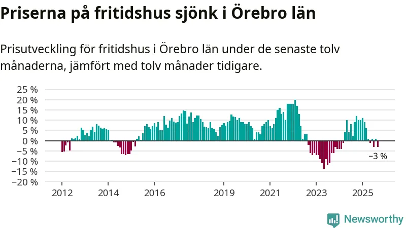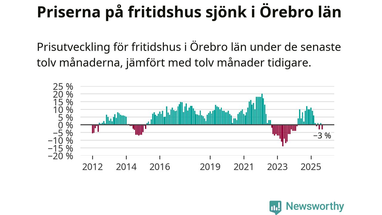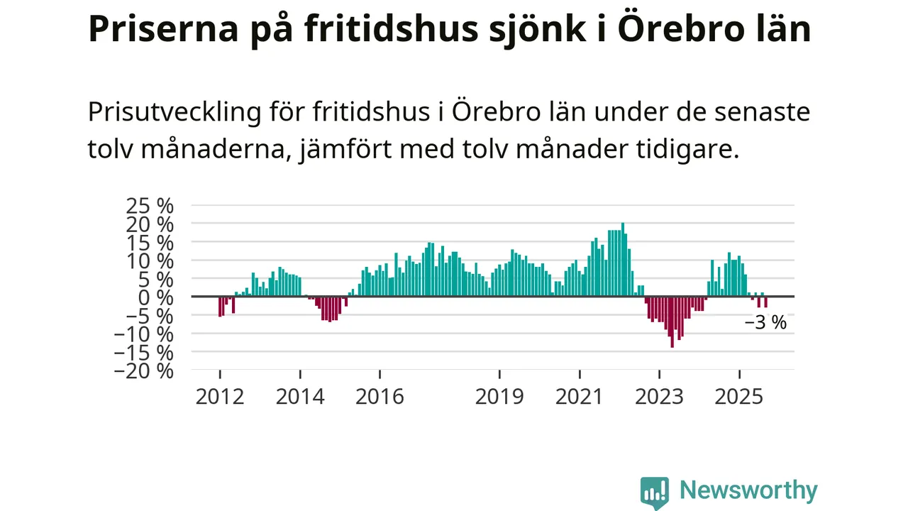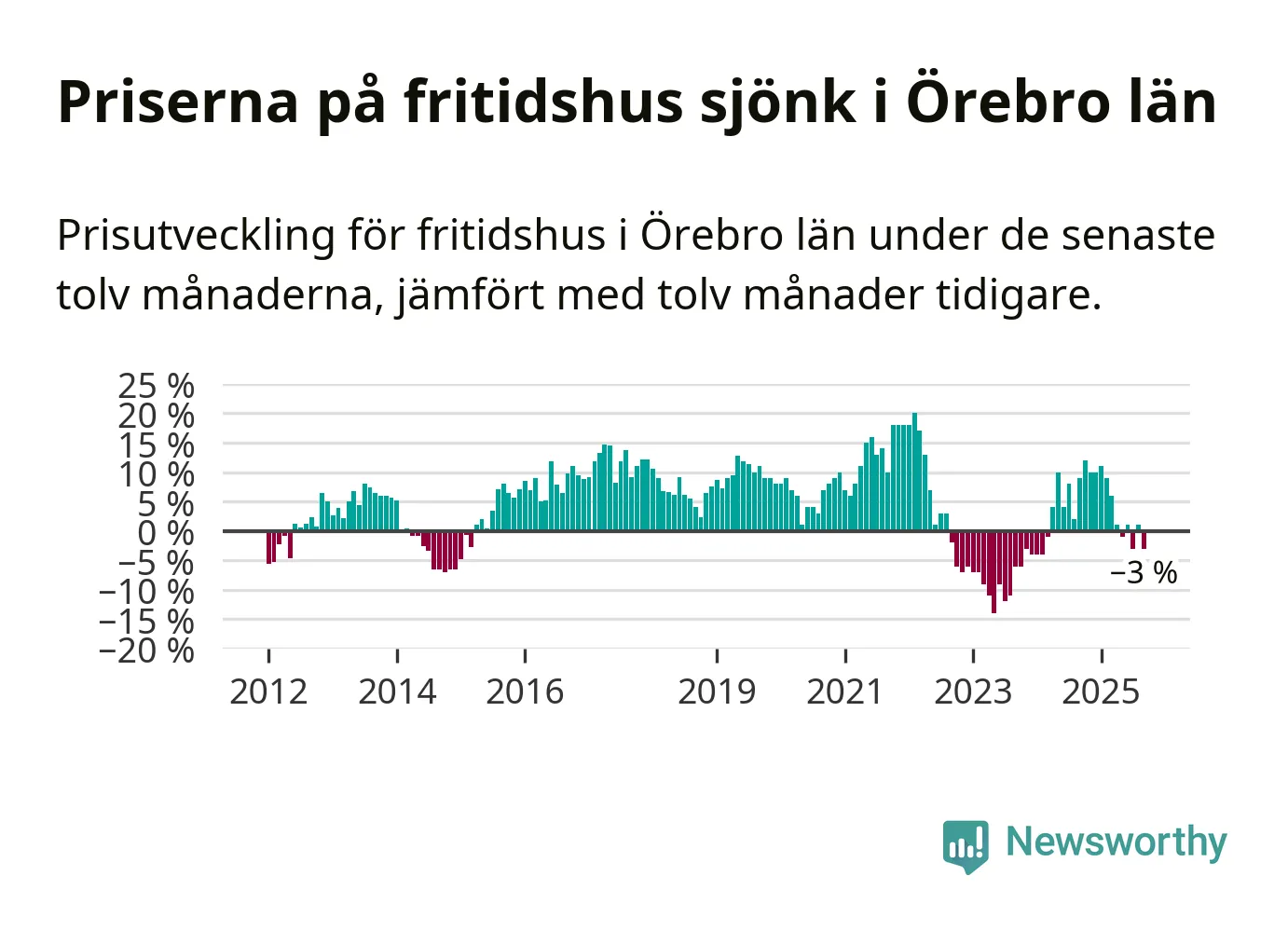Priserna på fritidshus sjönk mellan oktober 2024 och september med 3 procent i Örebro län. Det är en betydande nedgång jämfört med det gångna året då priserna i snitt ökat med 5 procent.