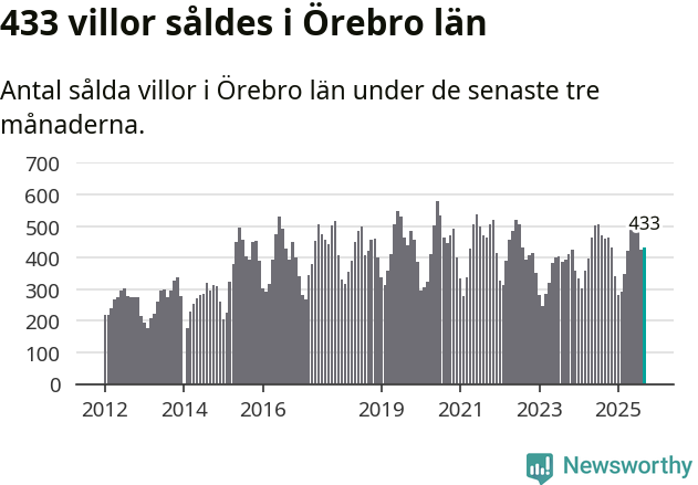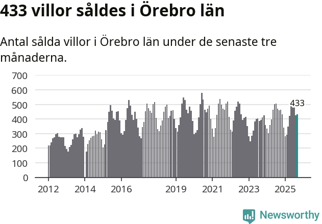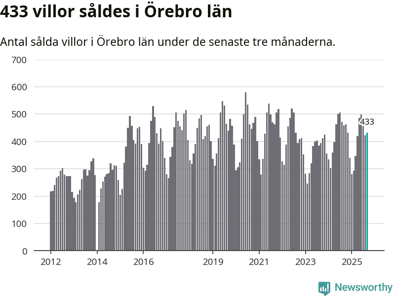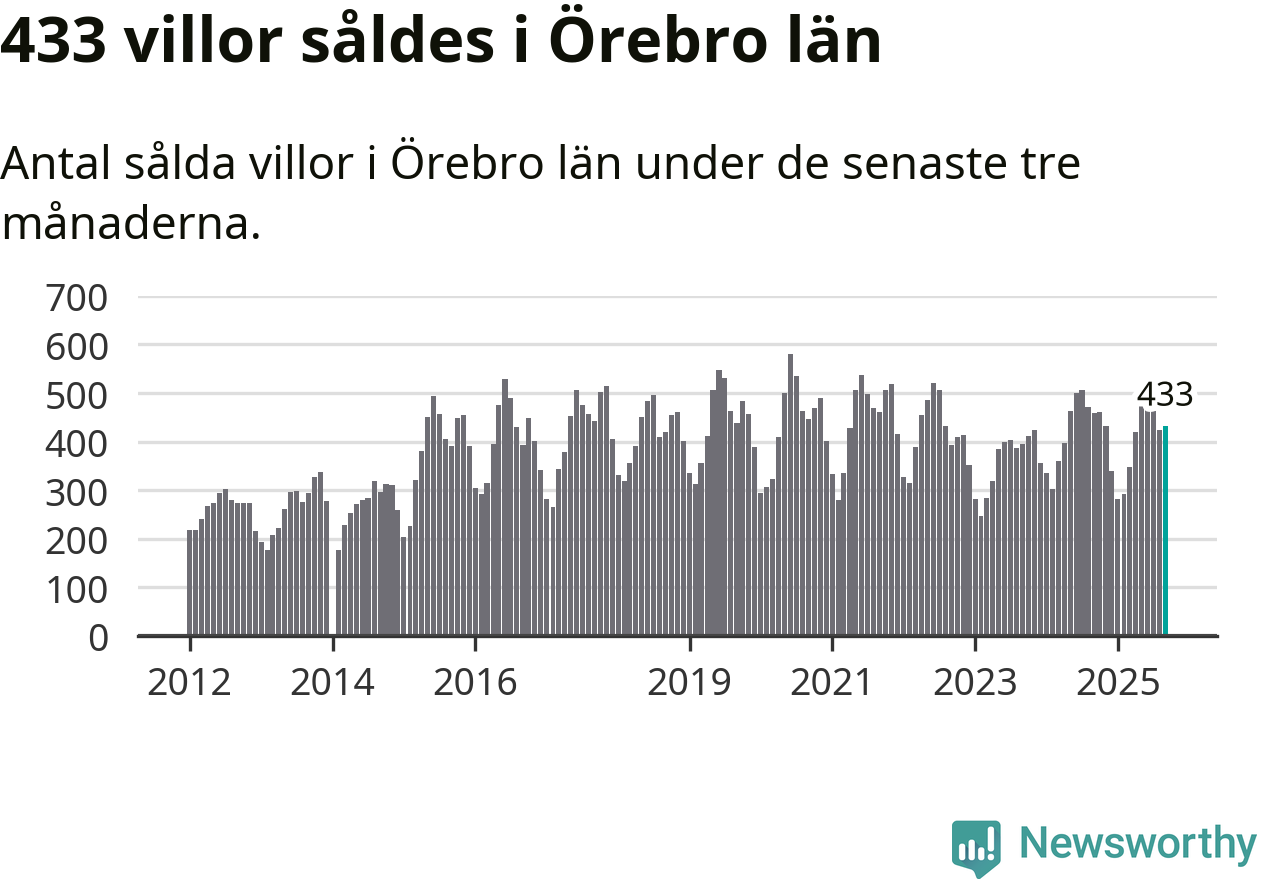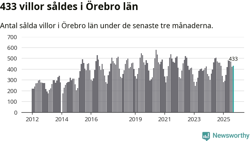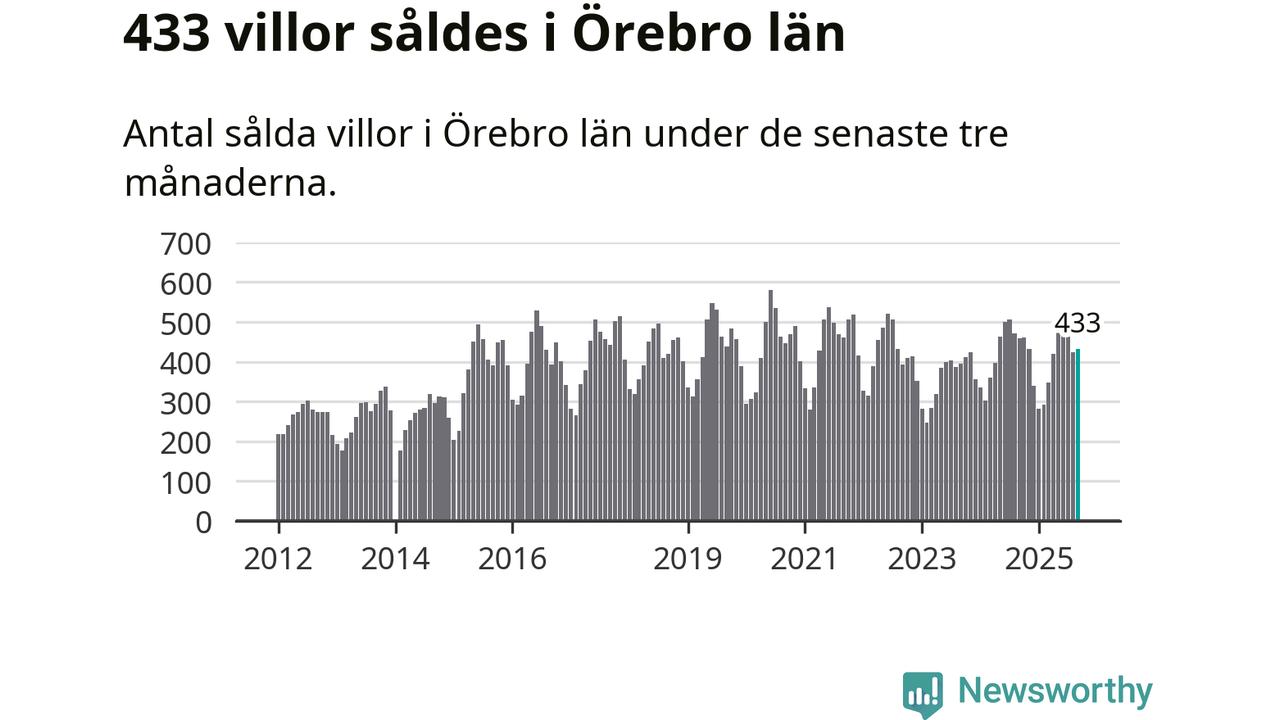 Sammanlagt såldes 433 villor i Örebro län mellan juli och september till ett genomsnittligt pris på 2,5 miljoner kronor. I fjol gjordes 460 affärer vid den här tiden på året.