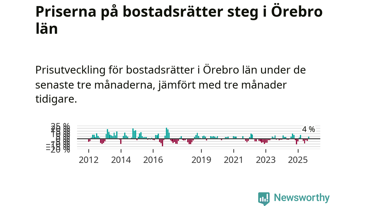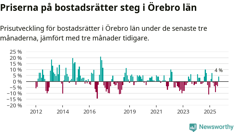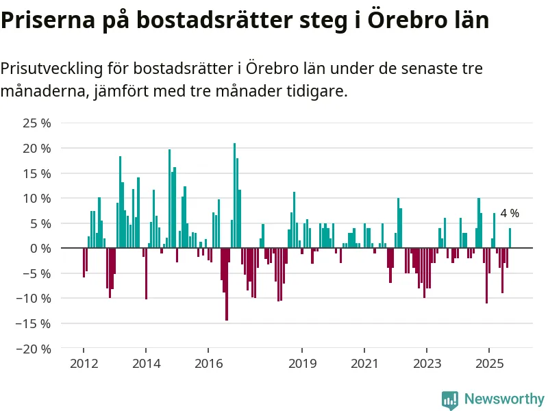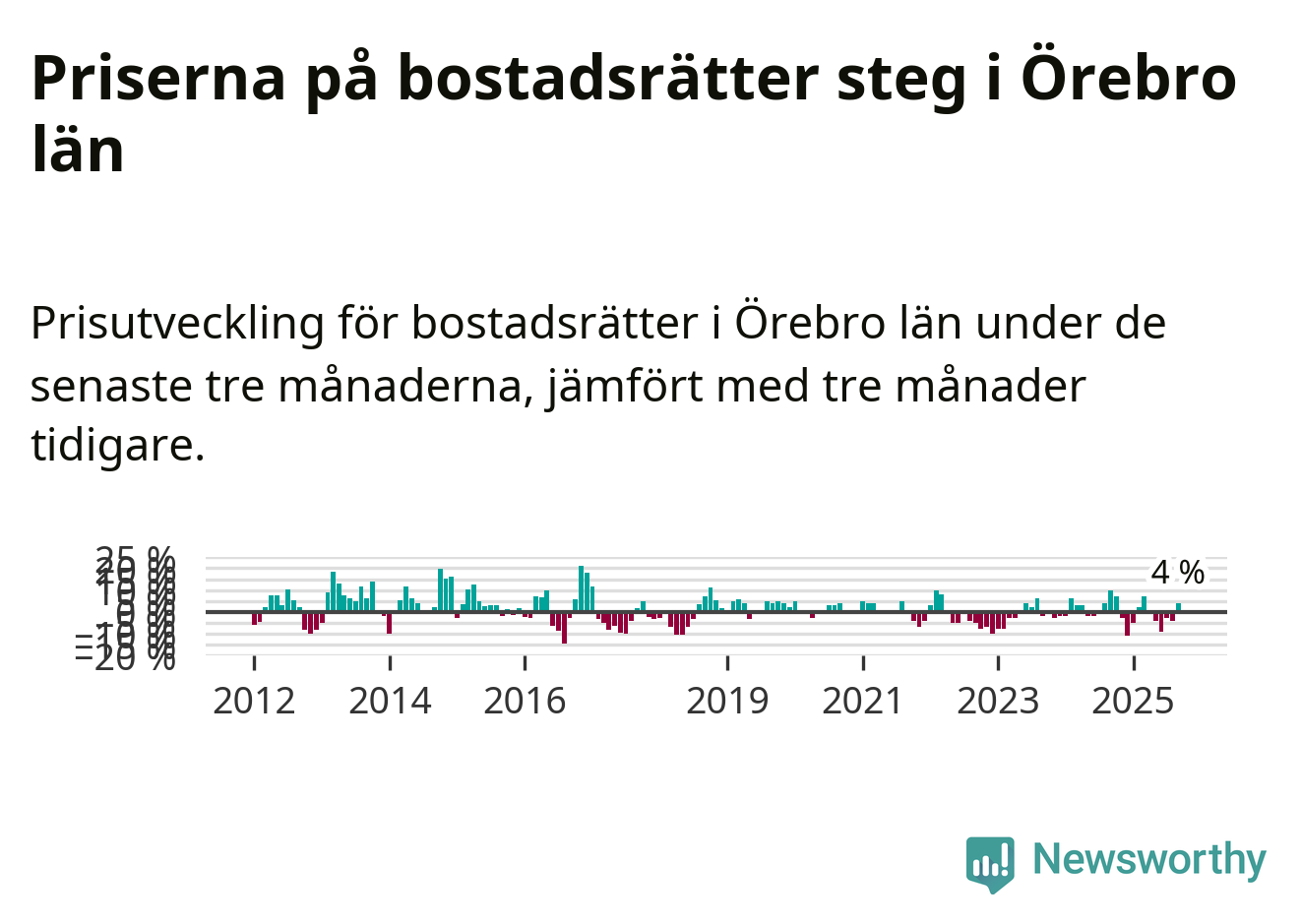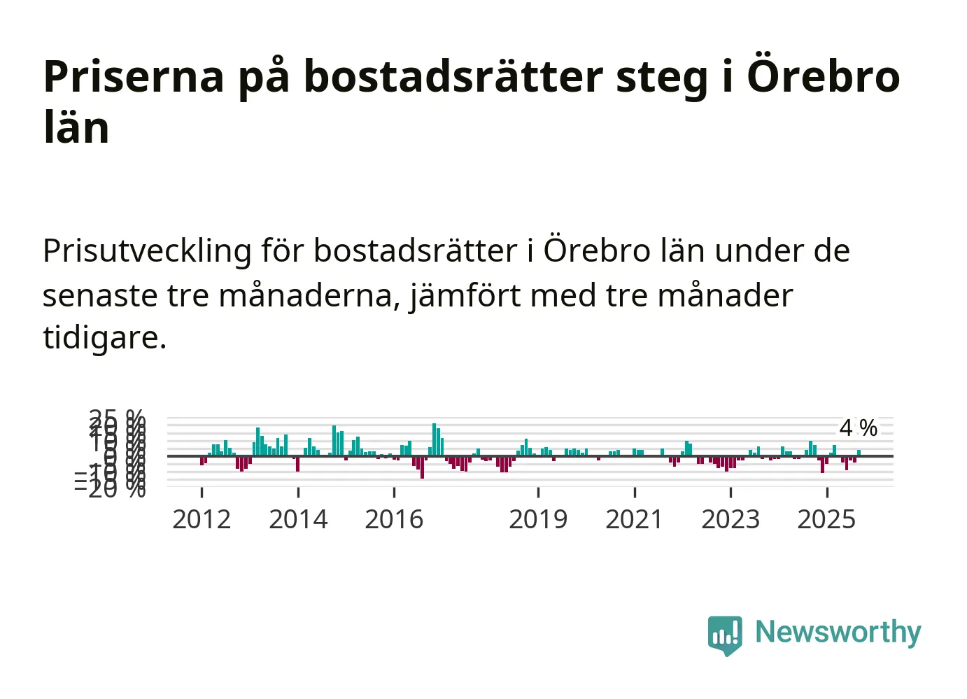 Priserna på bostadsrätter har gått upp i Örebro län. Medelpriset på försäljningarna under de senaste tre månaderna visar på en uppgång med 4 procent.