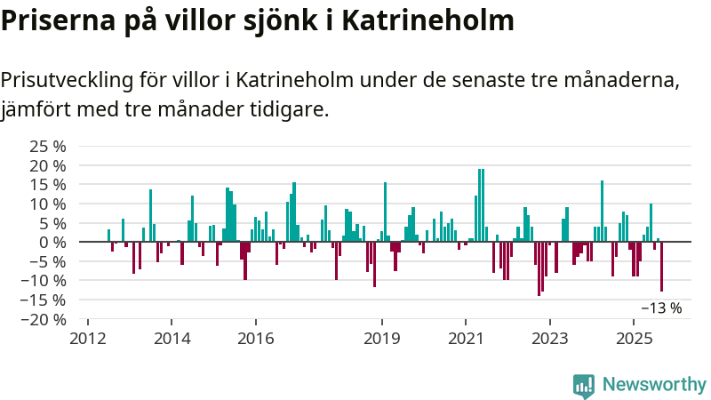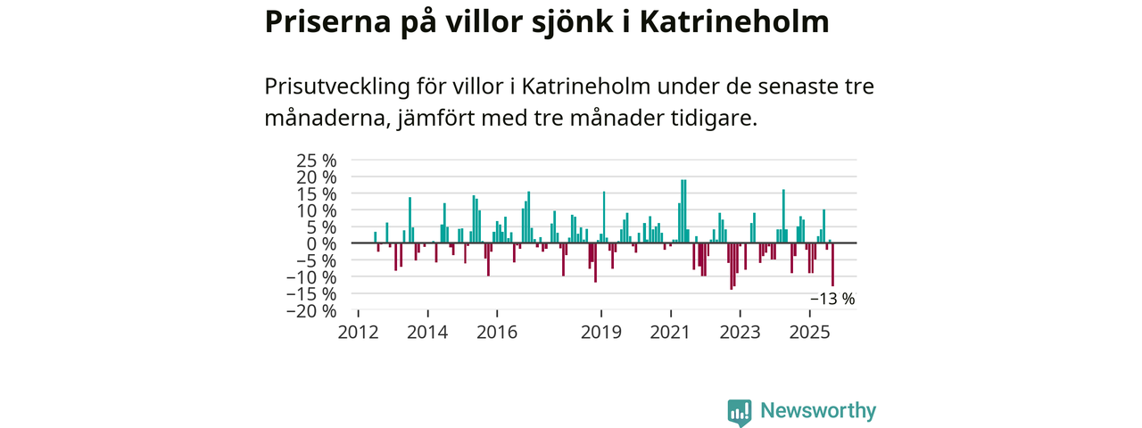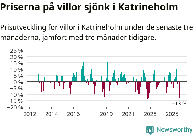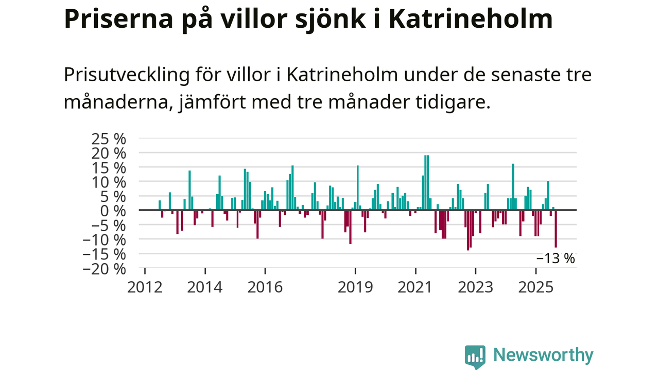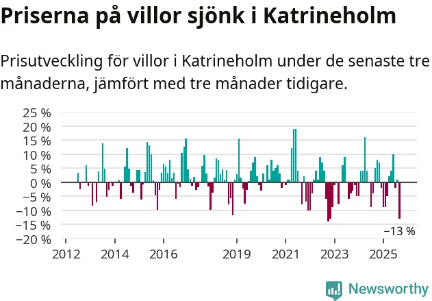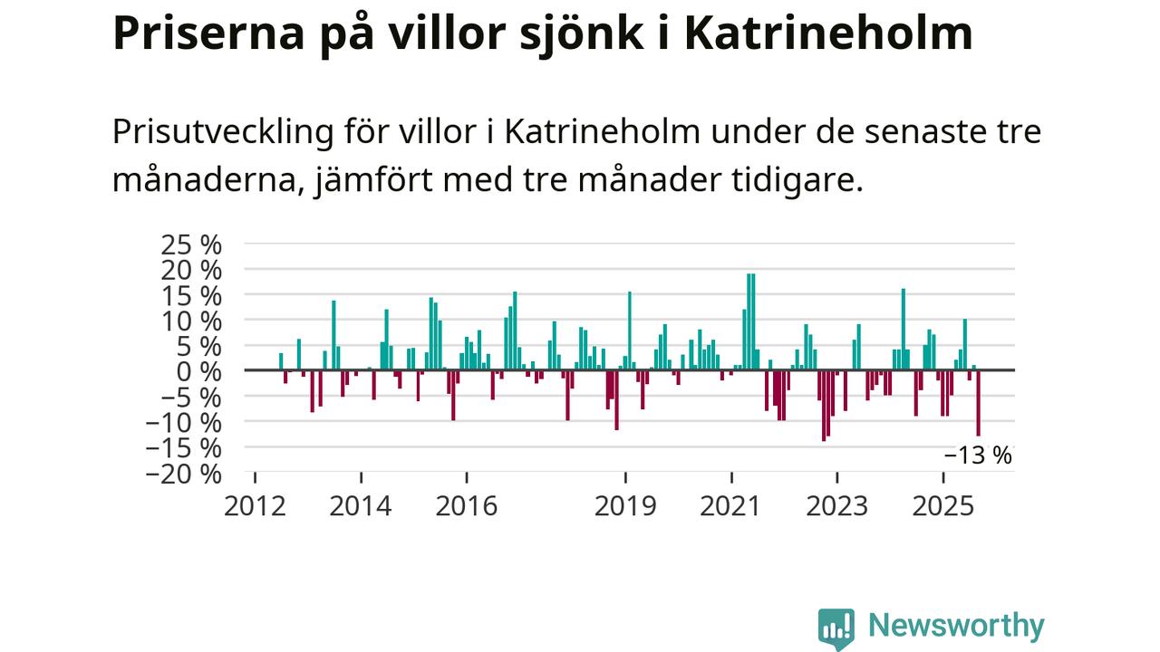 Villapriserna sjönk mellan juli och september med 13 procent i Katrineholms kommun. Det är en betydande nedgång jämfört med det gångna året då priserna i snitt sjunkit med 1 procent.