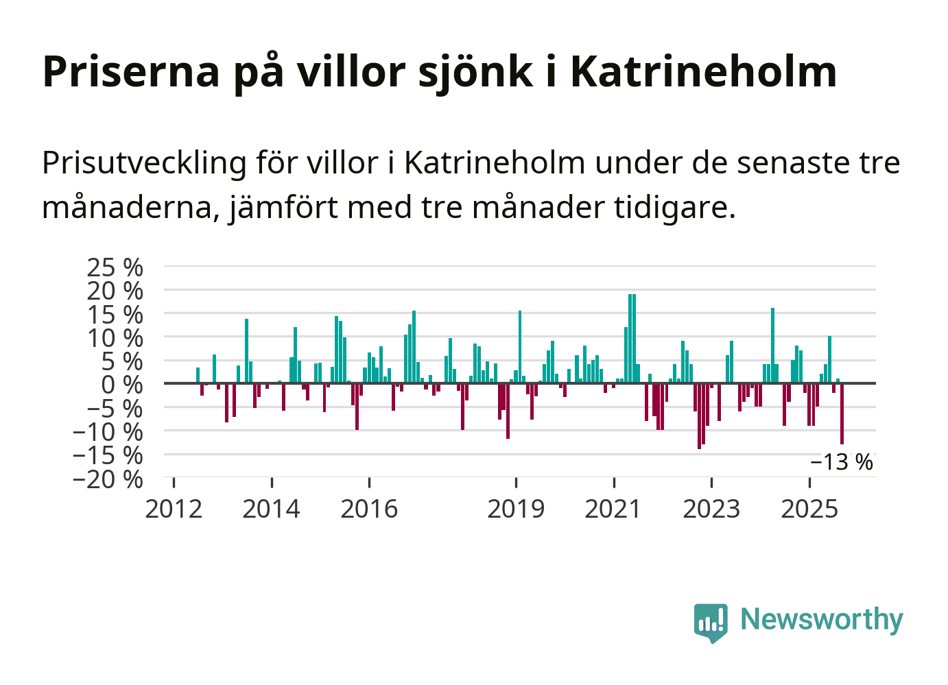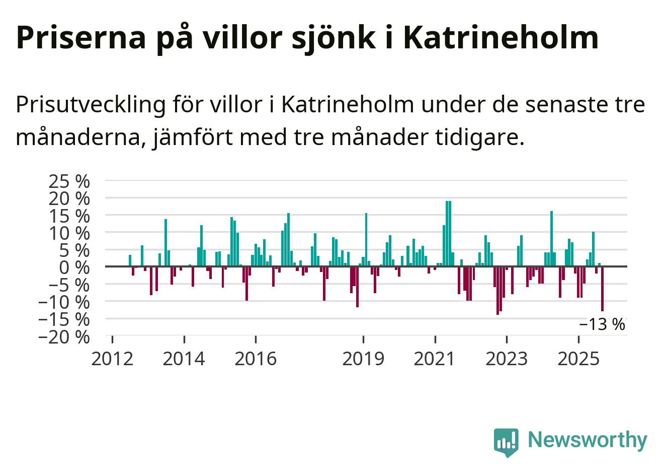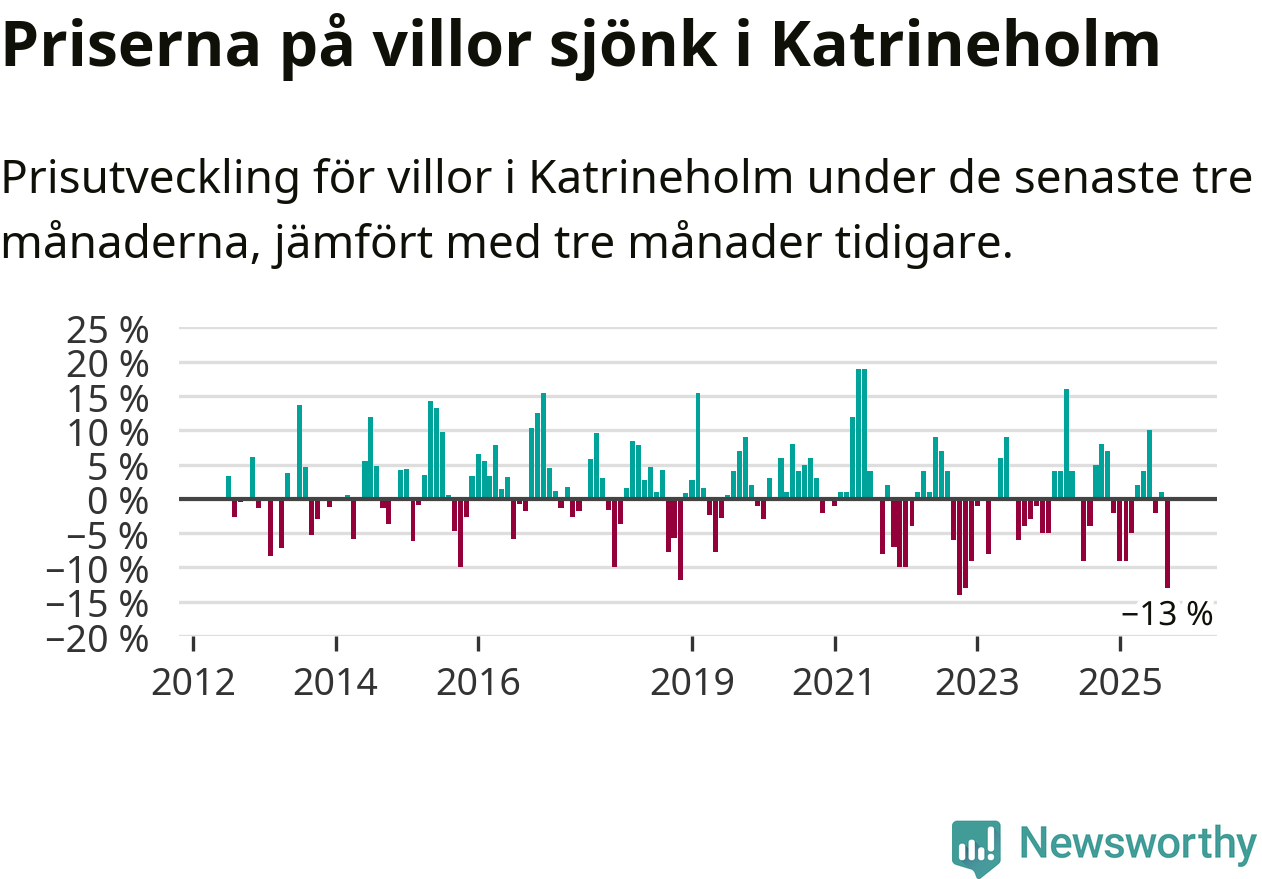 Villapriserna sjönk mellan juli och september med 13 procent i Katrineholms kommun. Det är en betydande nedgång jämfört med det gångna året då priserna i snitt sjunkit med 1 procent.