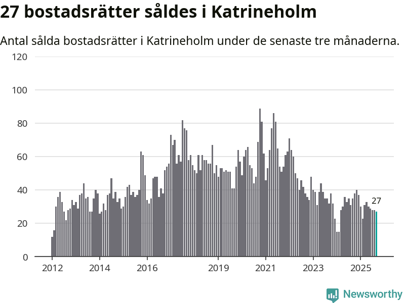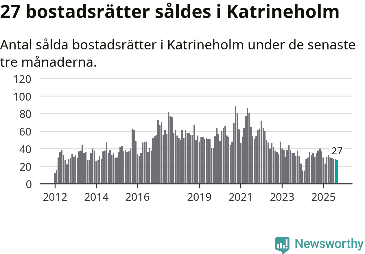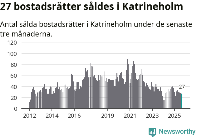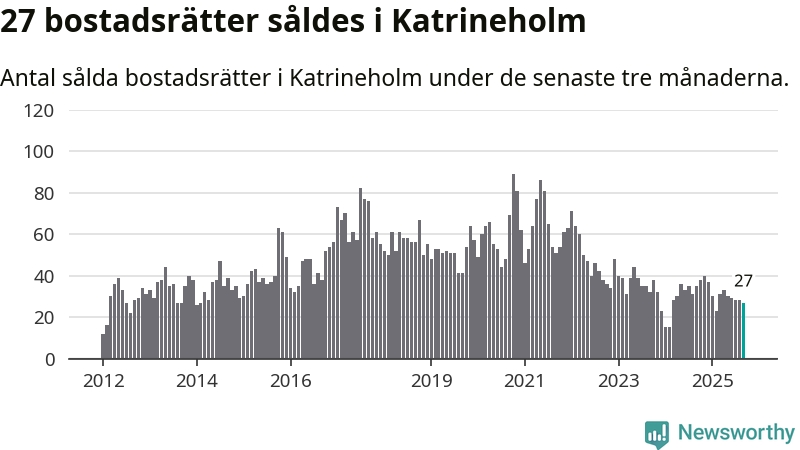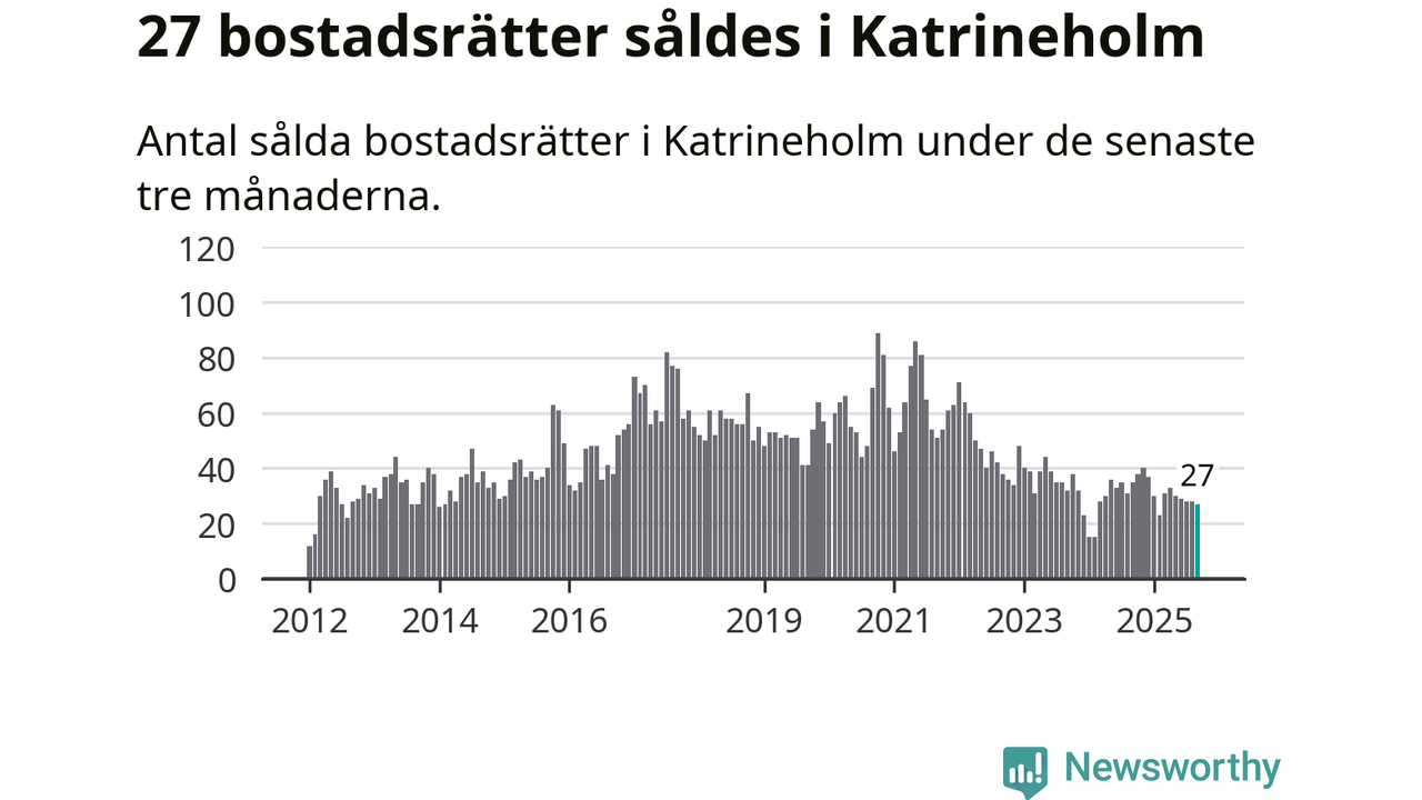Sammanlagt såldes 27 bostadsrätter i Katrineholms kommun mellan juli och september till ett genomsnittligt pris på 1,2 miljoner kronor. I fjol gjordes 35 affärer vid den här tiden på året.