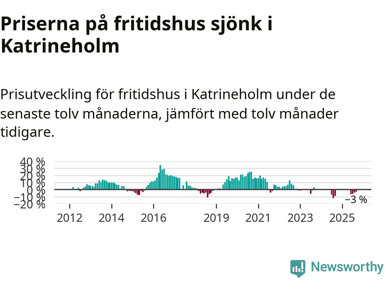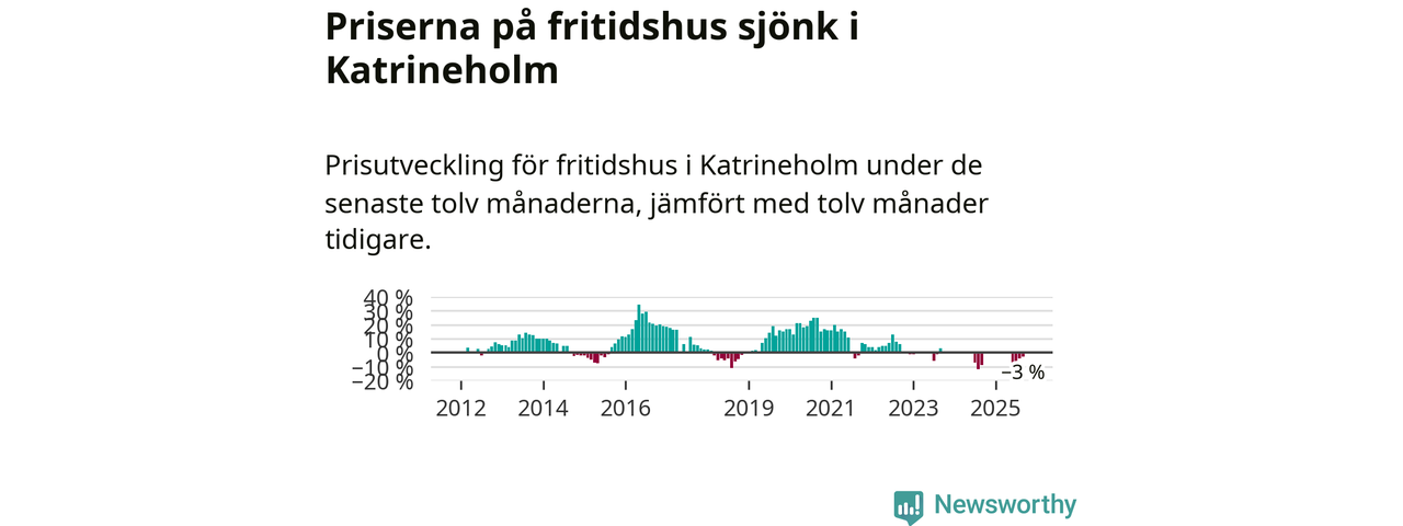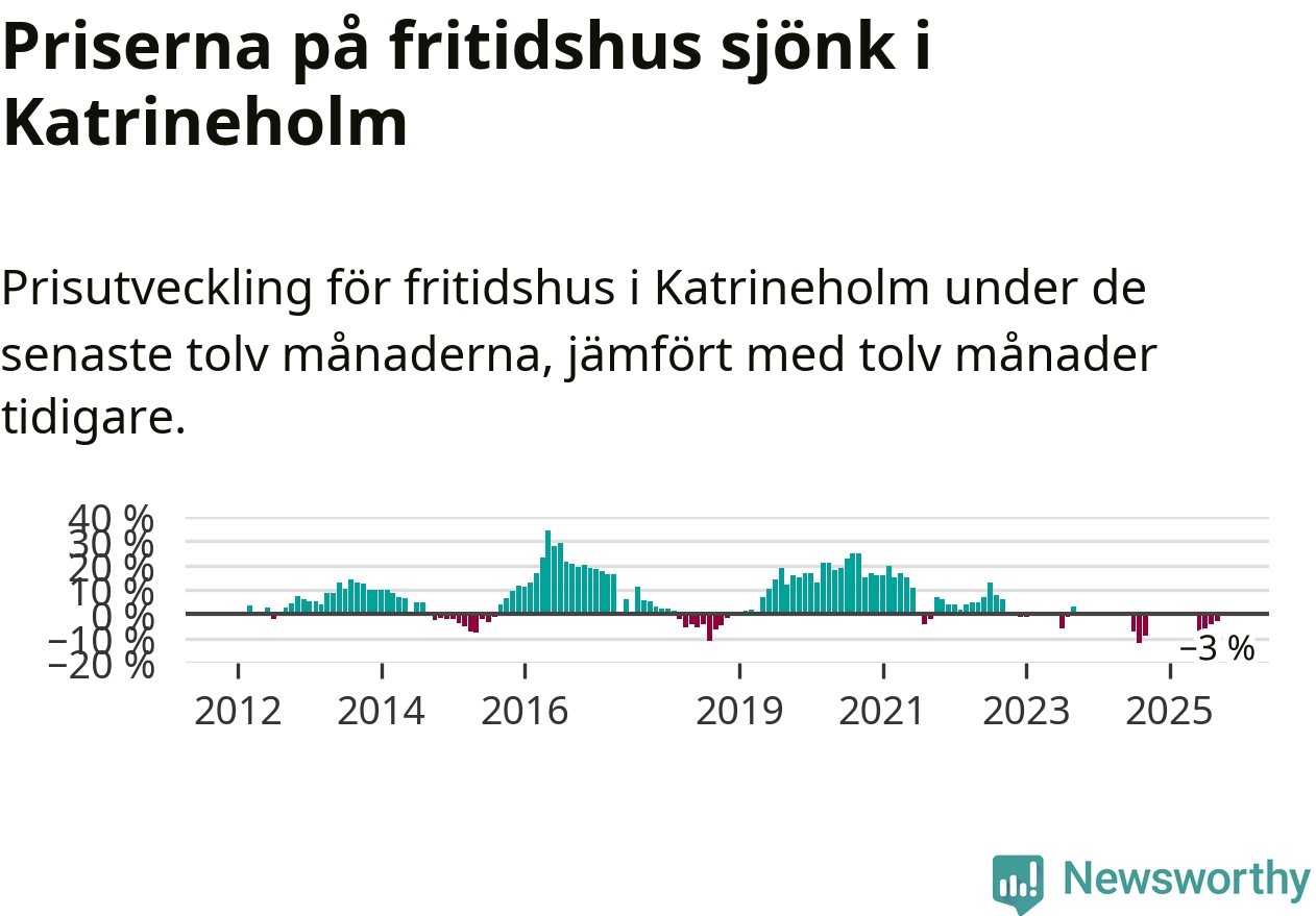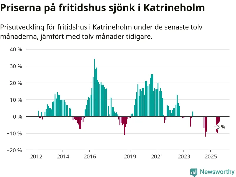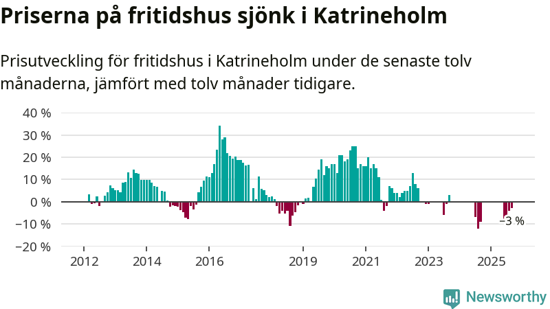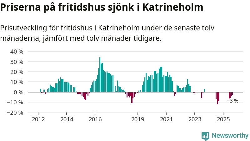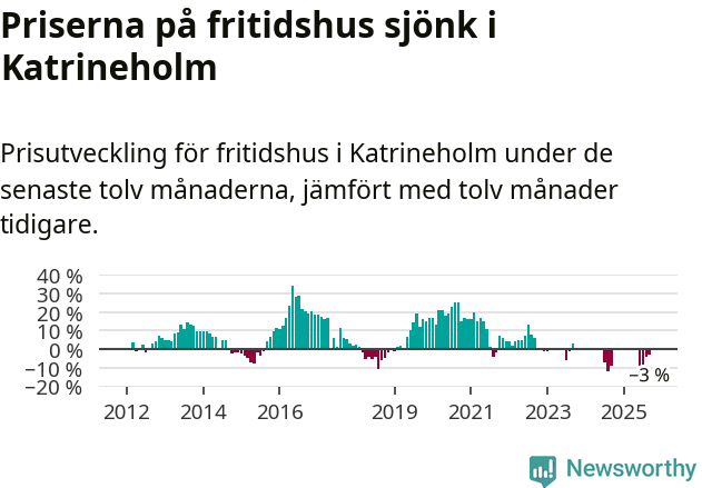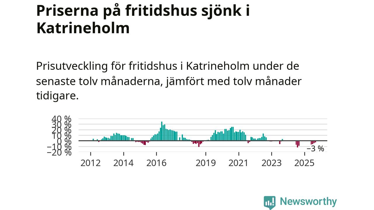 Priserna på fritidshus har gått ner i Katrineholms kommun. Medelpriset på försäljningarna under de senaste tolv månaderna visar på en nedgång med 3 procent.