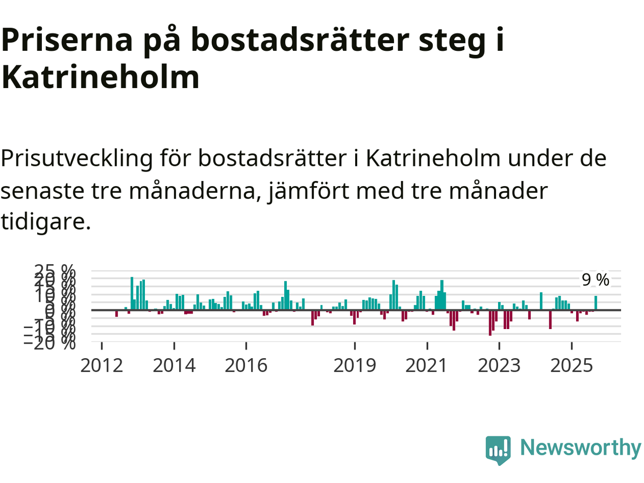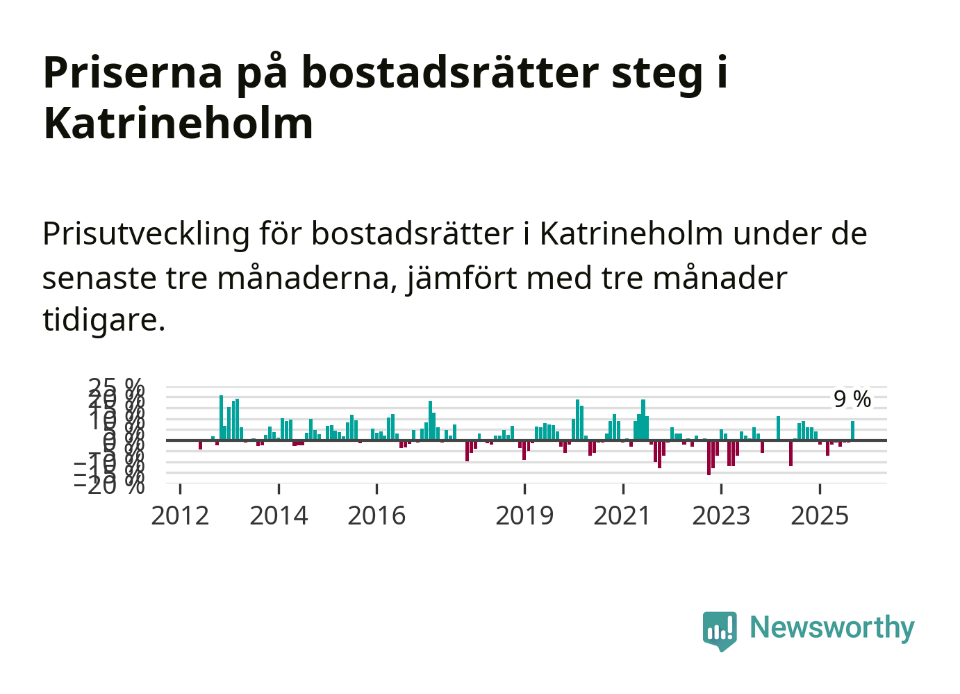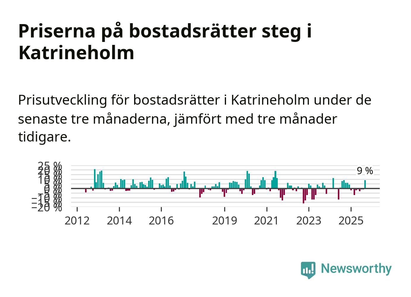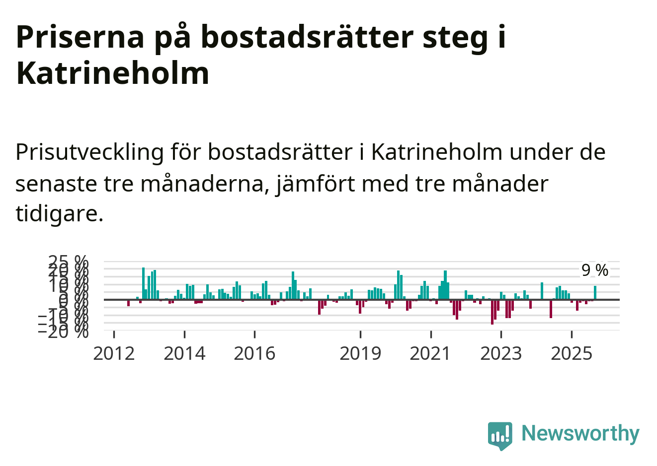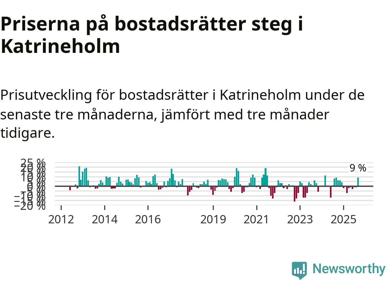 Sedan december 2024 har priserna på bostadsrätter sjunkit i Katrineholms kommun, men försäljningarna under de senaste tre månaderna visar på en uppgång med 9 procent.