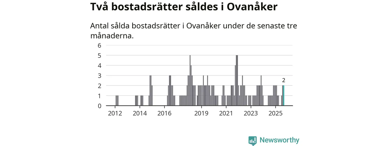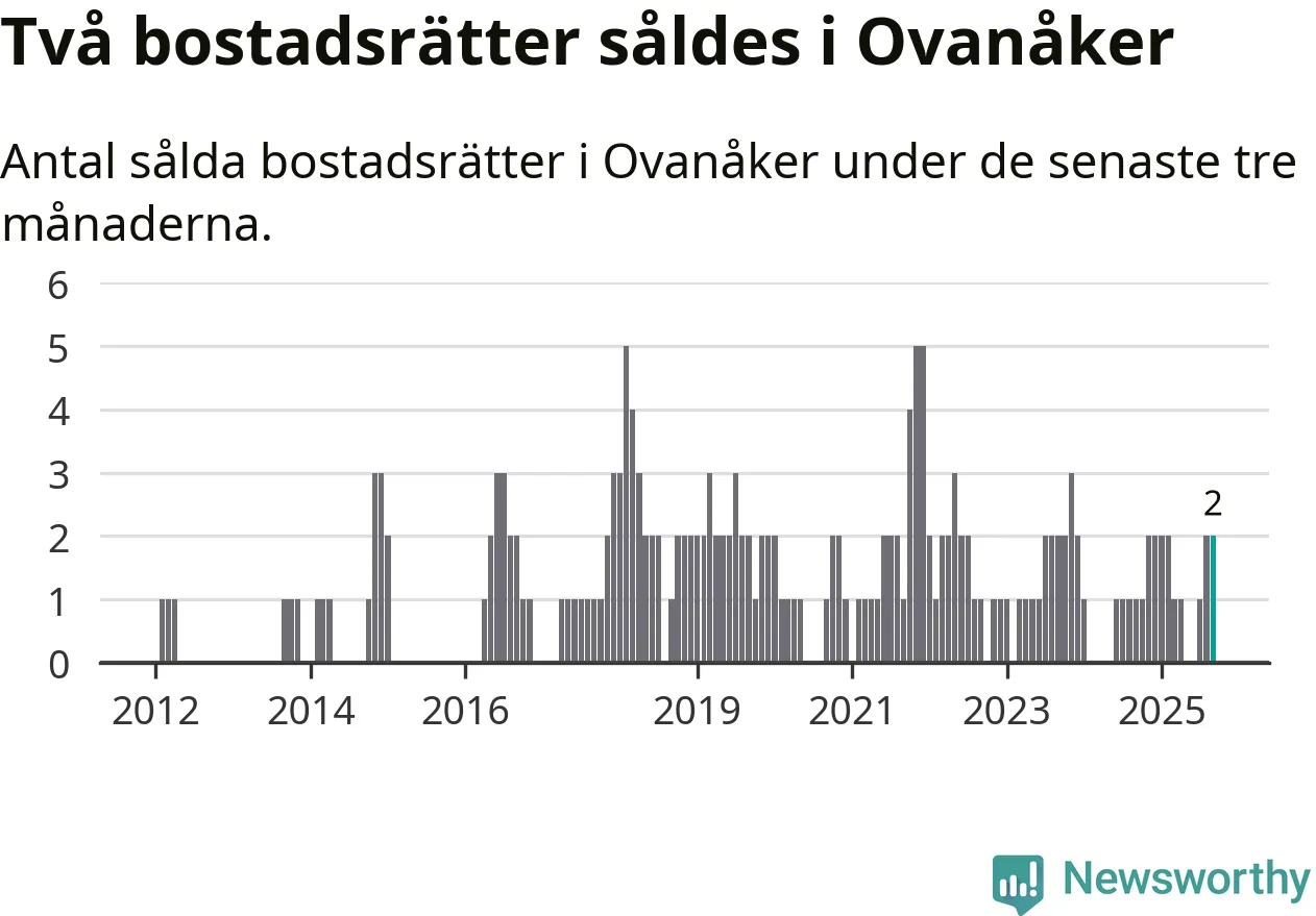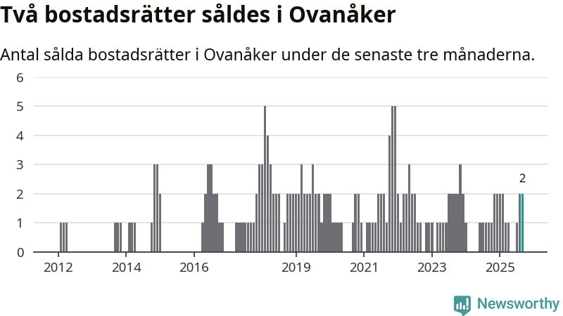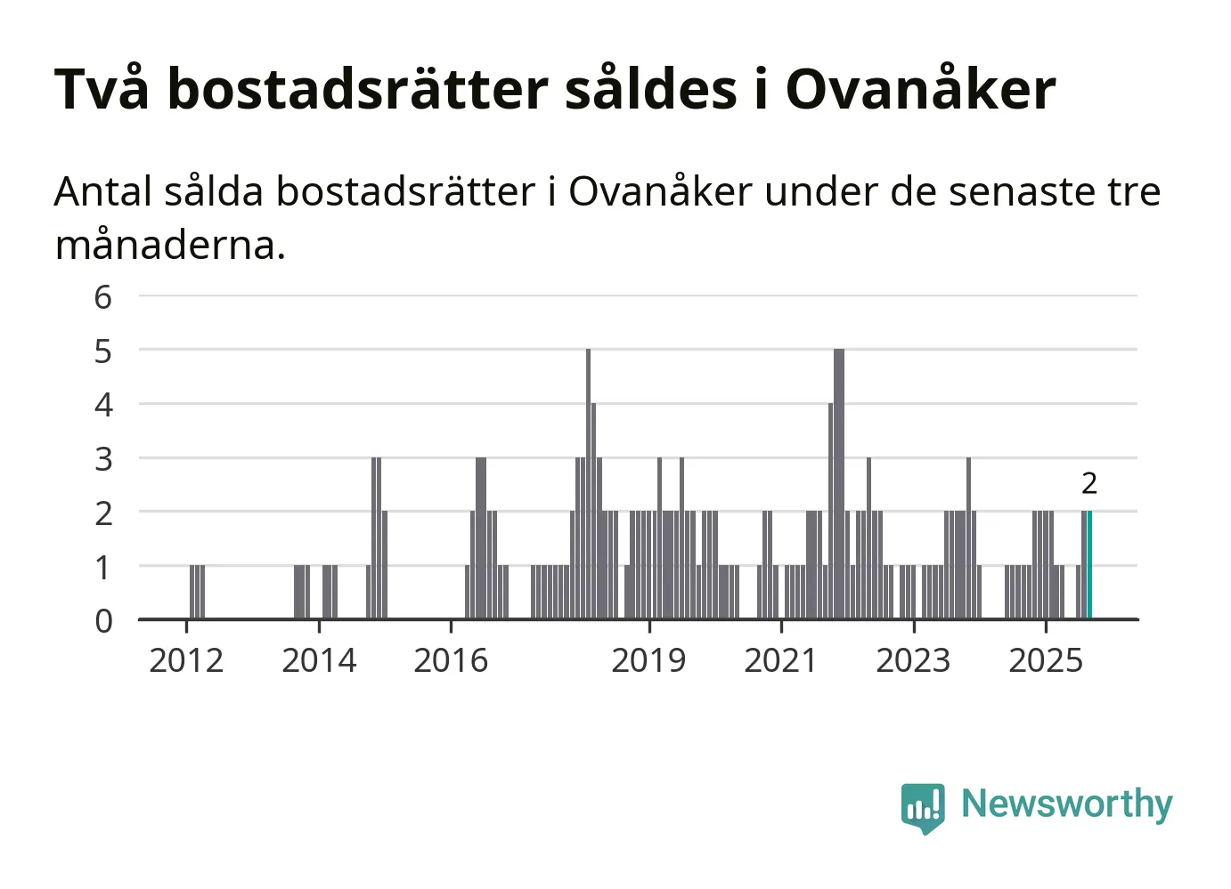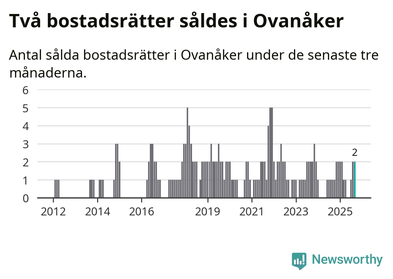 Mellan juli och september gjordes sammanlagt två affärer med bostadsrätter i Ovanåkers kommun. Det kan jämföras med ett vid motsvarande tid i fjol.