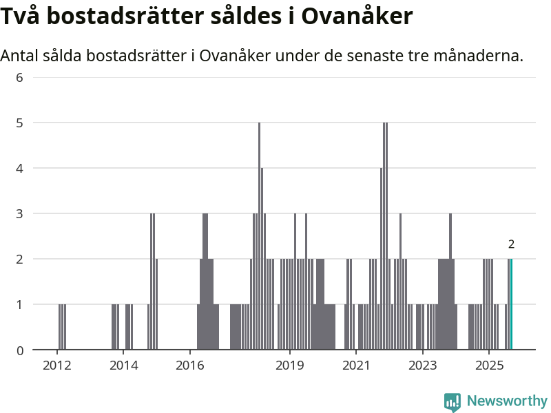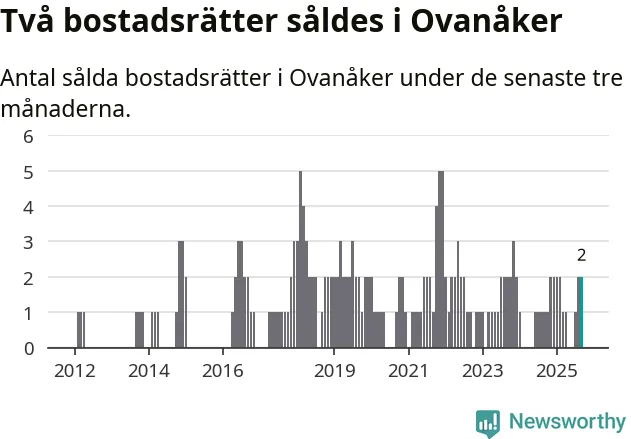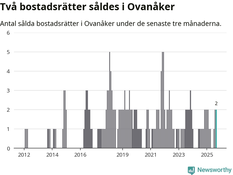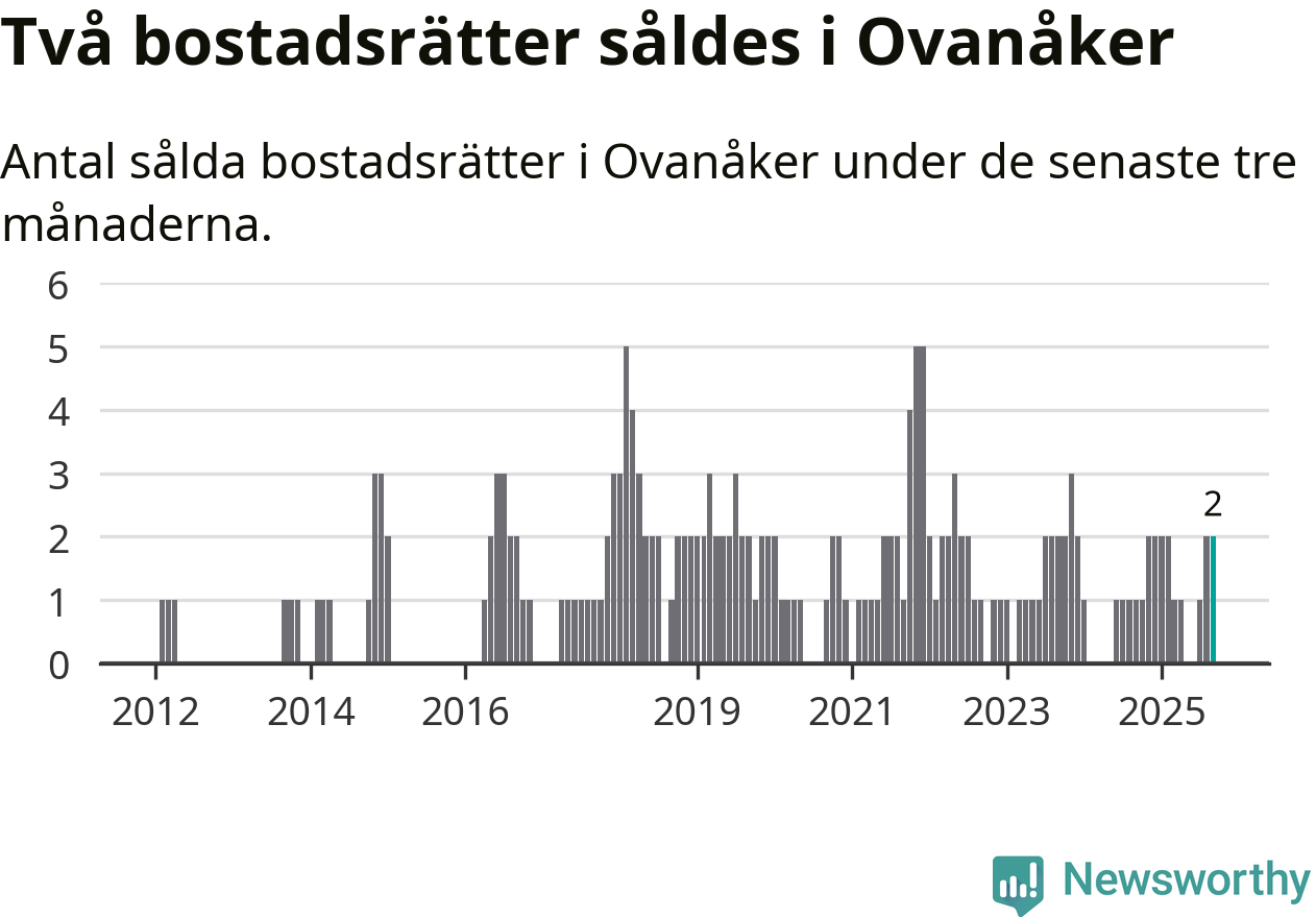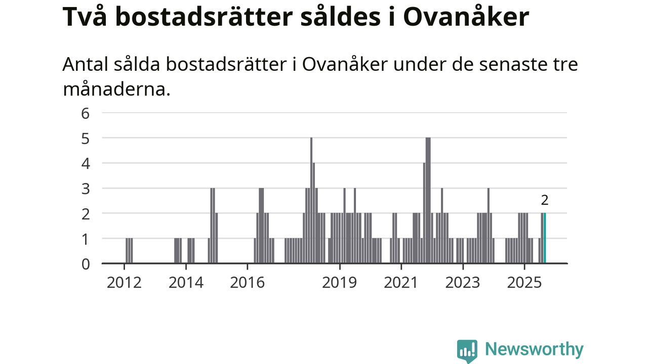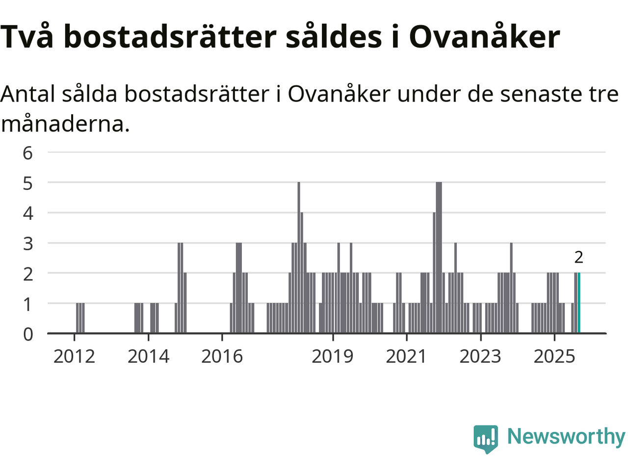 Mellan juli och september gjordes sammanlagt två affärer med bostadsrätter i Ovanåkers kommun. Det kan jämföras med ett vid motsvarande tid i fjol.
