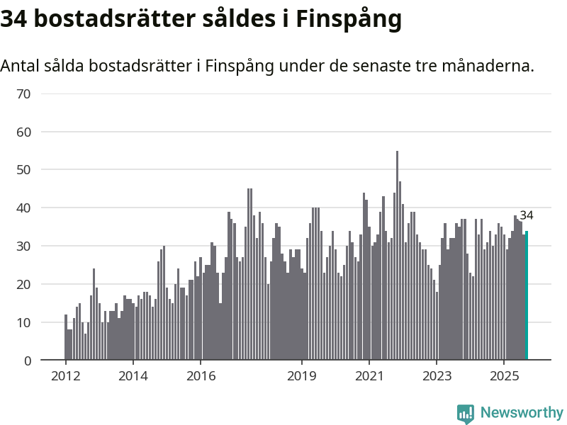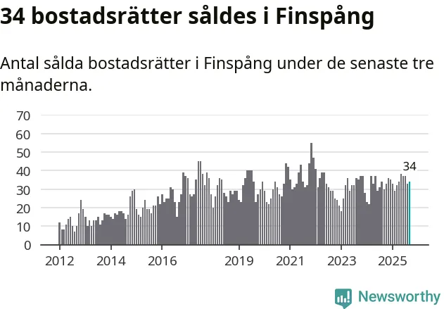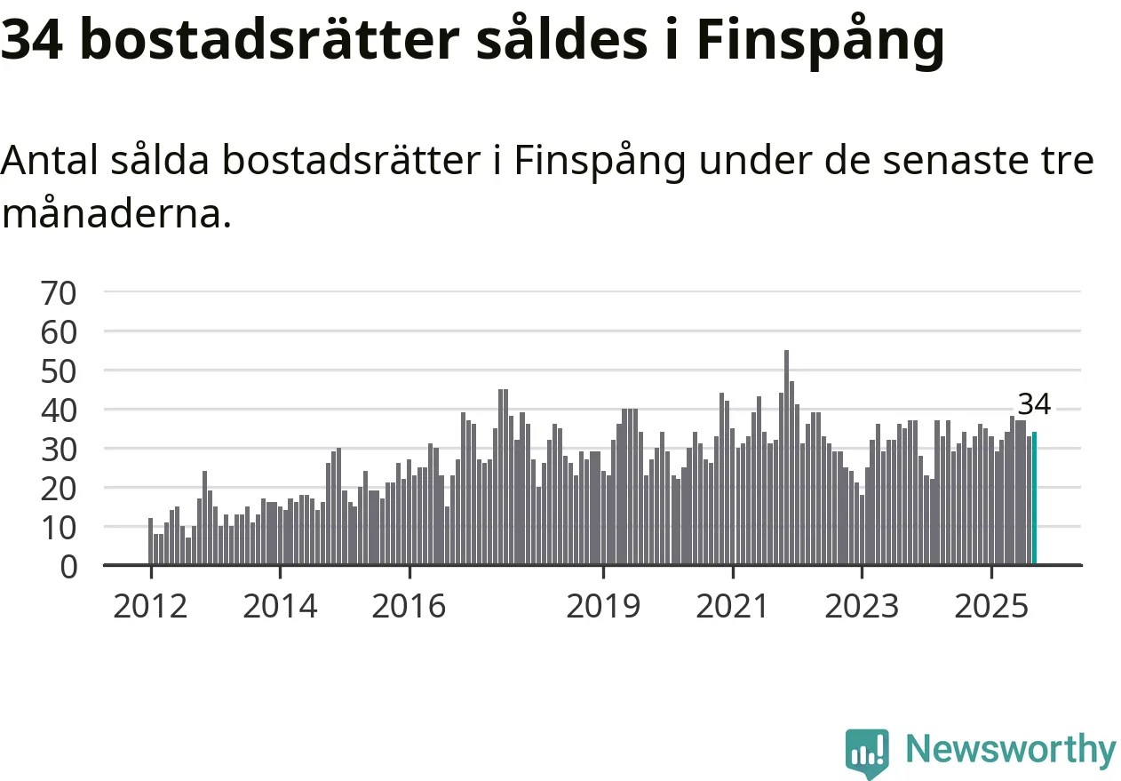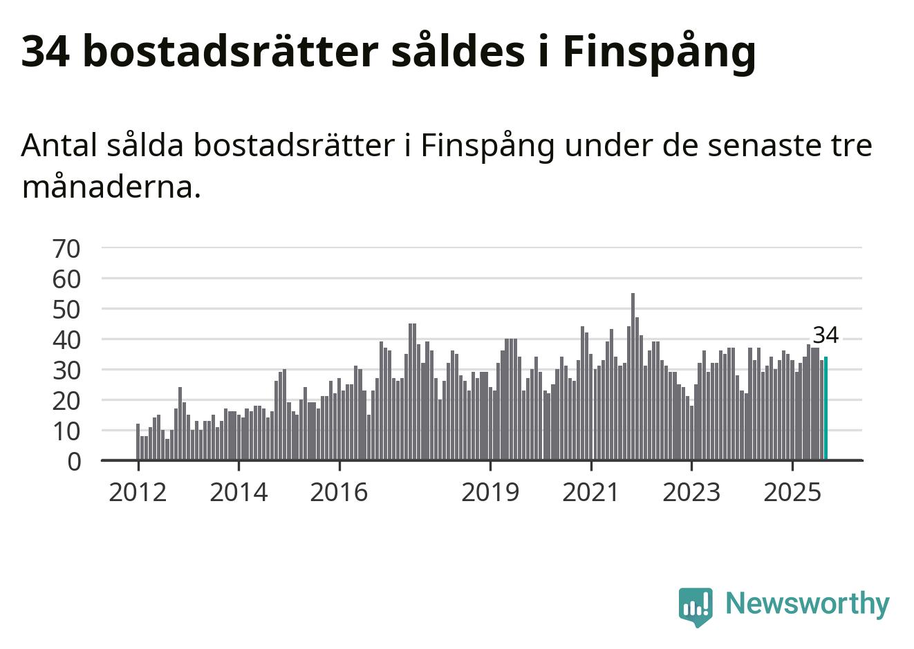 Sammanlagt såldes 34 bostadsrätter i Finspångs kommun mellan juli och september till ett genomsnittligt pris på 0,7 miljoner kronor. I fjol gjordes 30 affärer vid den här tiden på året.
