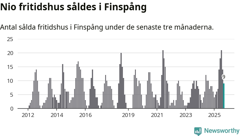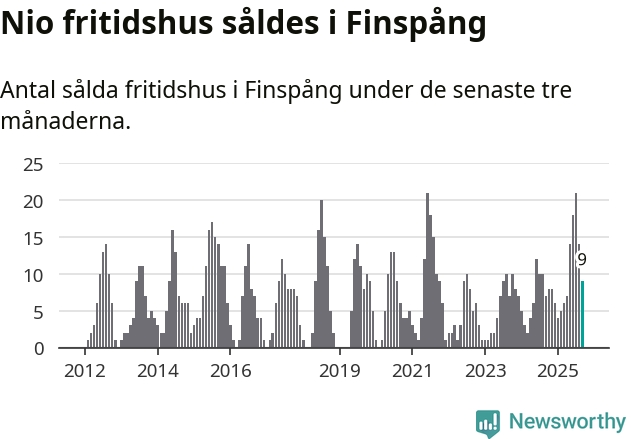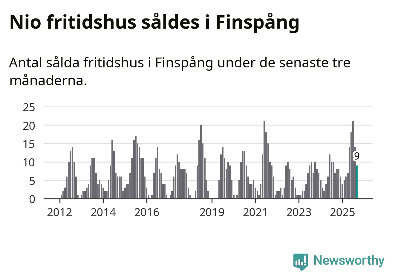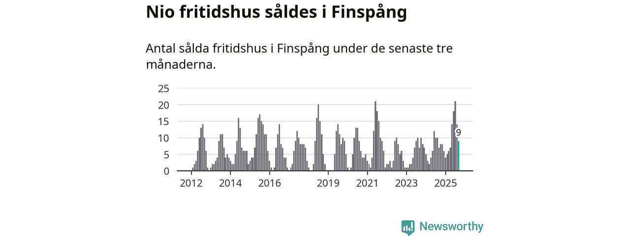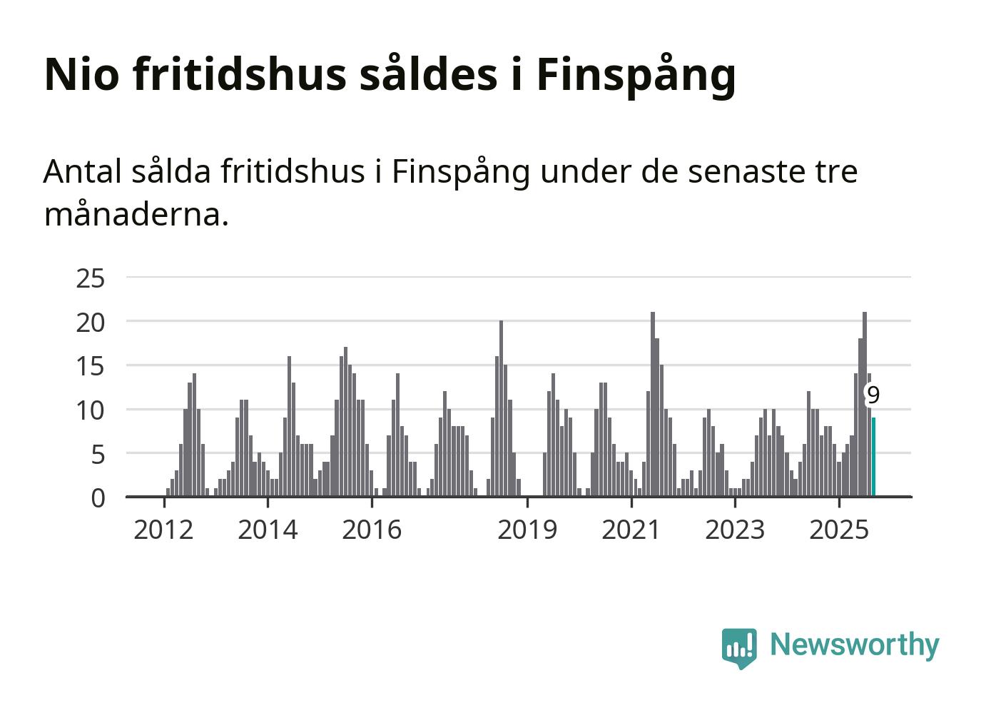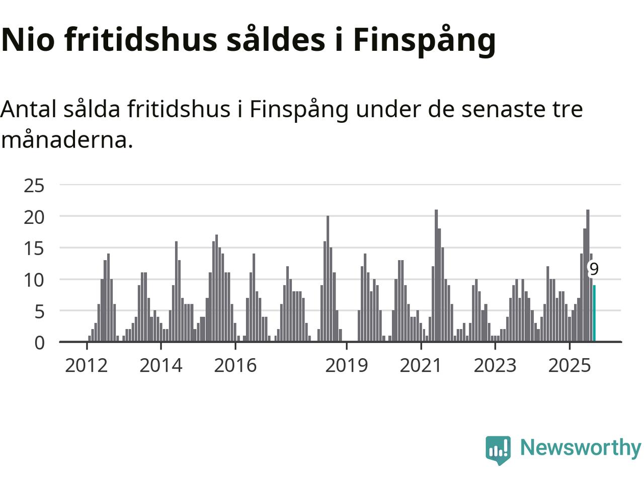 Mellan juli och september gjordes sammanlagt nio affärer med fritidshus i Finspångs kommun. Det kan jämföras med sju vid motsvarande tid i fjol.