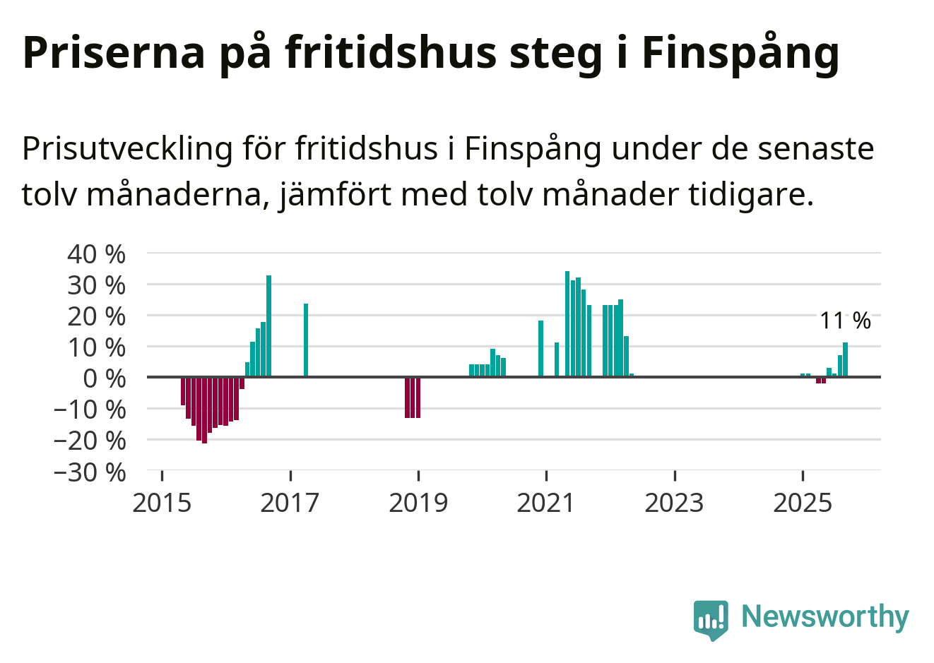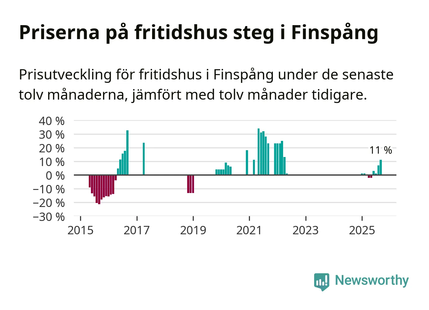 Statistiken visar även på en stor prisuppgång i Finspångs kommun. Medelpriset på försäljningarna av fritidshus i kommunen var 11 procent högre än för ett år sedan. I hela Östergötland däremot ligger priserna på fritidshus stilla.