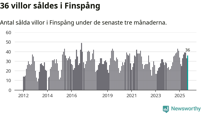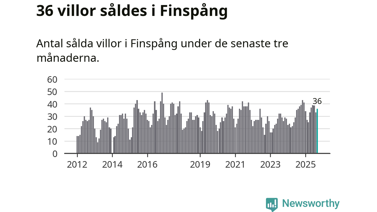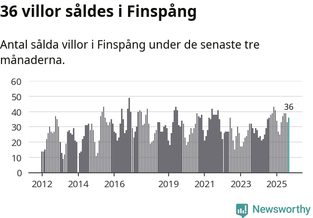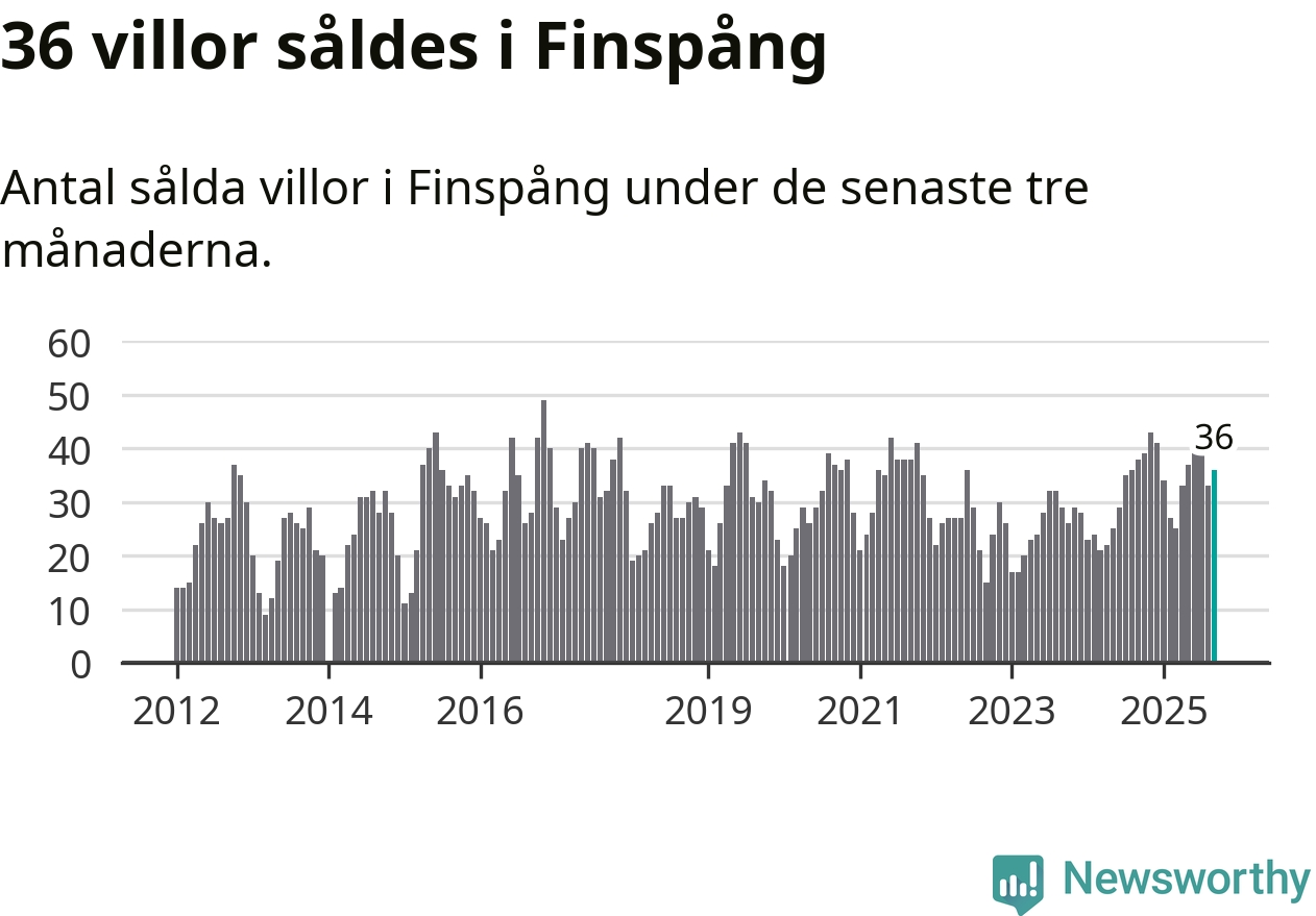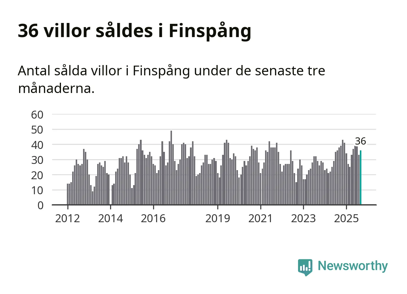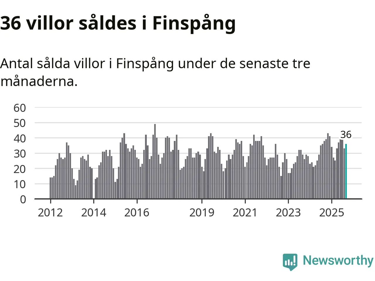 Mellan juli och september gjordes sammanlagt 36 affärer med villor i Finspångs kommun. Det kan jämföras med 38 vid motsvarande tid i fjol.