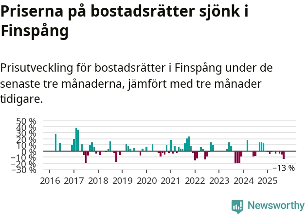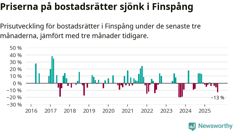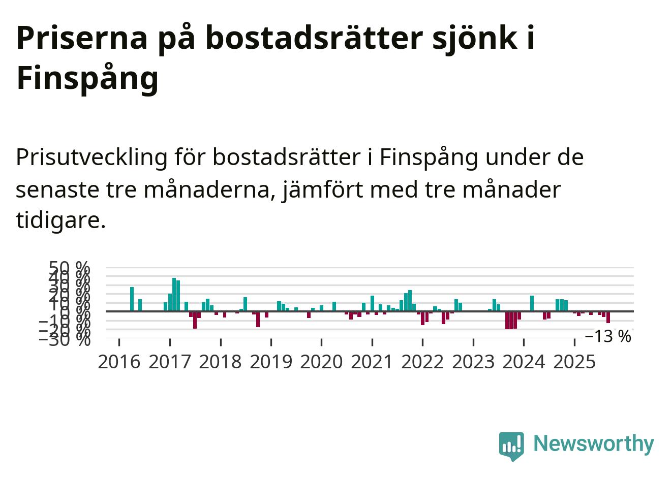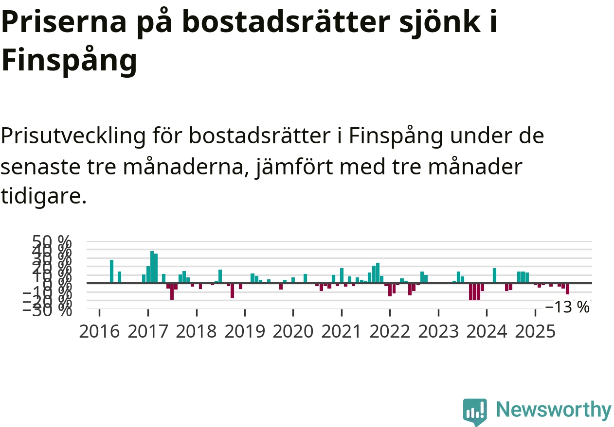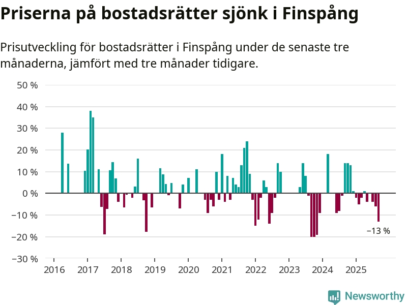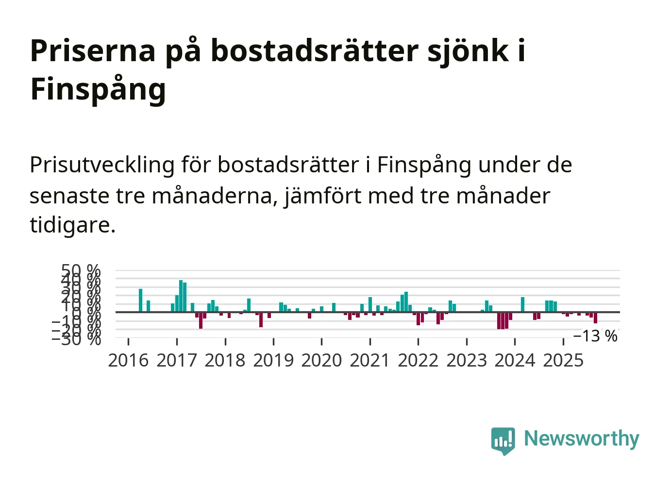 Priserna på bostadsrätter har gått ner i Finspångs kommun. Medelpriset på försäljningarna under de senaste tre månaderna visar på en nedgång med 13 procent.
