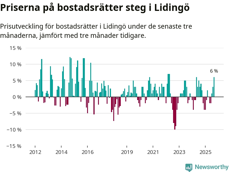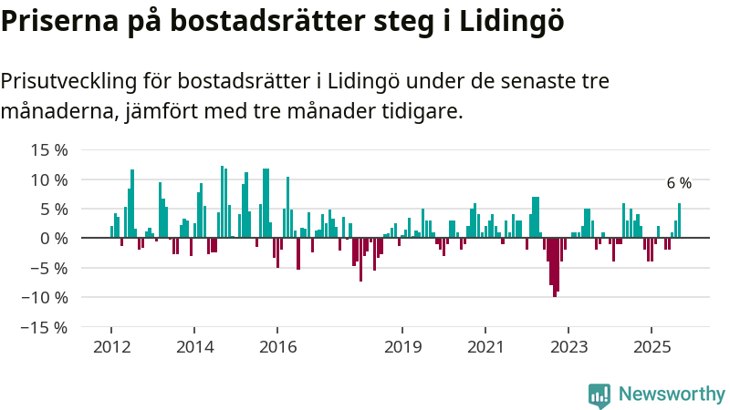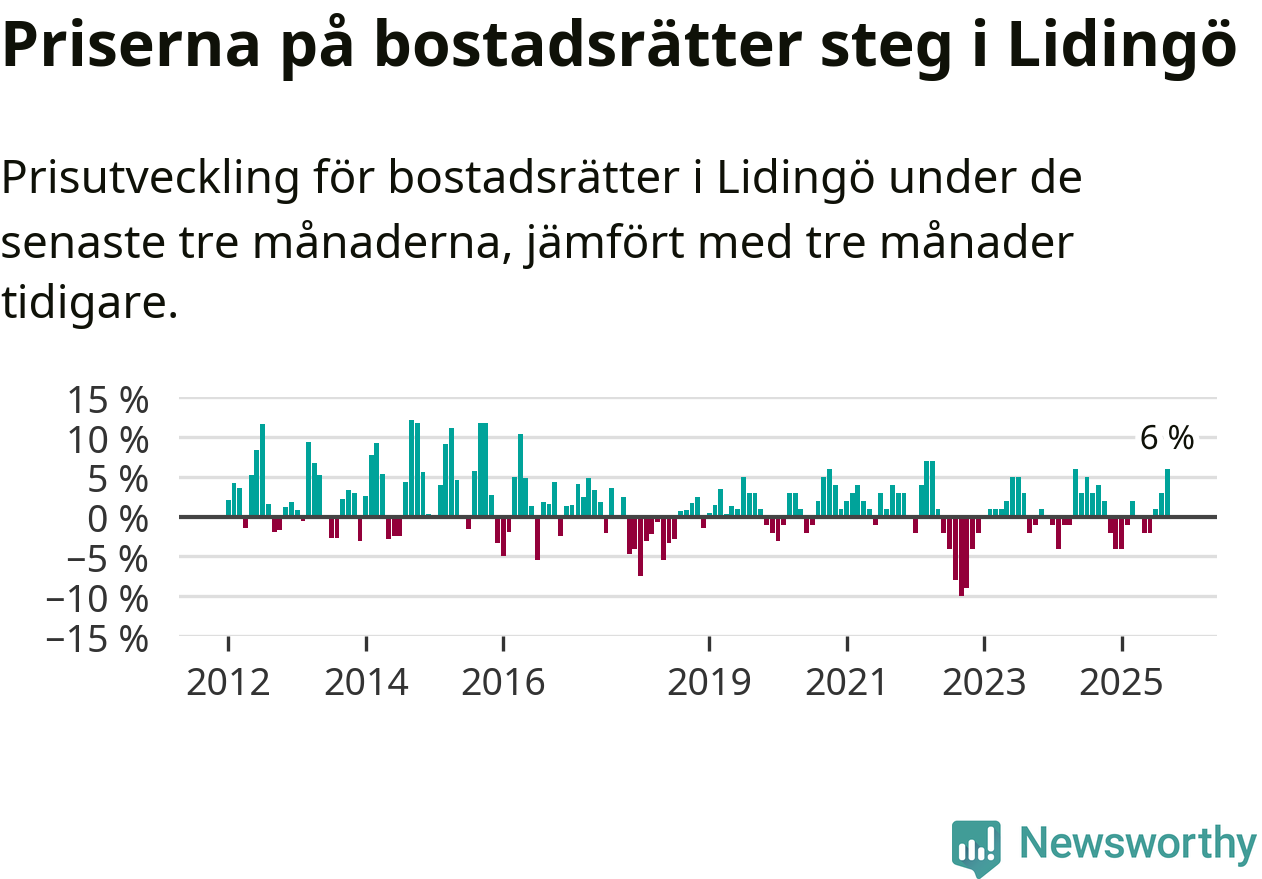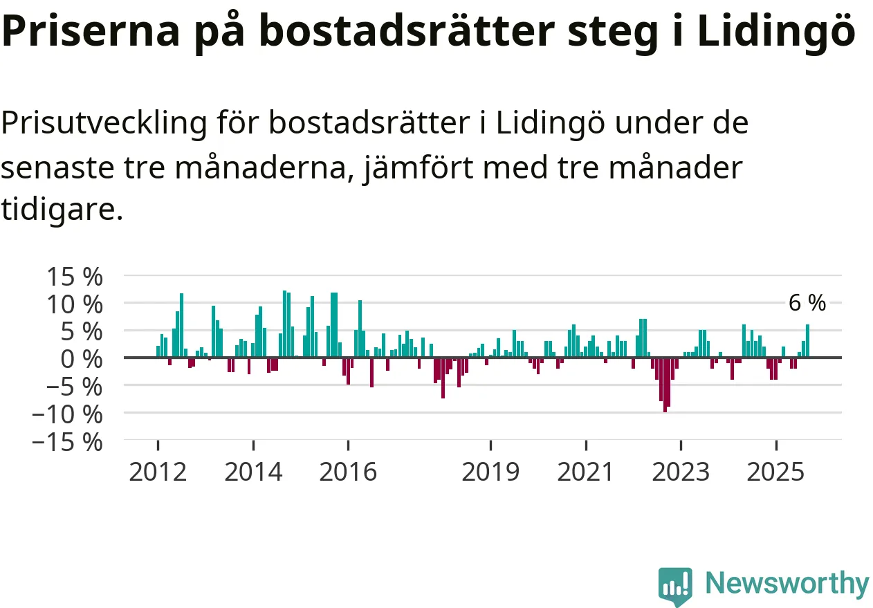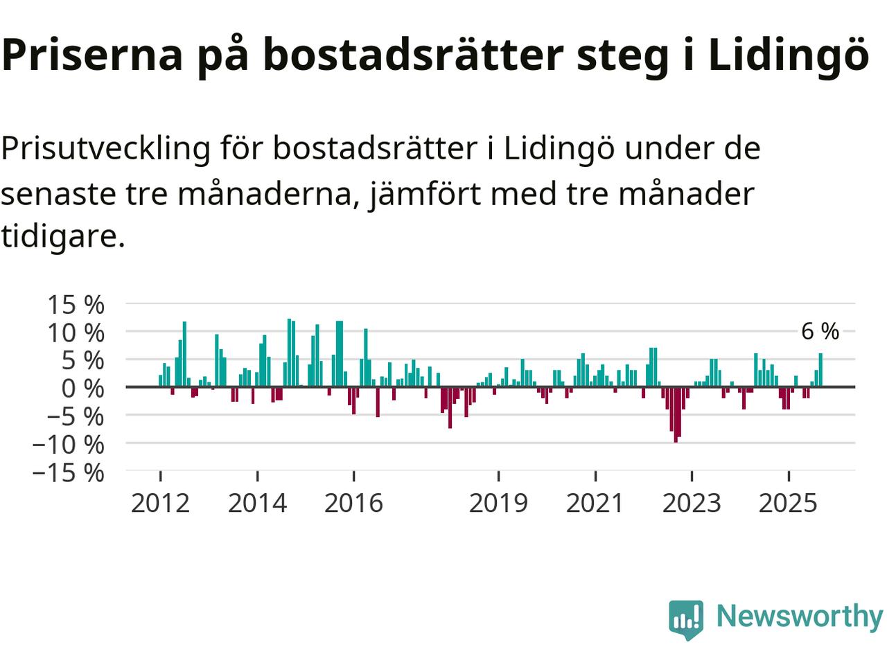 Priserna på bostadsrätter steg mellan juli och september med 6 procent i Lidingö kommun. Det är en betydande uppgång jämfört med det gångna året då priserna i snitt stått stilla.